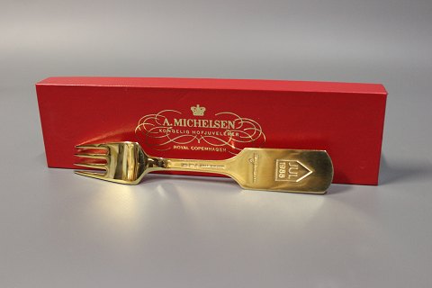 SolgtJulegaffel af A. Michelsen fra 1988, forgyldt sterling sølv 925 s. Gaflen er med motivet "Byen" og designet af Knud Erik Færgemann.