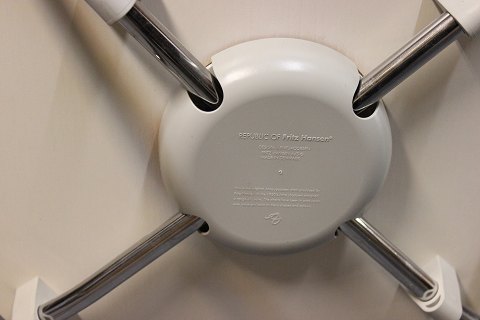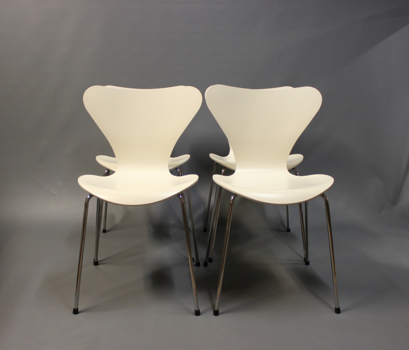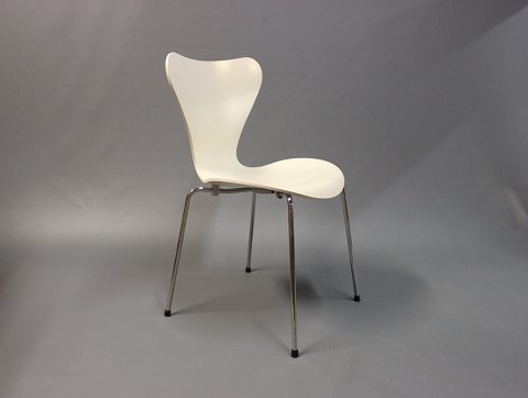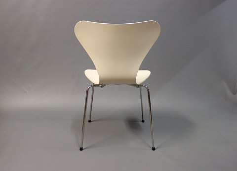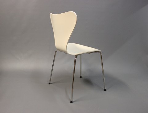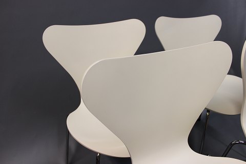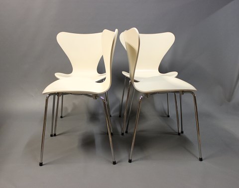 4 creme farvede syver stole, model 3107, i god stand. Stolene er designet af Arne Jacobsen i 1950erne og produceret af Fritz Hansen i 2000erne. Stolene er hvid lakeret og med stel af forkromet stål.