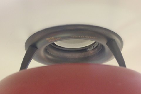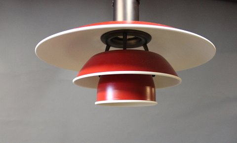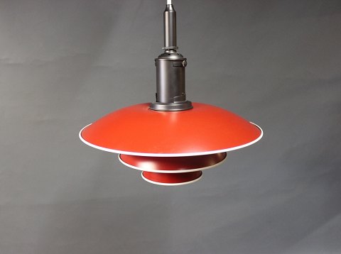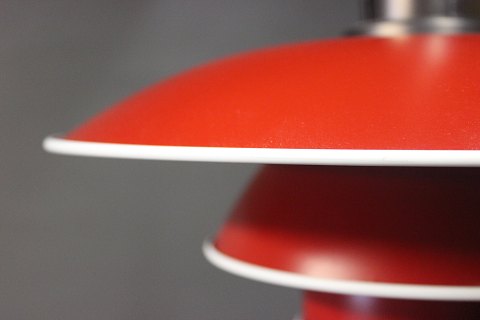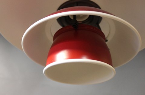 SoldPH3½-3 pendant with red lacquered metal Shades with a White edge and mounting in copper. The pendant was launched in occasion of Poul Henningsen's 120th birthday. The pendant is designed from Poul Henningsen's designs from the early 1920s - late 30s and manufactured by Louis Poulsen.