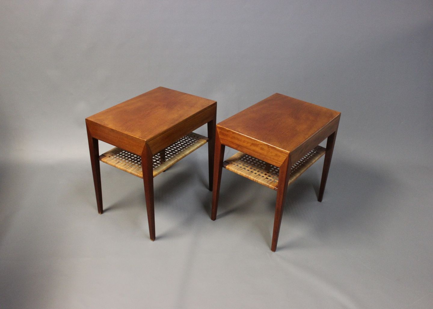 SolgtEt par sideborde designet af Severin Hansen for Haslev møbelfabrik i 1960erne. Bordene er i mahogni med flet nedenunder.