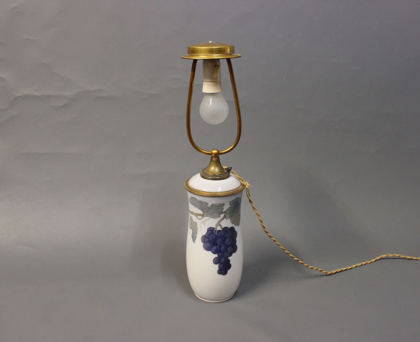 Royal Copenhagen tablelamp in porcelain and brass, no.: 587/67, decorated with clusters of grapes.