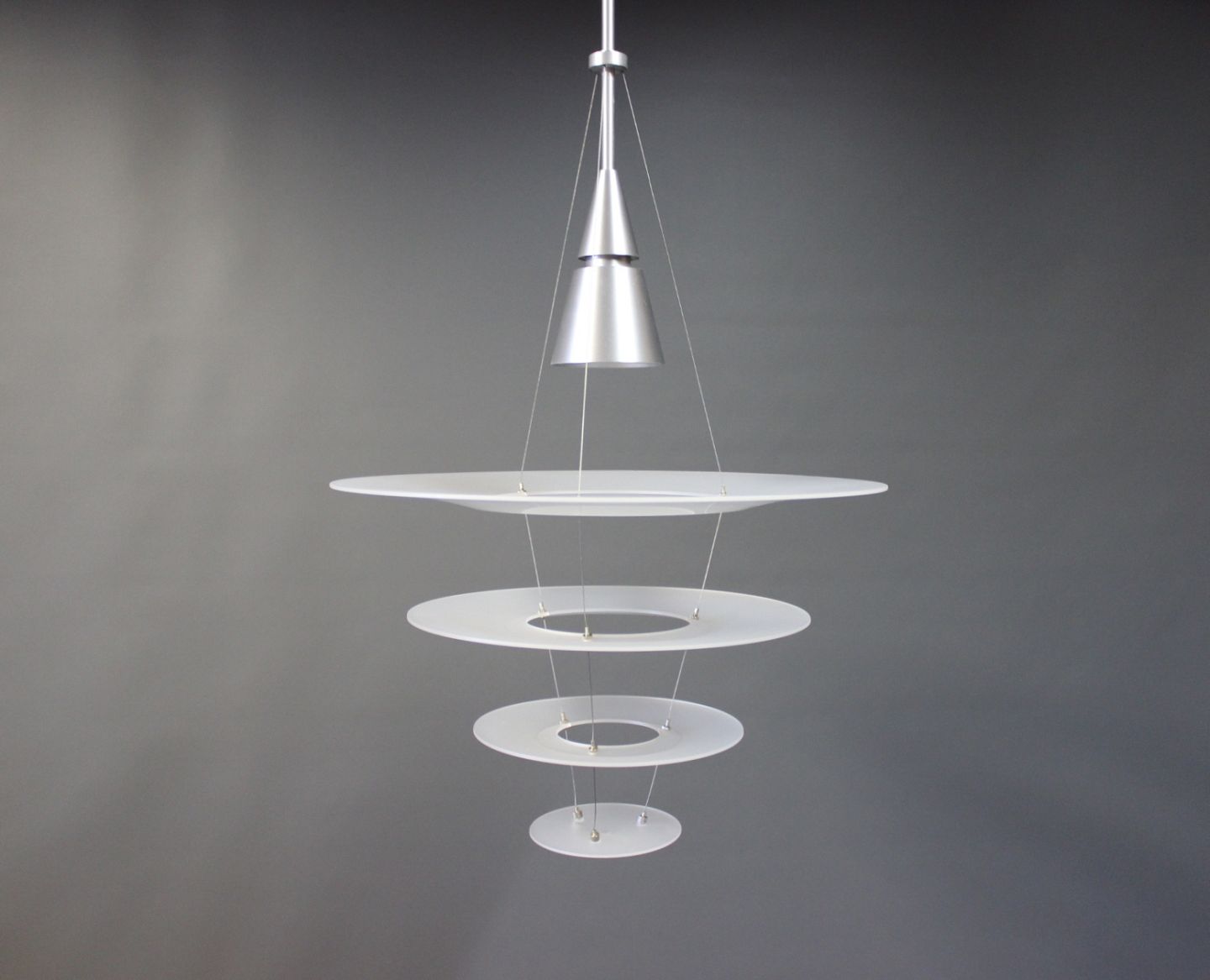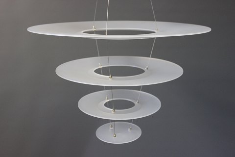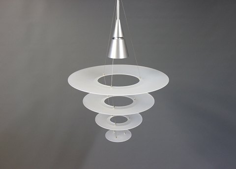SoldEnigma 425 pendant designed by Shoichi Uchiyama and manufactured by Louis Poulsen. The pendant is in brushed aluminum and matted acrylic.