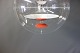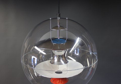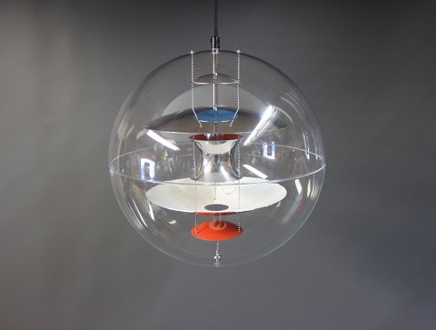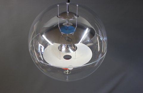 SolgtVerner Panton Globe designet i 1969. Lampen er af transparent akryl med 5 ned hængte metal reflektorer, som er lakeret i hvid, rød og blå.