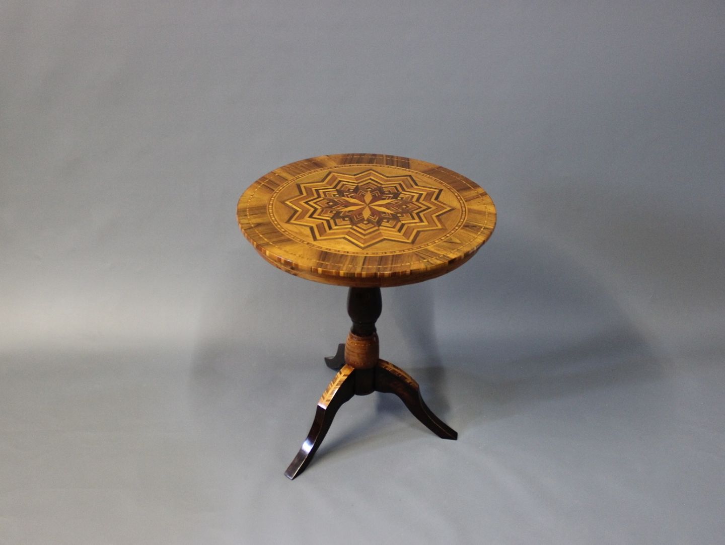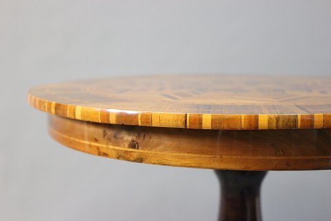 The table is in walnut with intarsia of fruitwood. It has been hand polished.