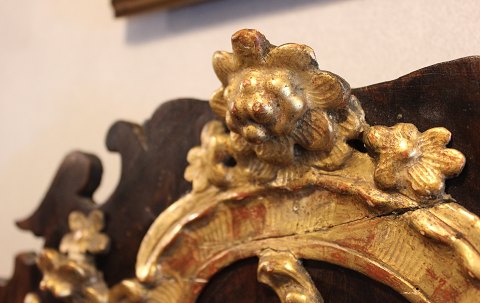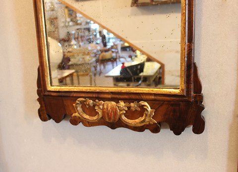SolgtSpejl i Rokoko stil og nøddetræ. Spejlet er fra ca. 1740, Danmark og er i original stand.