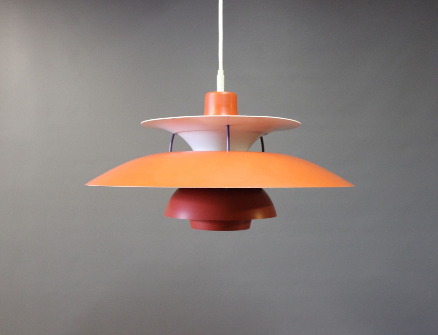 SoldPH5 pendant in a redish color designed by Poul Henningsen and manufactured by Louis Poulsen.