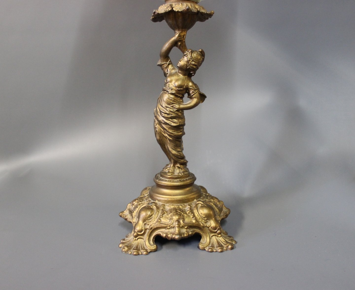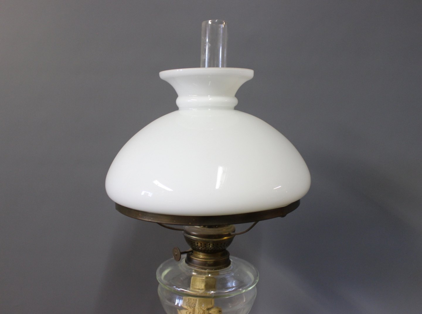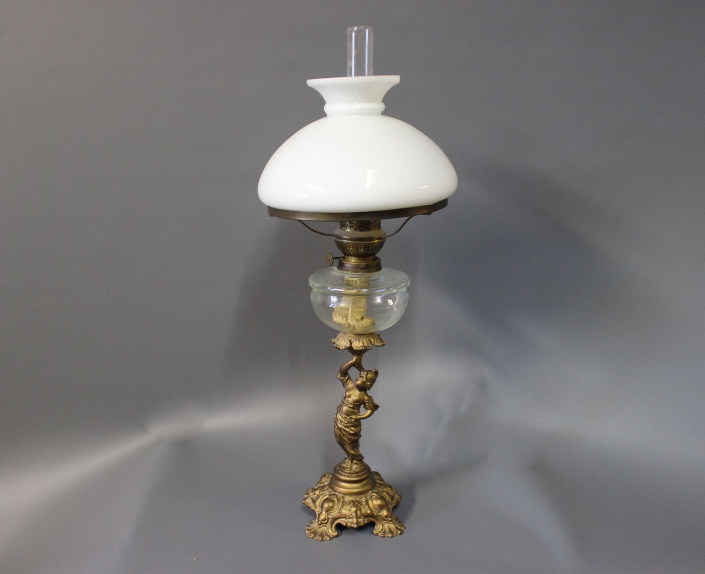 SolgtPetroleums bordlampe i messing med figur og hvid glas kuppel fra ca. år 1880.