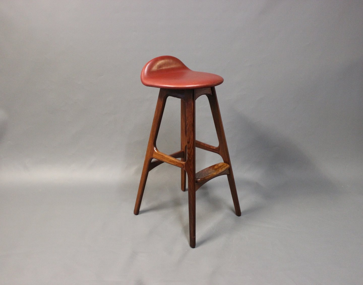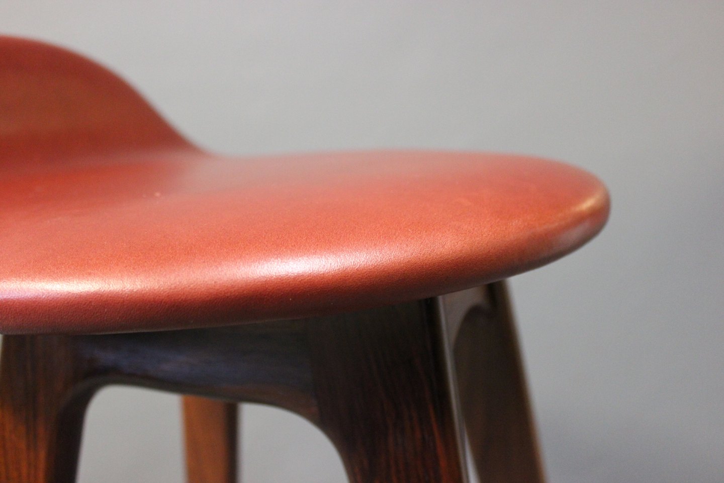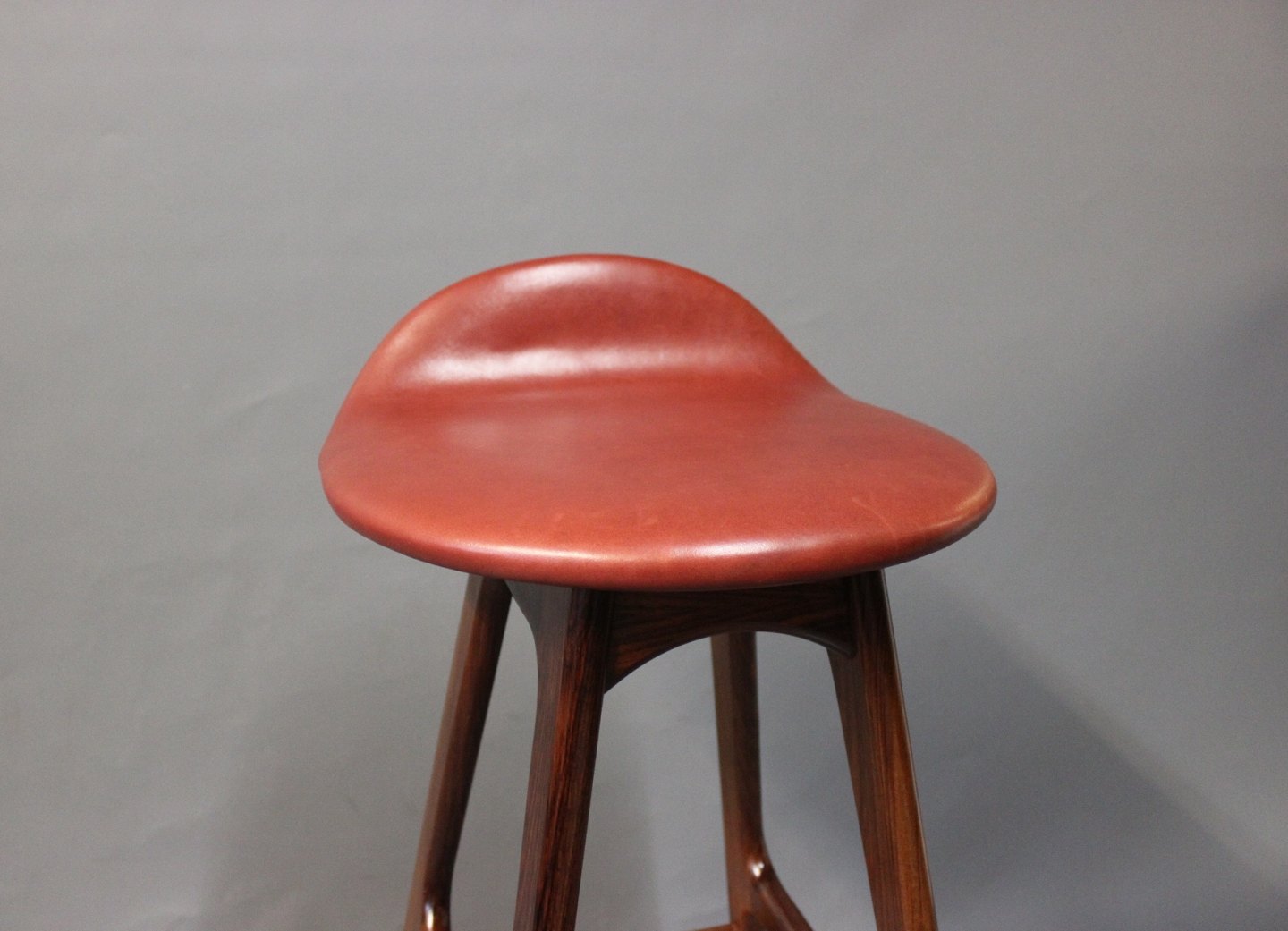 Bar stools, model OD61, designed by Erik Buch and manufactured by Odense furniture factory. The stools are of rosewood and newly upholstered seats of elegance leather.