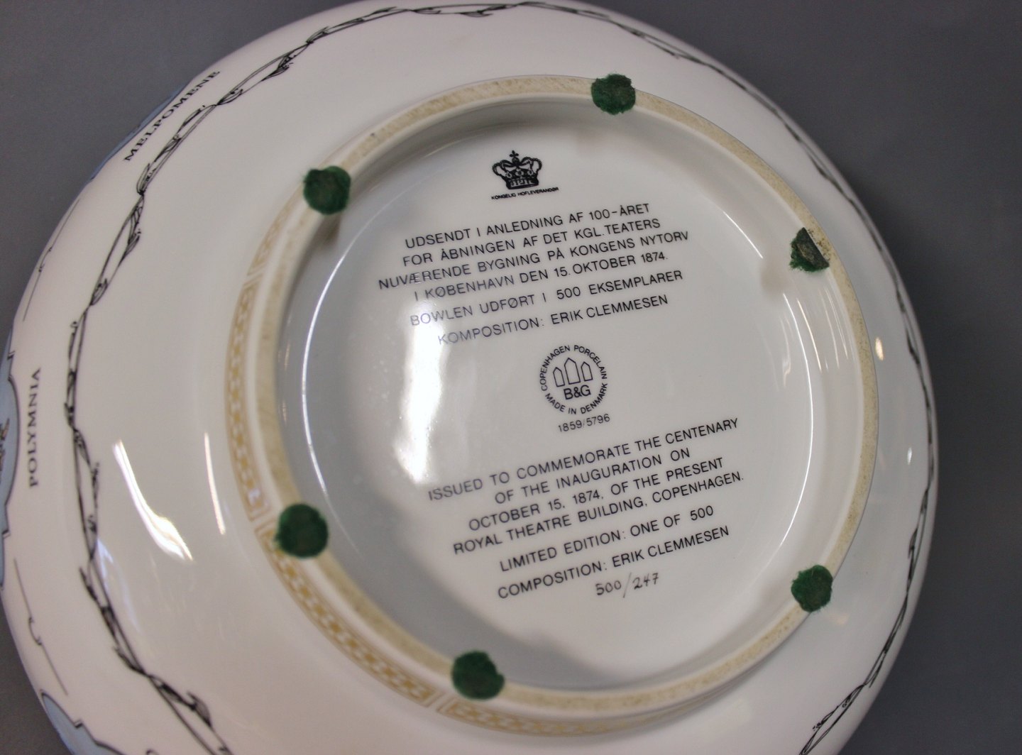 SoldB&G Theater bowl in the occasion of the opening of the The Royal Theater at "Kongens Nytov" the 15th of Oct. 1874. The bowl has been made in 500 pieces, this one is no. 247. Composition by Erik Clemmesen.