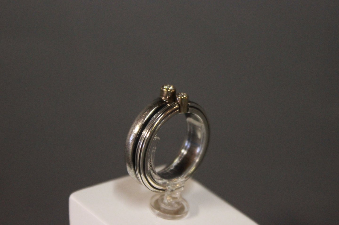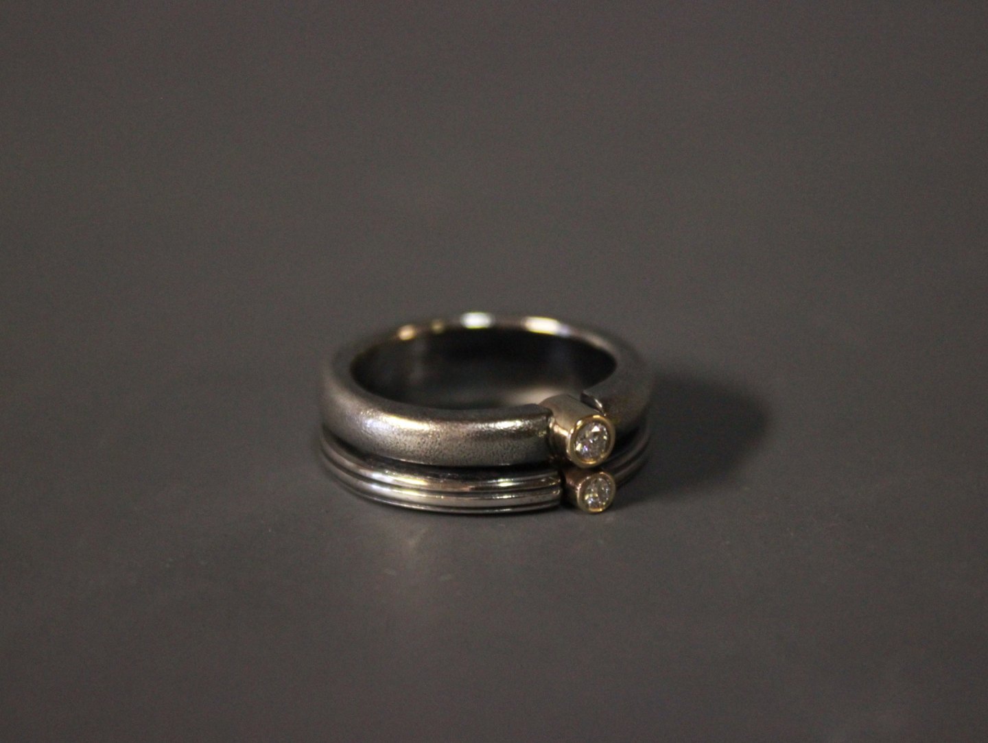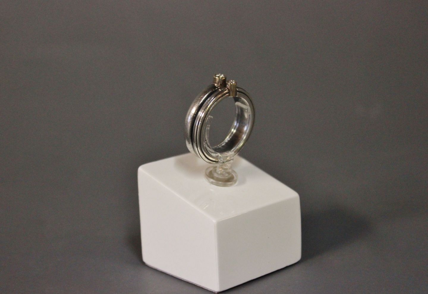 Silverring in 925 sterling with 2 small diamonds in gold mountings, stamped ALE.