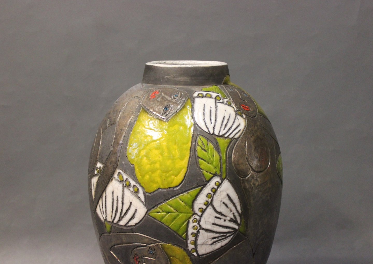 SolgtStor keramik gulvvase i flotte farver med kvindemotiver af Dorthe Friis.