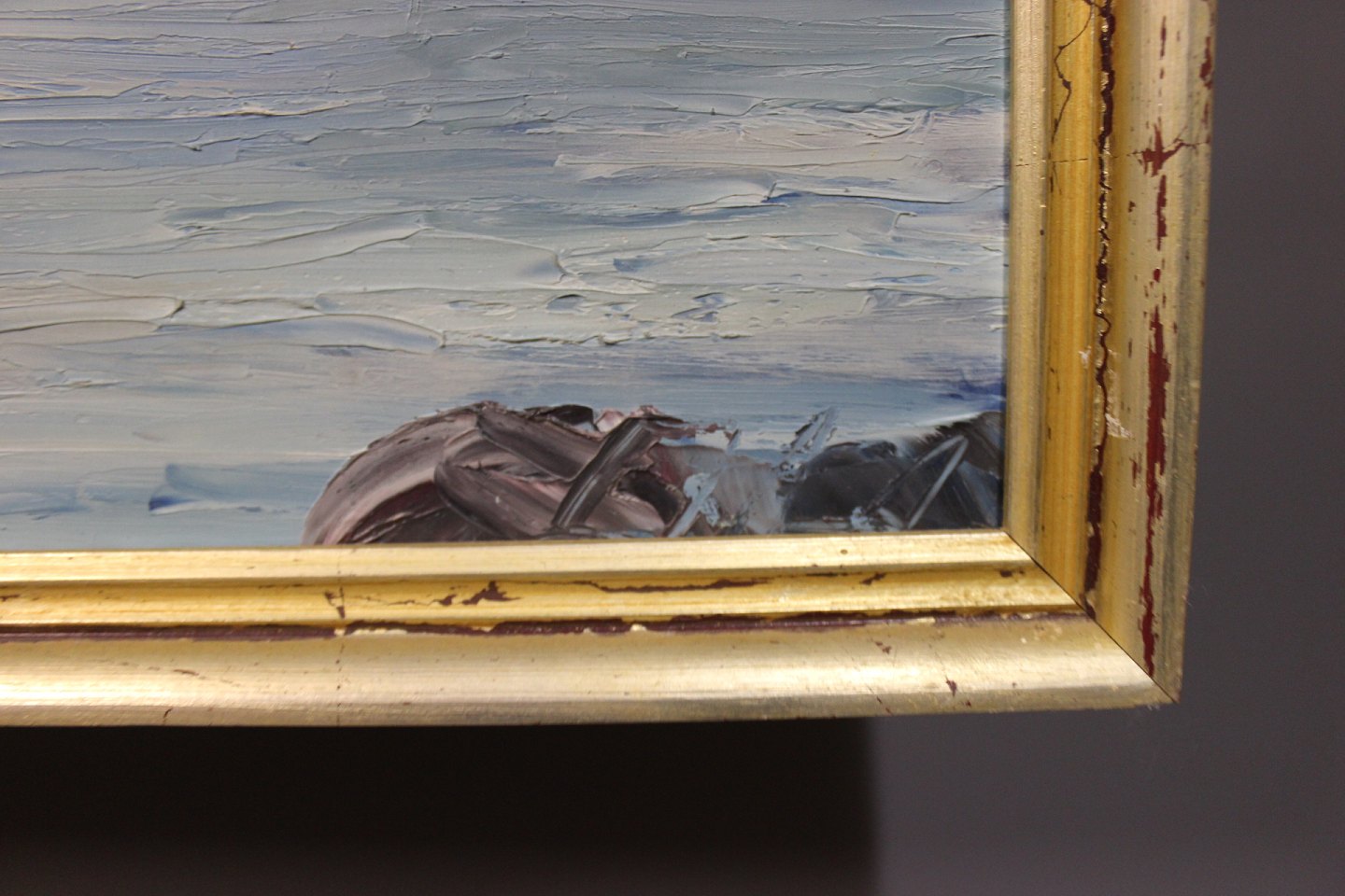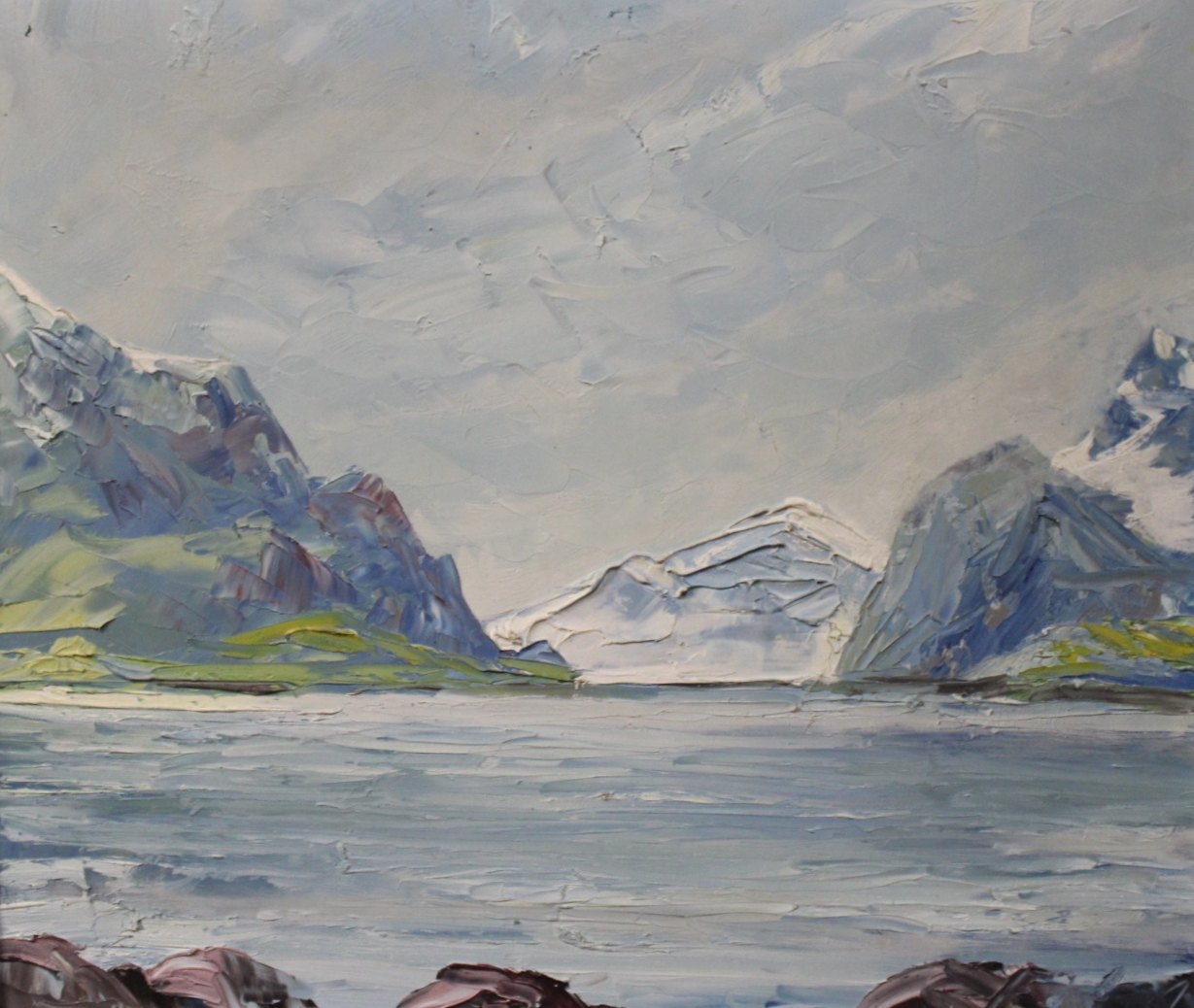 Maleri på lærred med motiv af bjerge og en sø af en ukendt kunster.