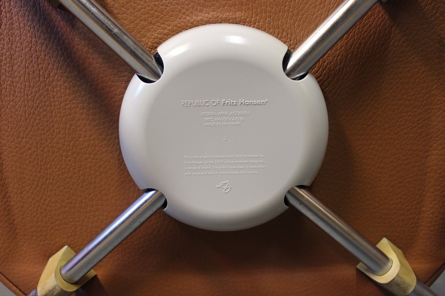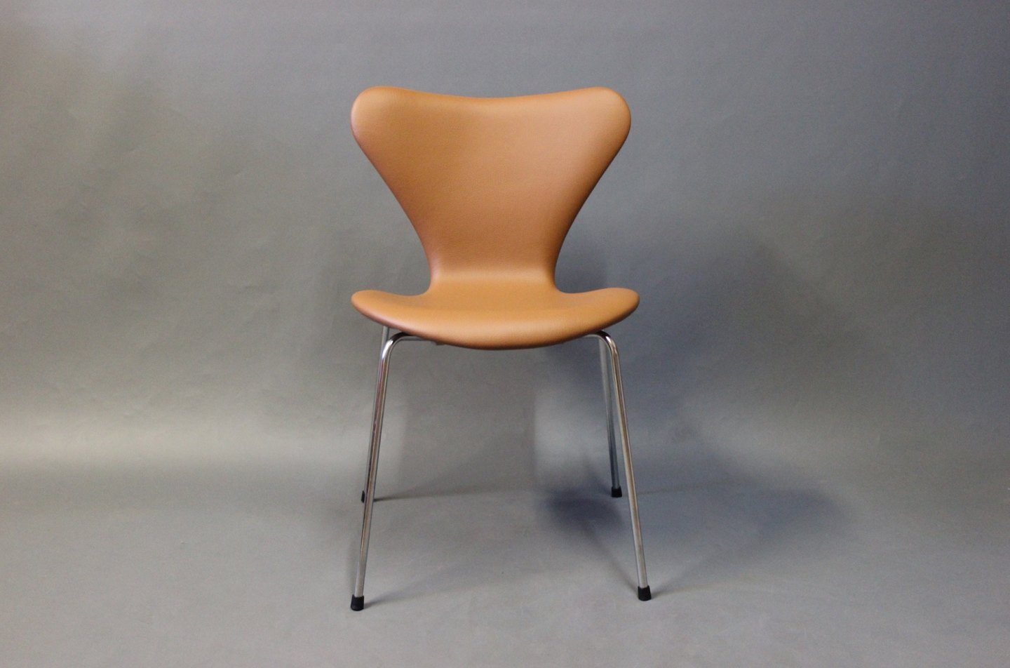 SoldA set of 6 Seven chairs, model 3107, designed by Arne Jacobsen and manufactured by Fritz Hansen. The chairs have recently been upholstered in Classic cognac colored leather.