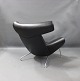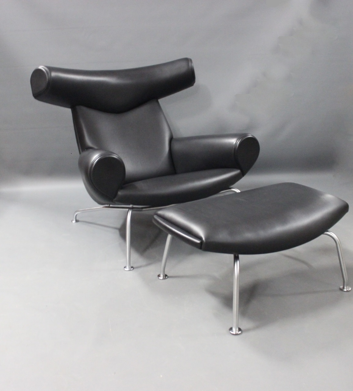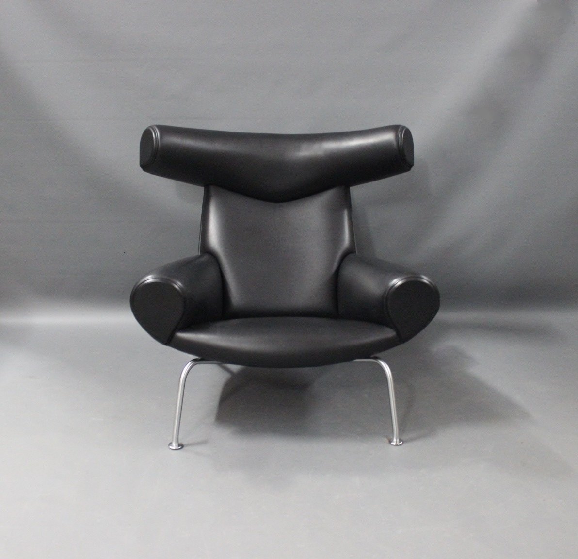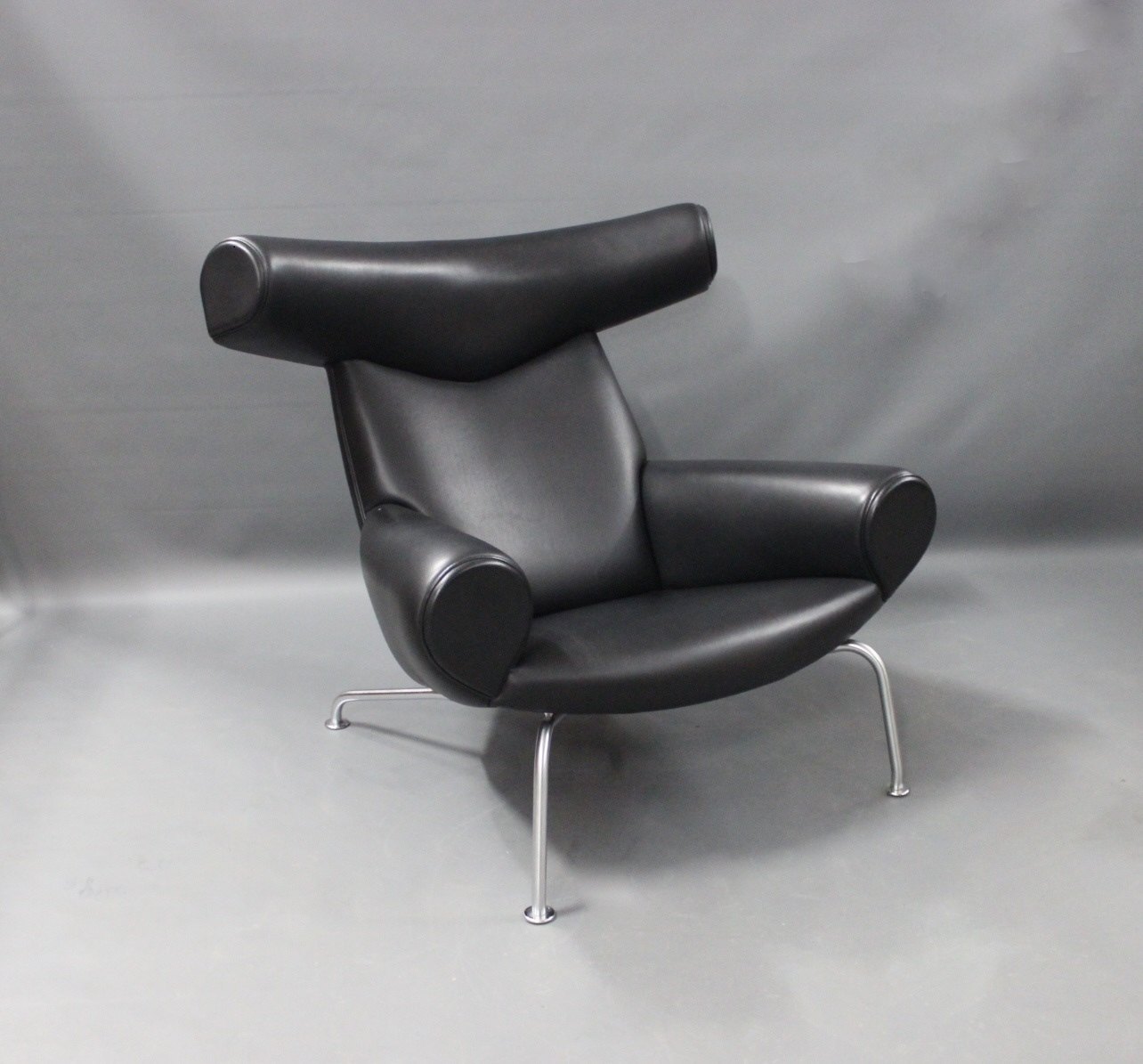 SolgtOx chair, model EJ 100 samt skammel model EJ 100-F, polstret i sort læder, designet af Hans J. Wegner i 1960erne og fremstillet hos Erik Jørgensen Møbelfabrik d. 20 Januar 2006.