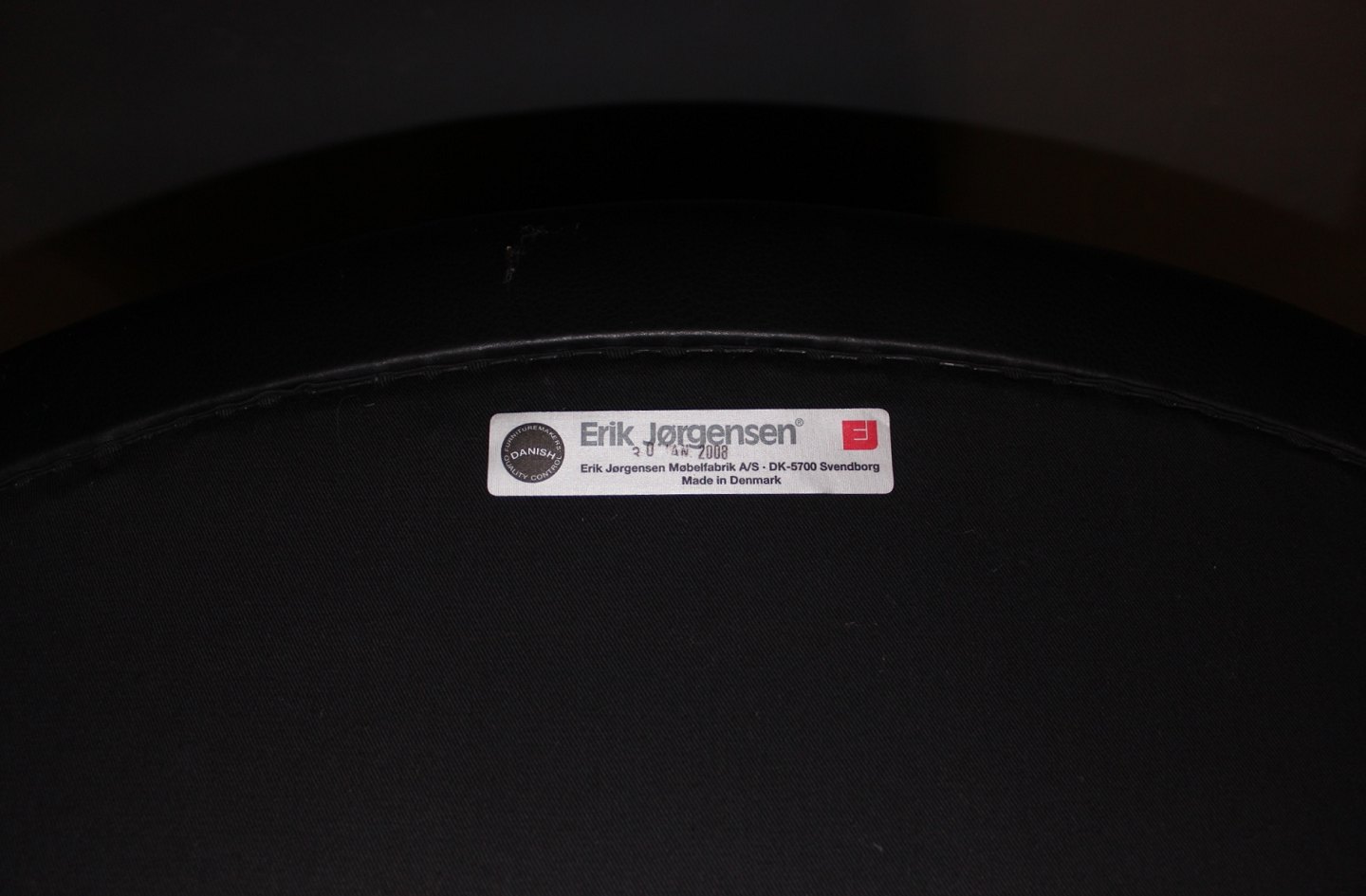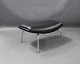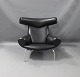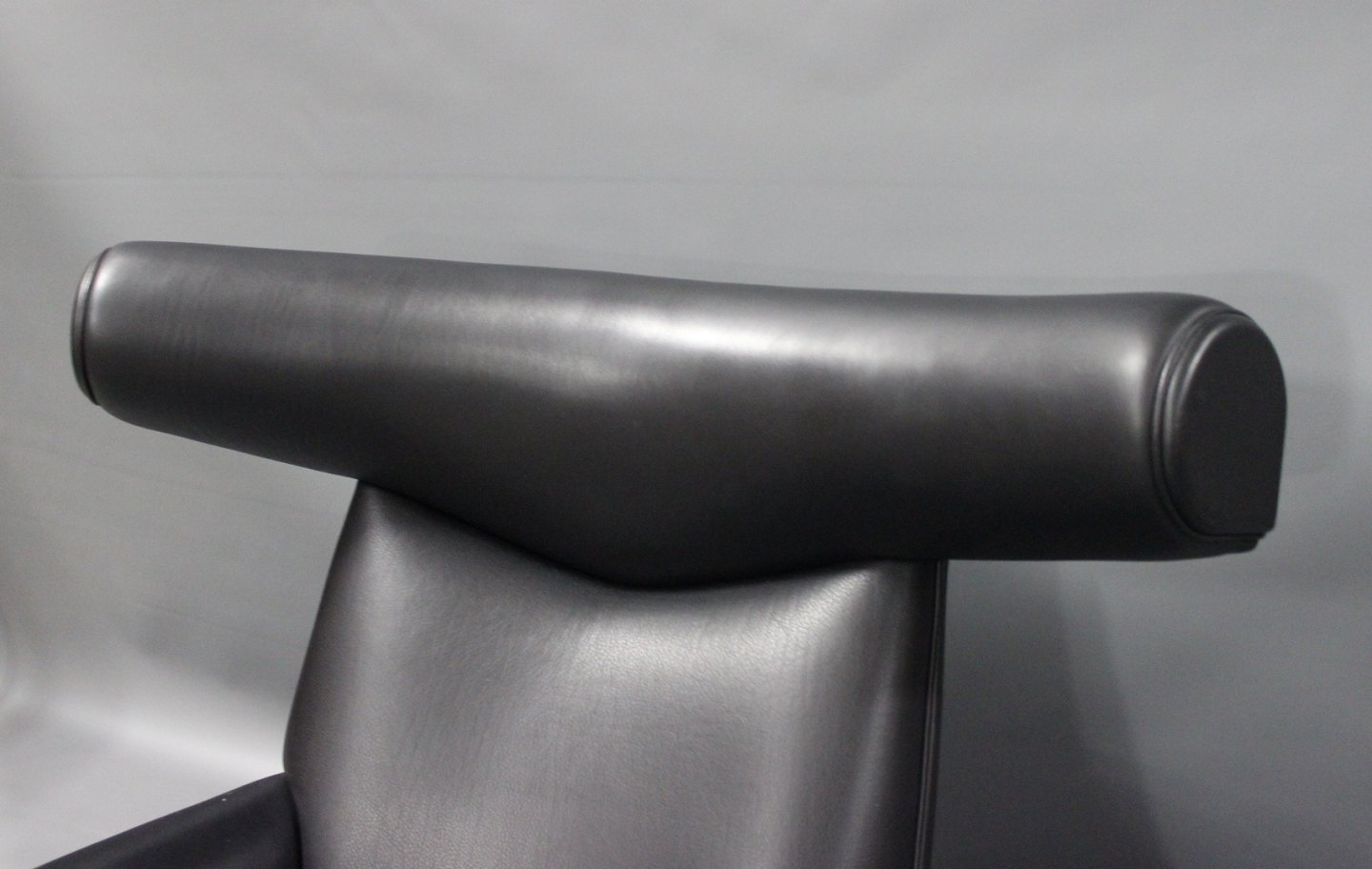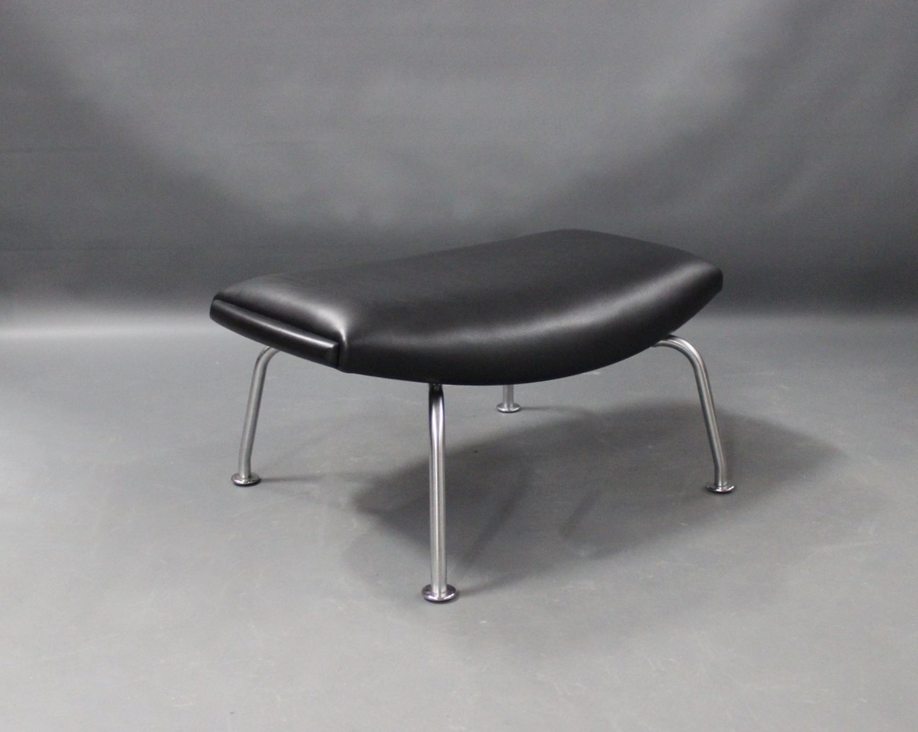 SolgtOx chair, model EJ 100 samt skammel model EJ 100-F, polstret i sort læder, designet af Hans J. Wegner i 1960erne og fremstillet hos Erik Jørgensen Møbelfabrik d. 20 Januar 2006.