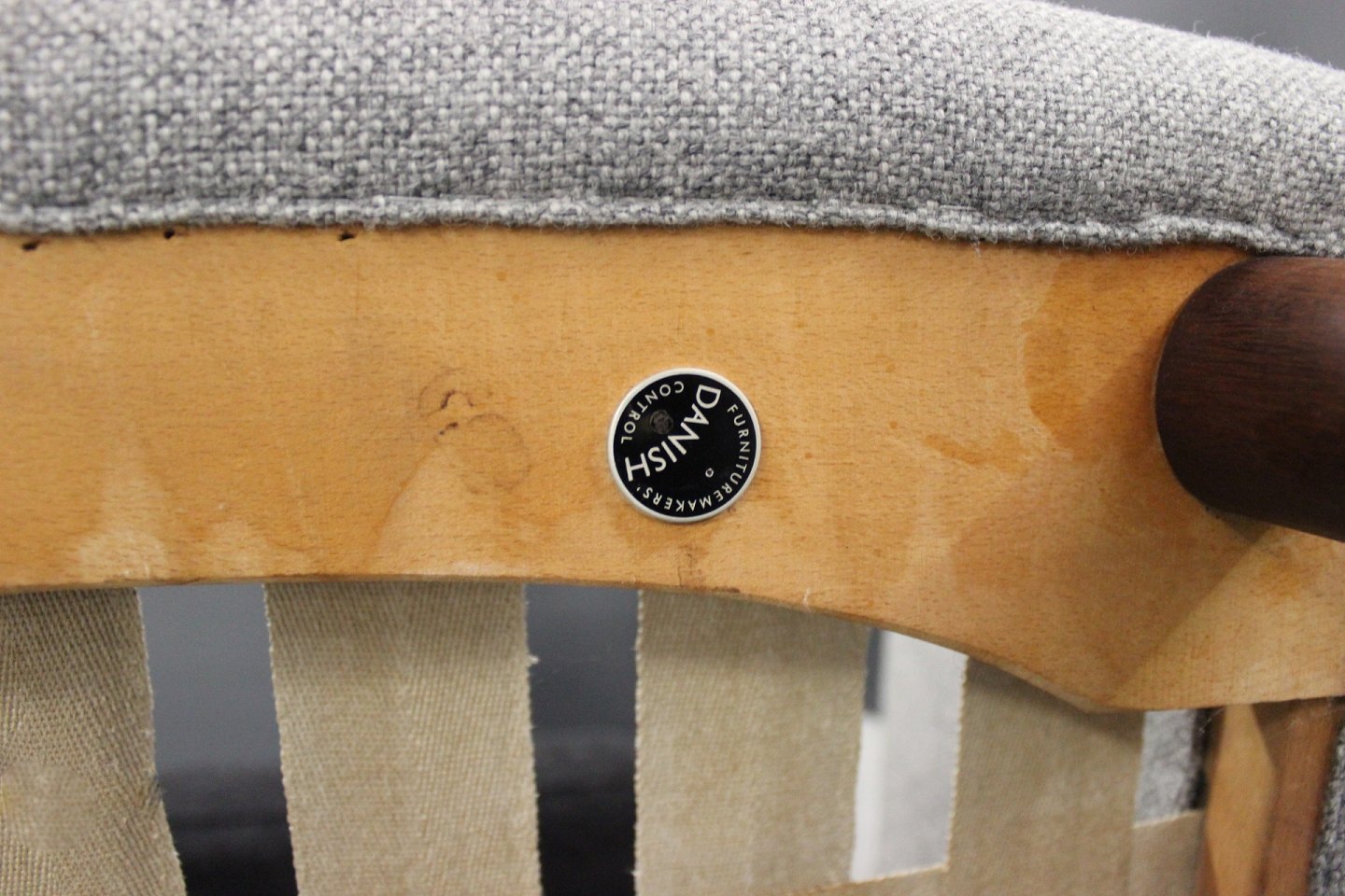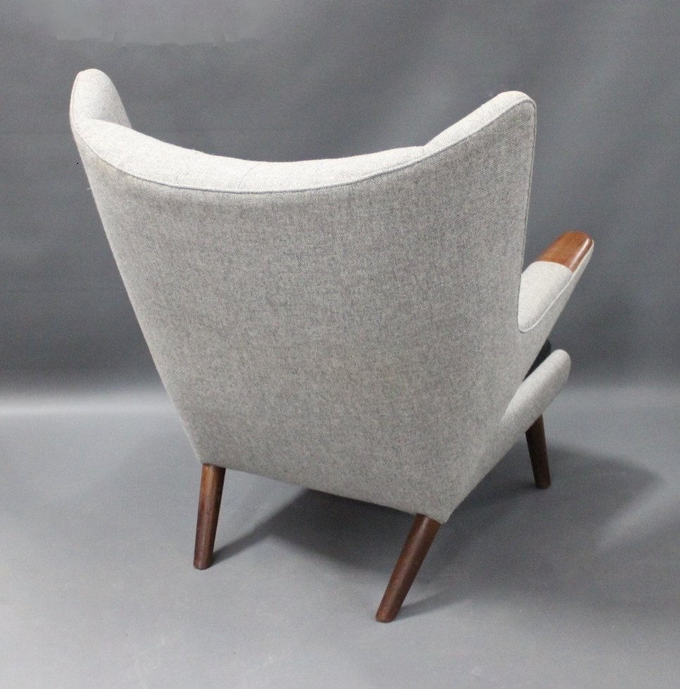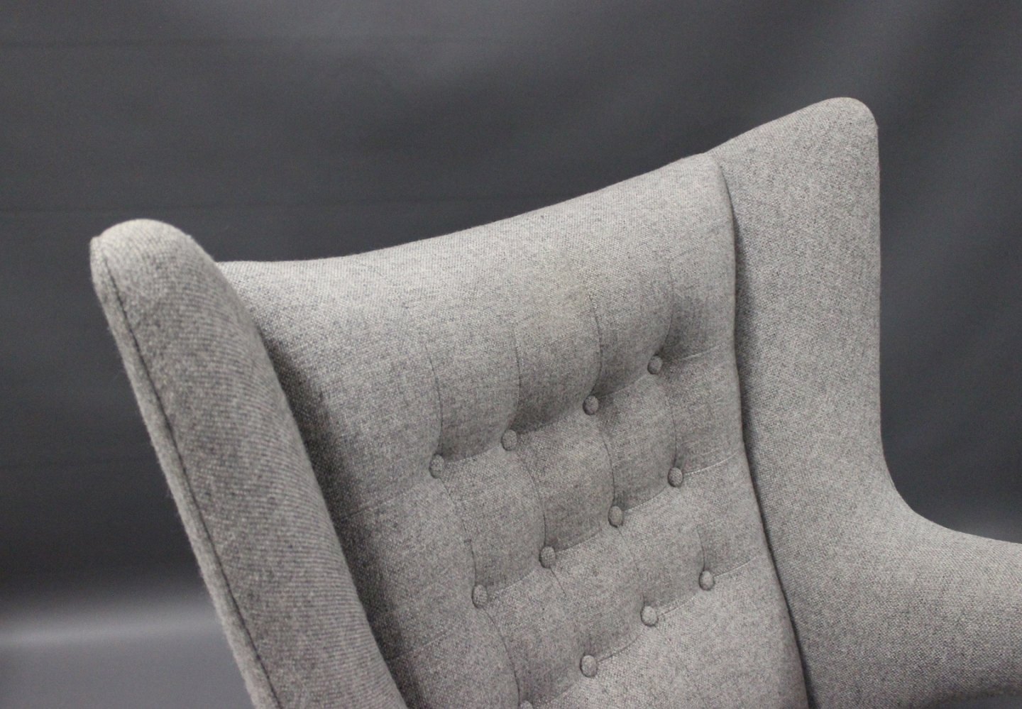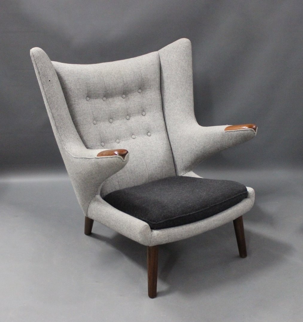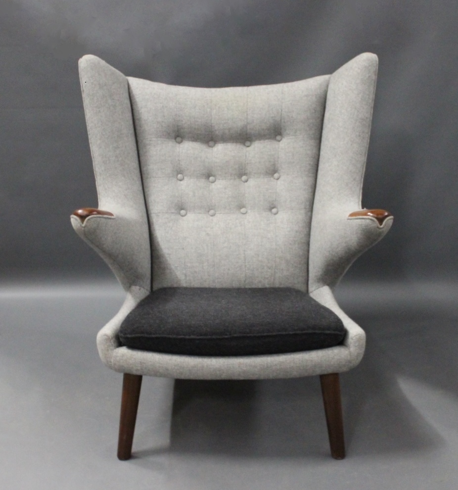 SolgtBamsestol, Model AP 19, designet af Hans J. Wegner i 1951 og produceret af A.P. Møbler. Stolen er polstret i lyst og mørke gråt Hallingdal uld, ben og "poter" af teak.