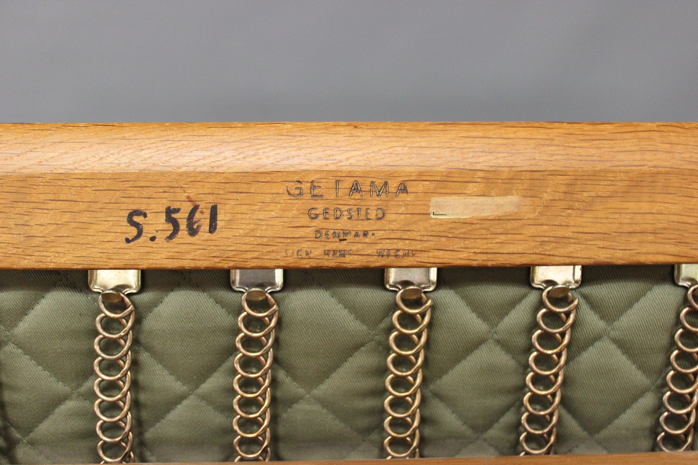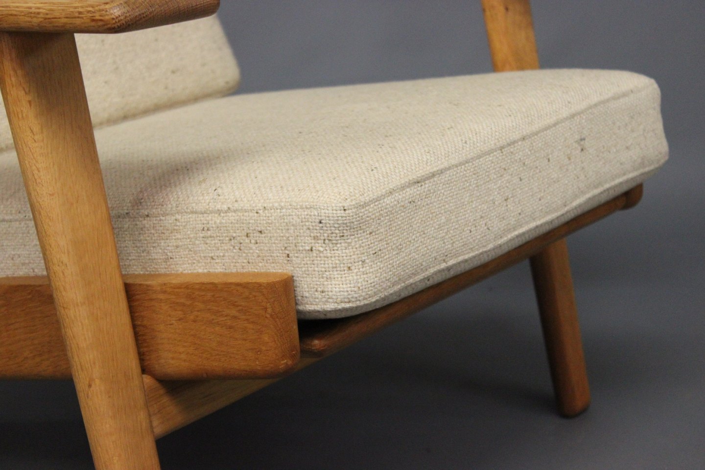 SolgtArmstol, model GE290, designet af Hans J. Wegner i 1950erne og fremstillet hos GETAMA i 1960erne. Stolen er af eg og hynder polstret af lyst Hallingdal uld.