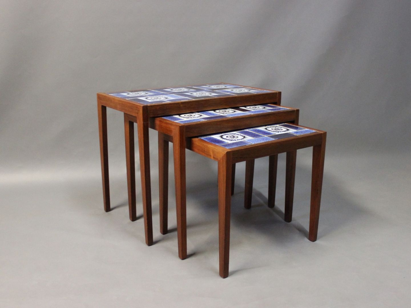 SoldA set of nesting tables in rosewood with tiles in blue colors, Danish Design from the 1960s.