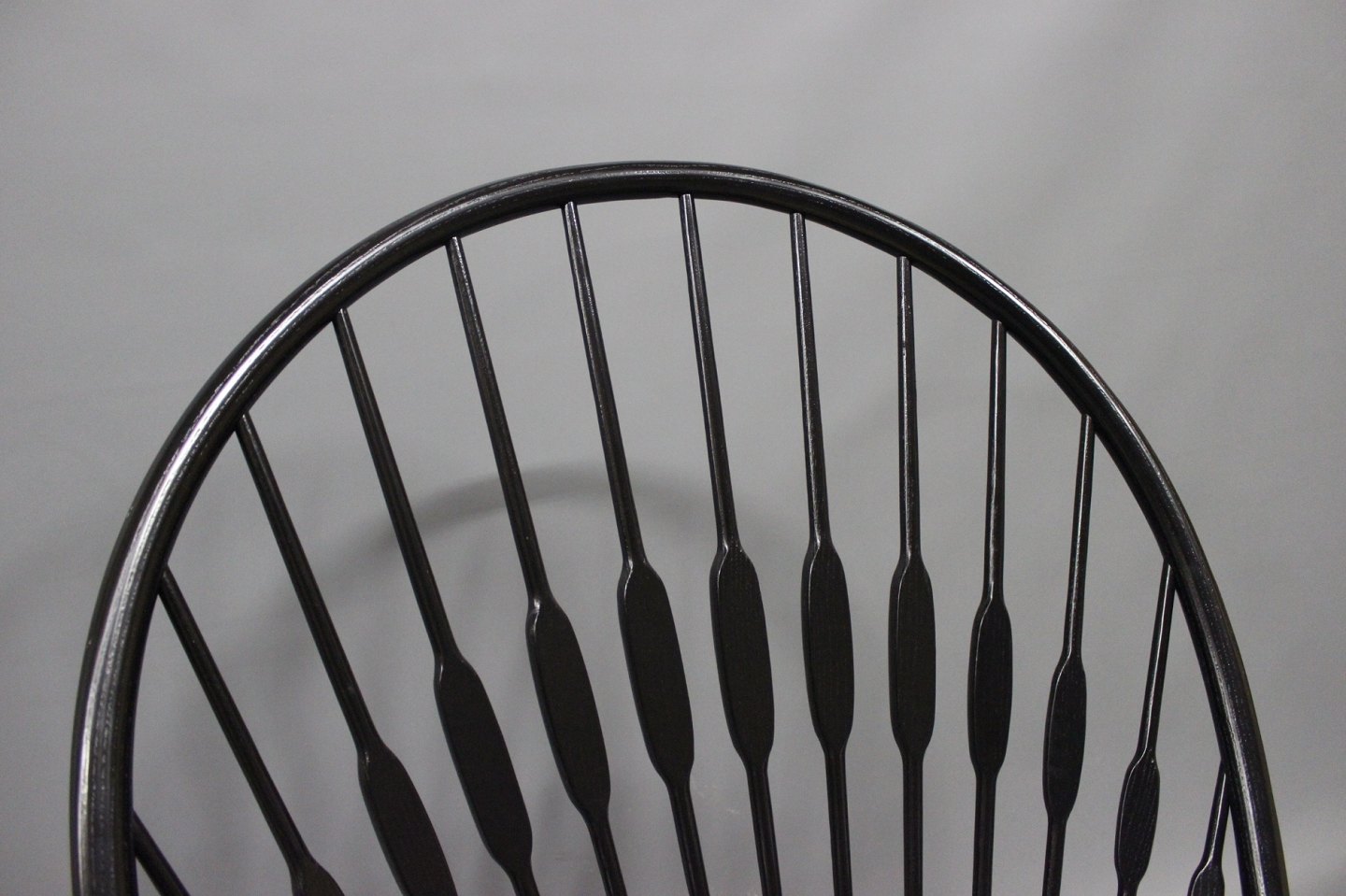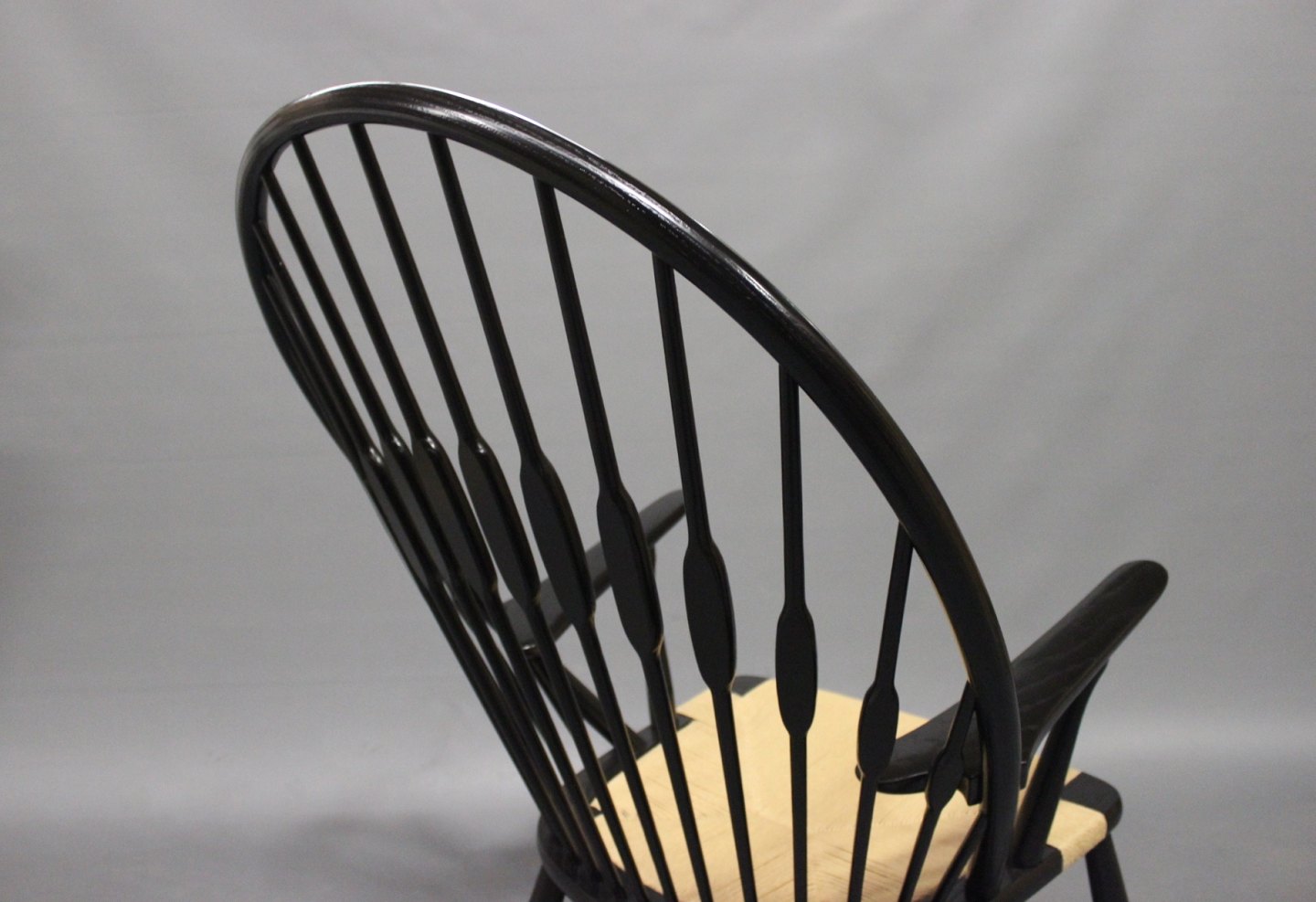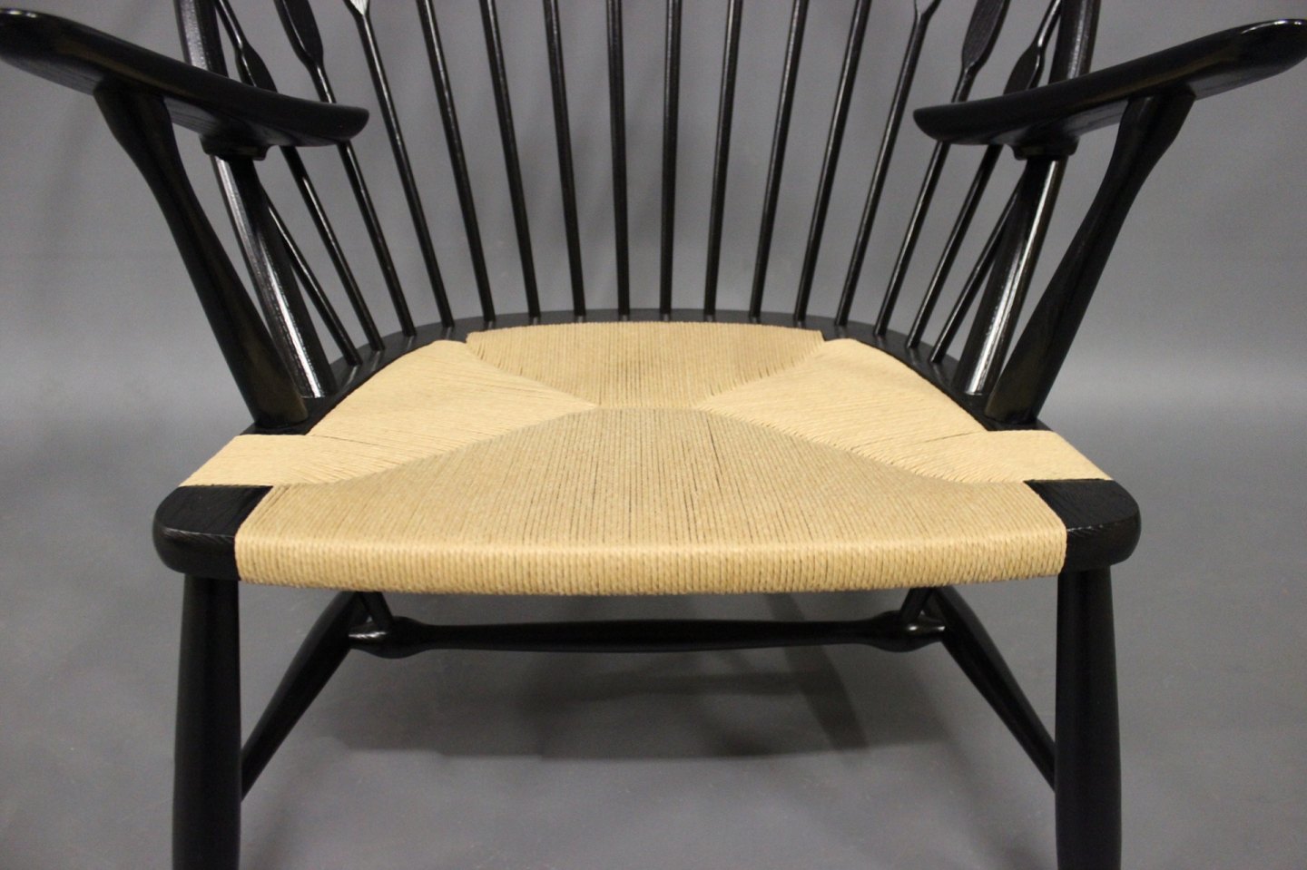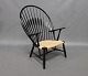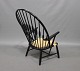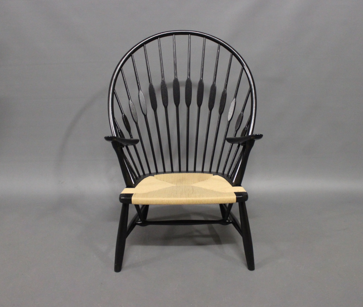 Sold"Peacock" chair designed by Hans J. Wegner in 1947 and manufactured in the 1980s. The chair is of black lacquered ash and seat of papercord.