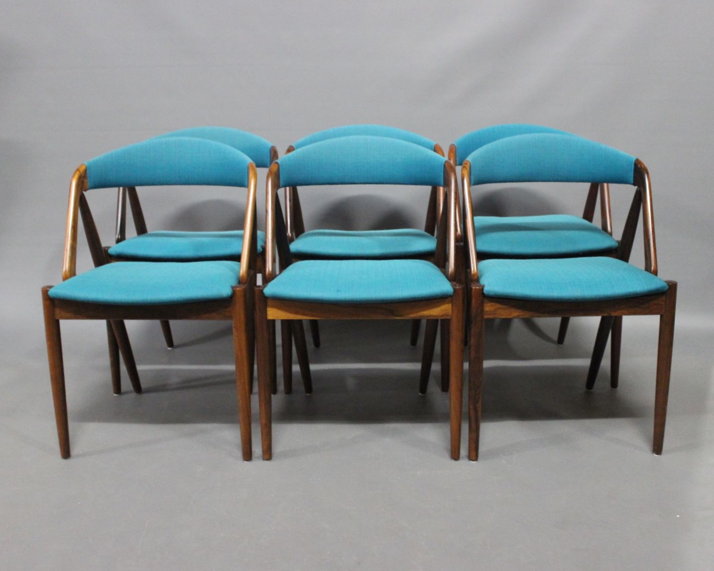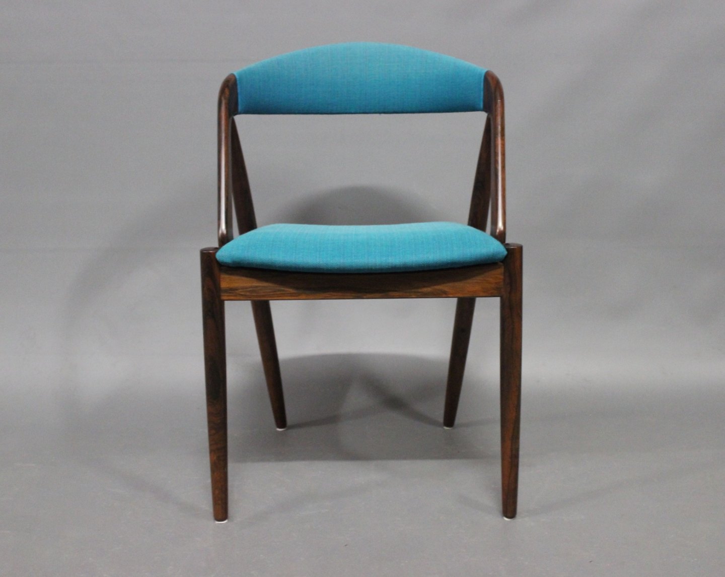 SoldA set of six dining room chairs, model 31, designed by Kai Kristiansen in 1956 and manufactured by Schou Andersen in the 1960s. The chairs are in rosewood and upholstered in blue fabric.