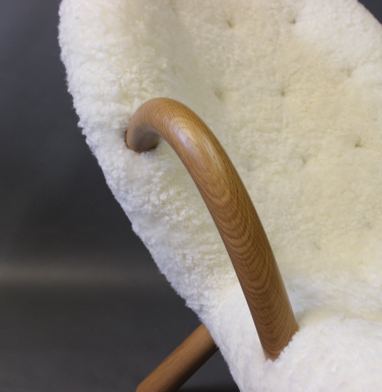 Sold"The Clam Chair" originally designed by Phillip Arctander in 1944 and manufactured by Paustian in 2016. The chair is upholstered in sheep skin and with amrs and legs og oak.
