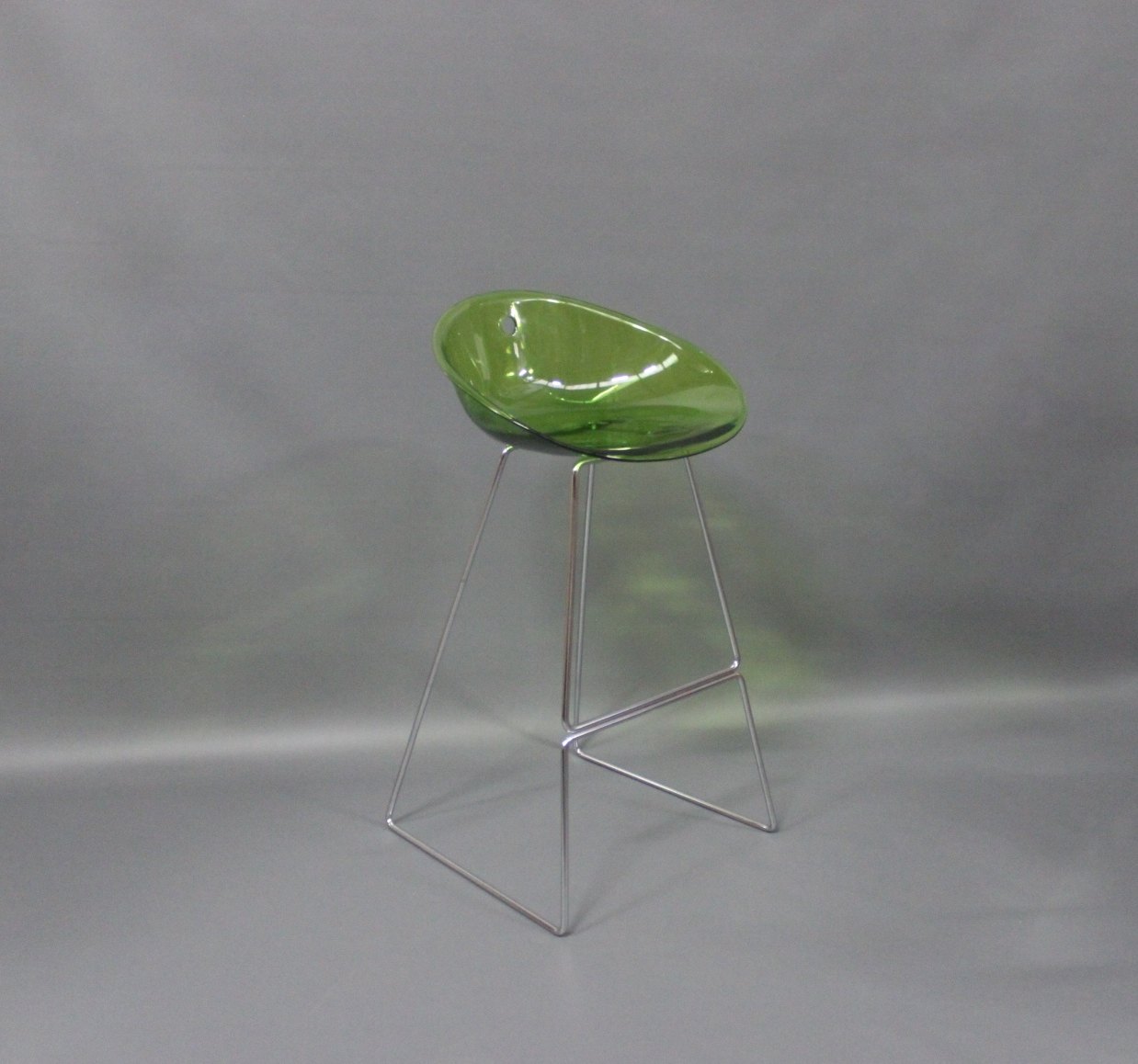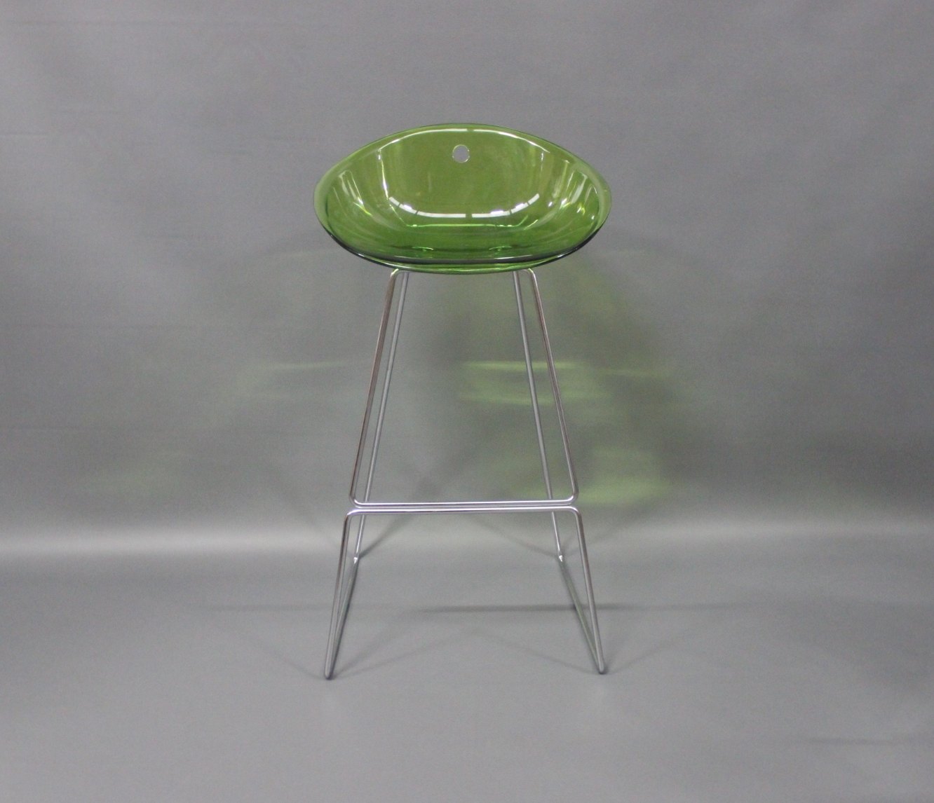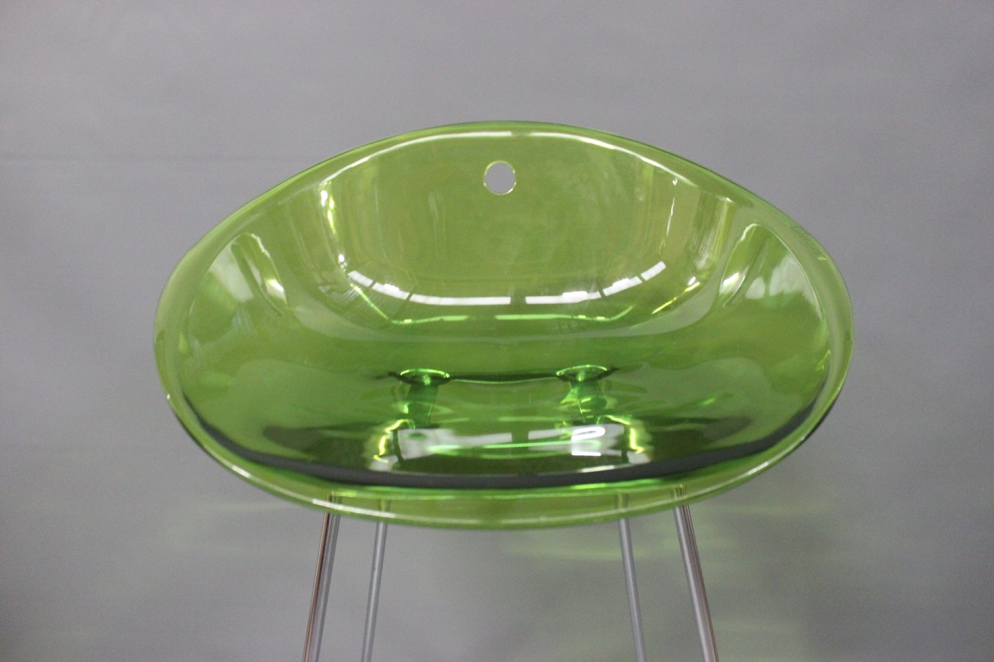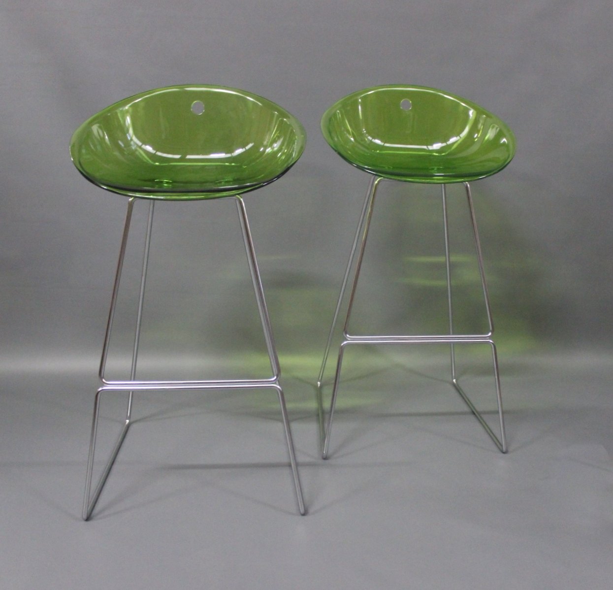 SoldA pair of green Pedrali, 906, Gliss barstools designed by Claudio Dondoli and Marco Pocci. The stools are of Italian design, with an acryllic shell and frame of chrome.
