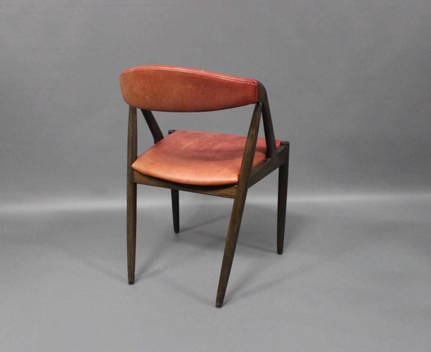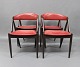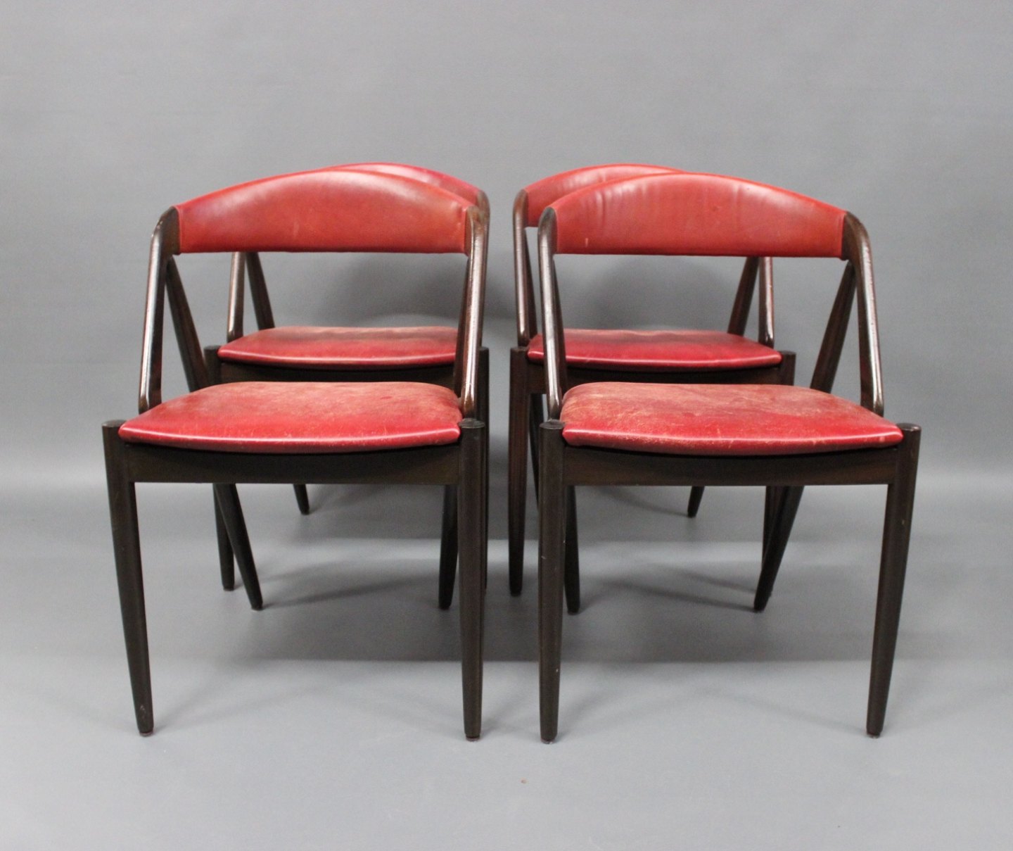 Dette sæt af fire spisestuestole, model 31, er et smukt eksempel på dansk møbeldesign fra midten af det 20. århundrede. Designet af den anerkendte designer Kai Kristiansen i 1956 og fremstillet hos Schou Andersen i 1960'erne, udstråler disse stole en tidløs elegance og enestående håndværksmæssig kvalitet. Stolene er konstrueret af palisandertræ, der giver dem en varm og luksuriøs glød, og de er polstret med rødt læder, hvilket tilføjer en sofistikeret og inviterende touch til ethvert spiseområde. Kai Kristiansens karakteristiske designæstetik, der kombinerer funktionalitet med æstetik, skinner igennem i disse stole, hvilket gør dem til både smukke og komfortable siddepladser.