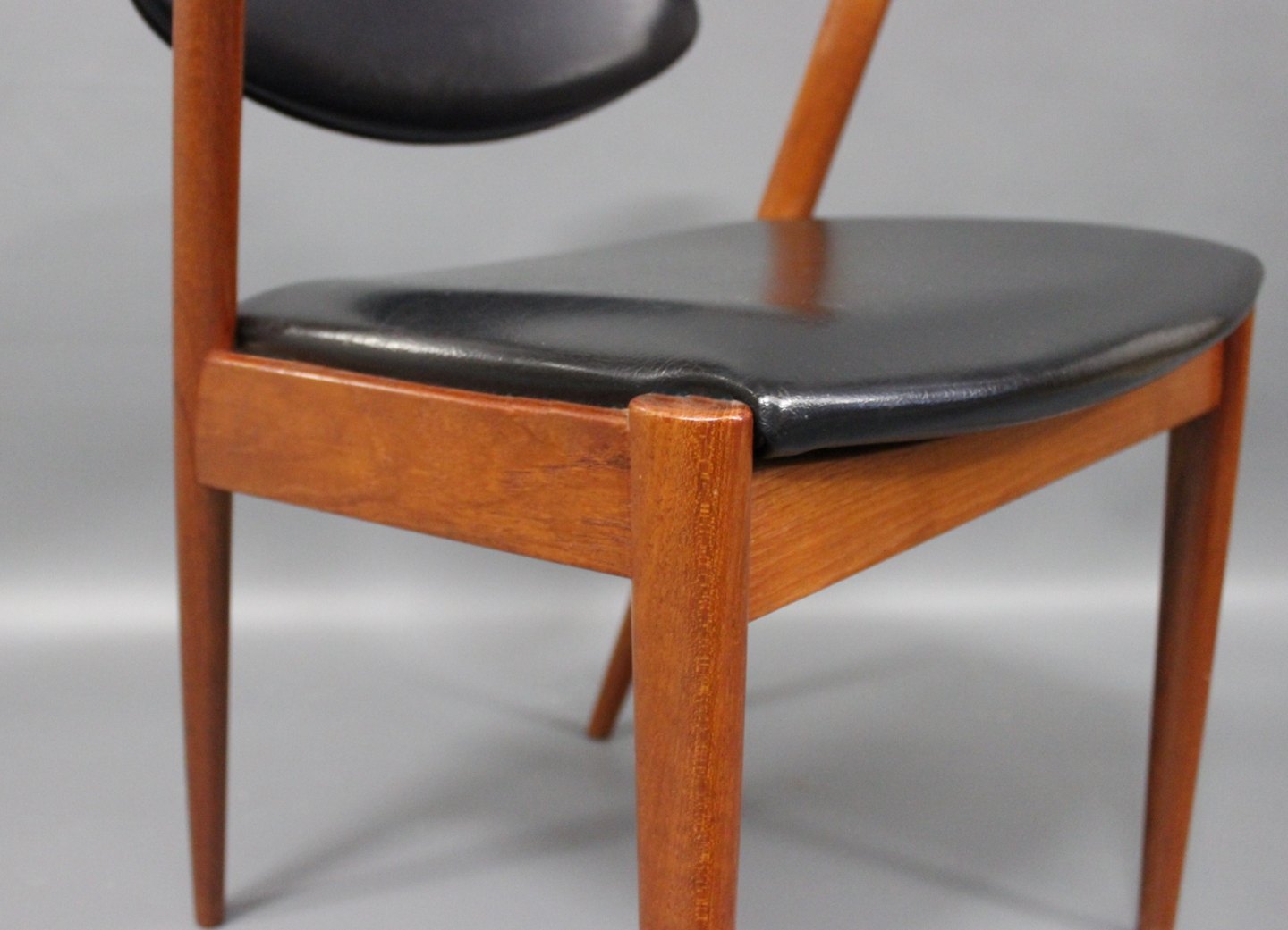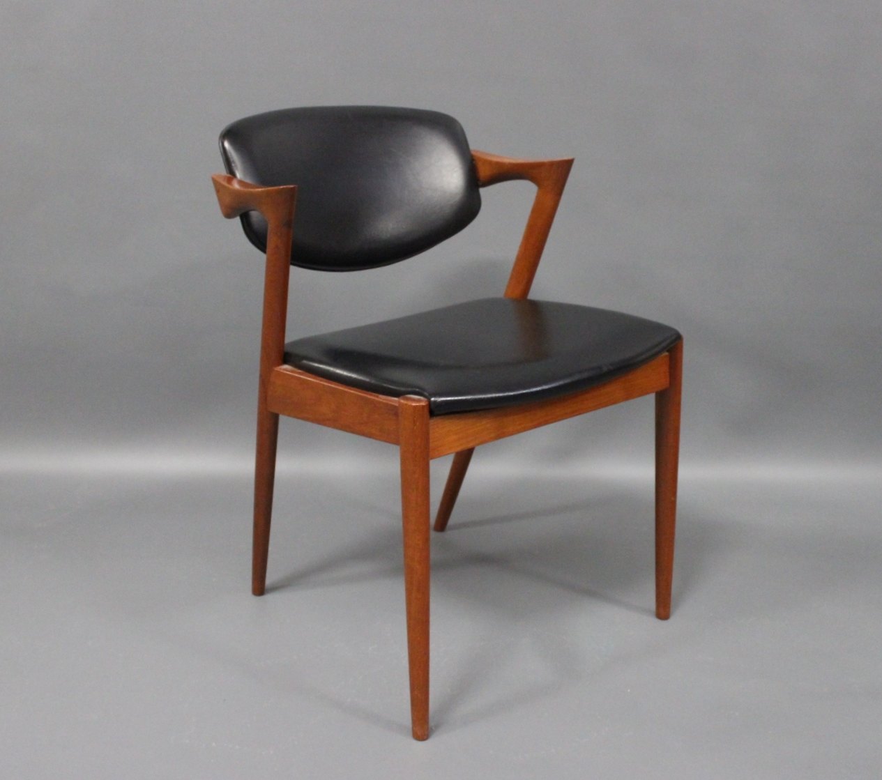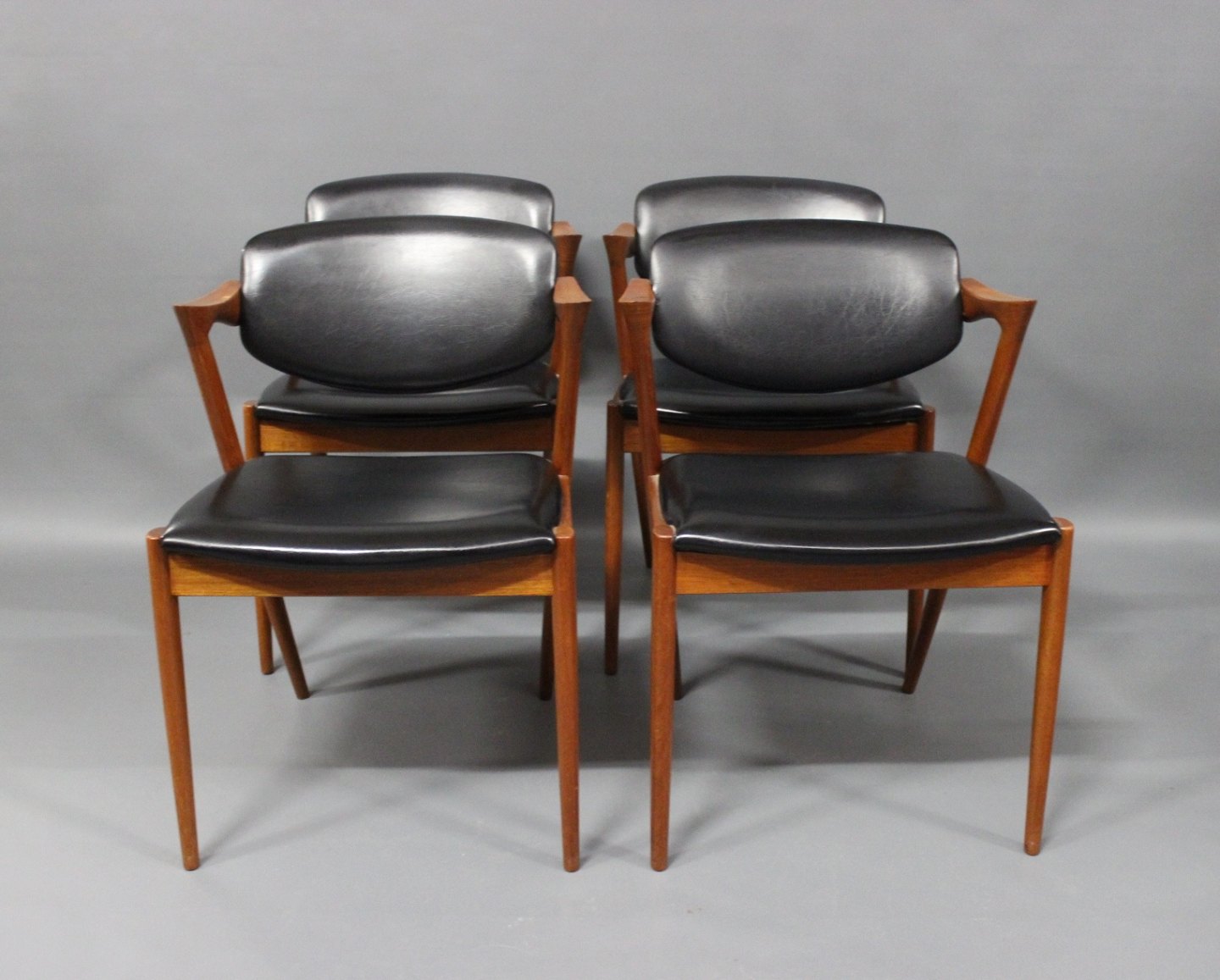 SolgtEt sæt af 8 spisestuestole, model 42, designet af Kai Kristiansen og fremstillet hos Schou Andersen i 1960erne. Stolene er af teak og polstret i sort klassisk læder.