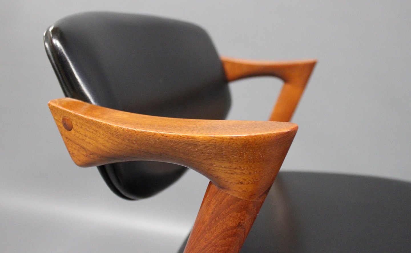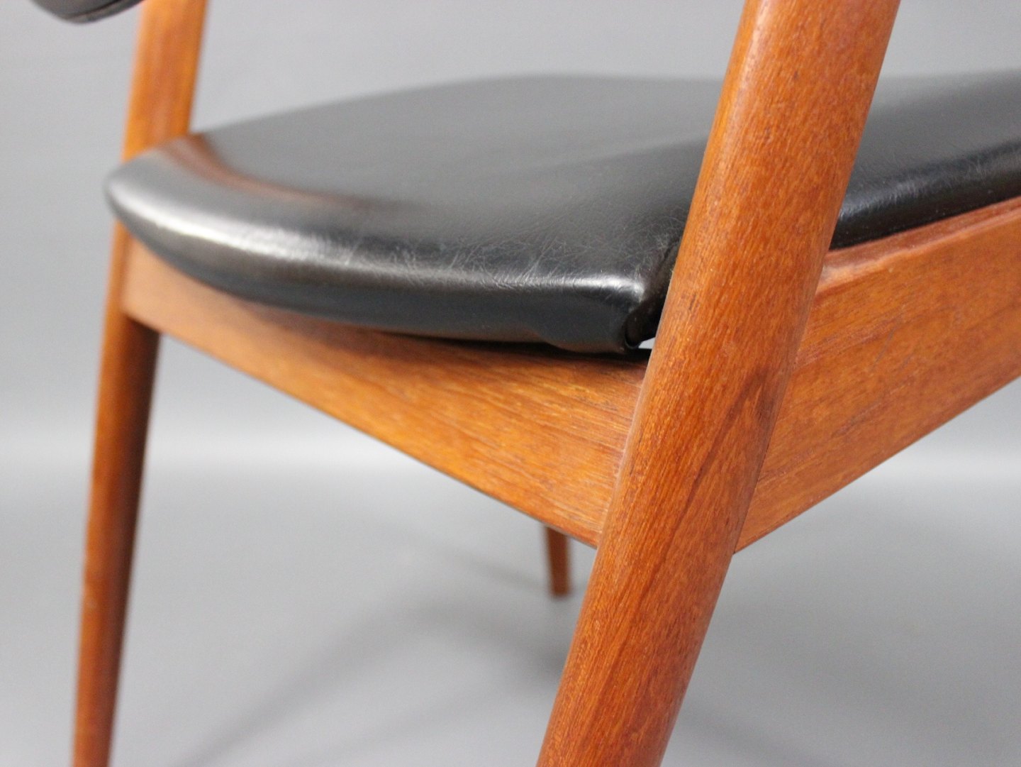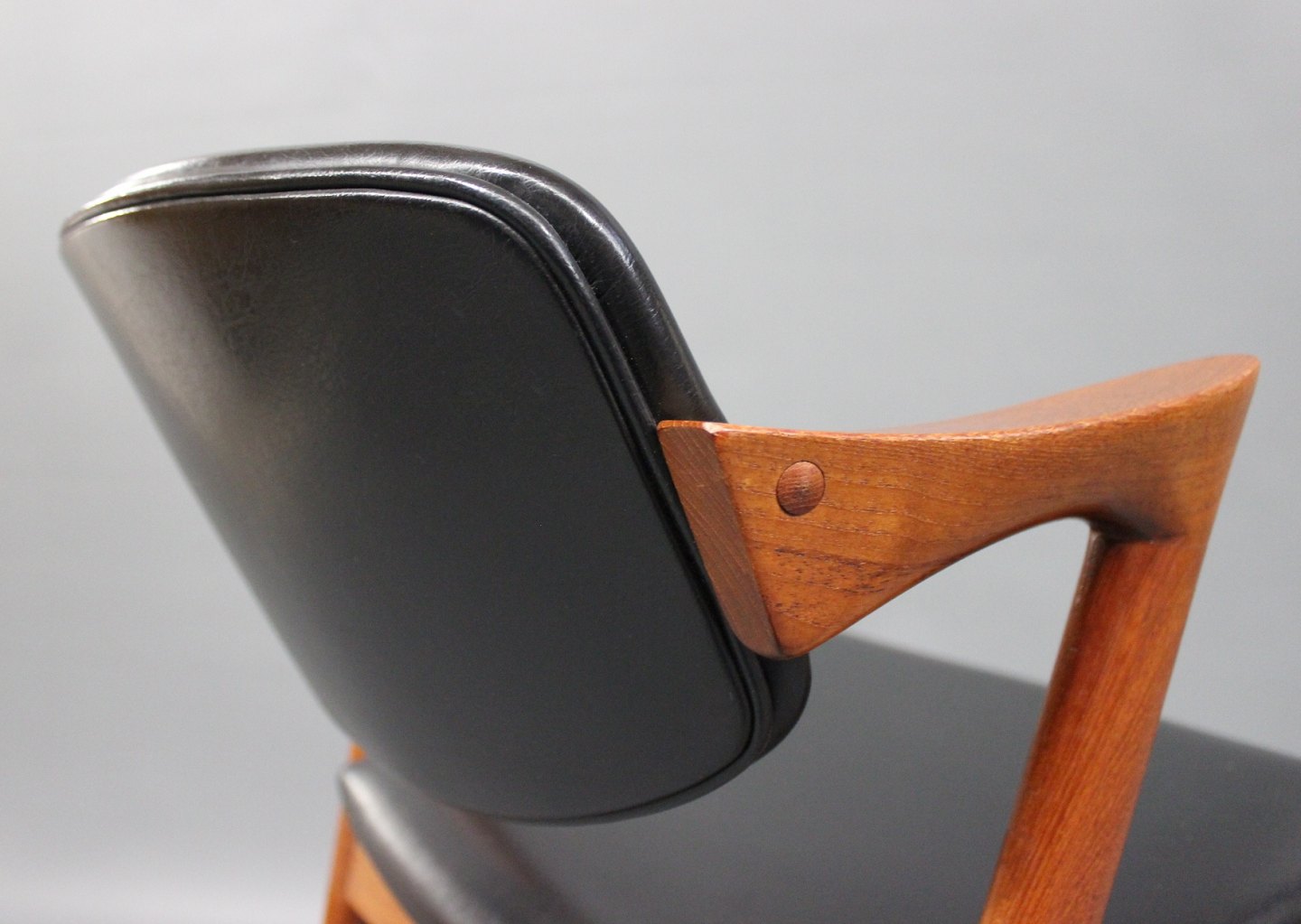 SolgtEt sæt af 8 spisestuestole, model 42, designet af Kai Kristiansen og fremstillet hos Schou Andersen i 1960erne. Stolene er af teak og polstret i sort klassisk læder.