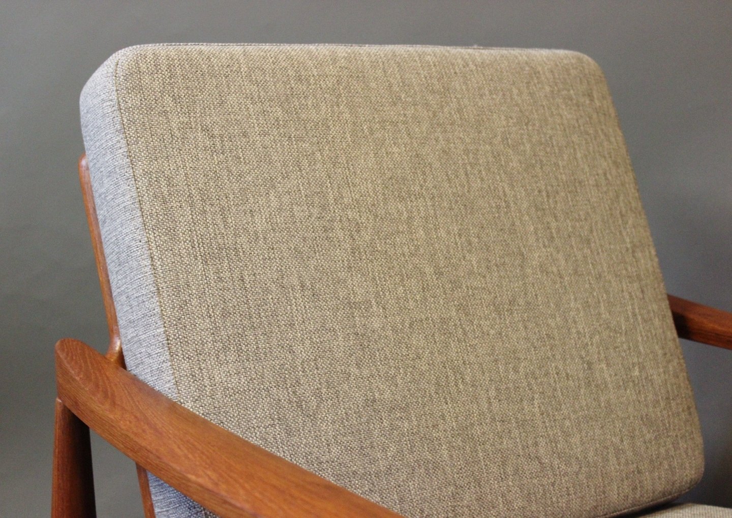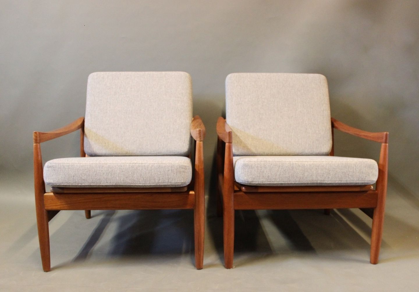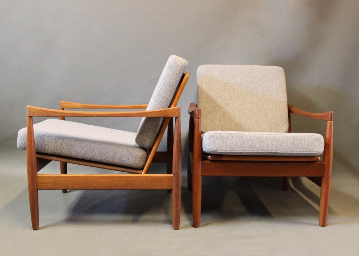 Et sæt lænestole i teak og hynder af lysegråt uld af Kai Kristiansen og Skive Møbelfabrik.