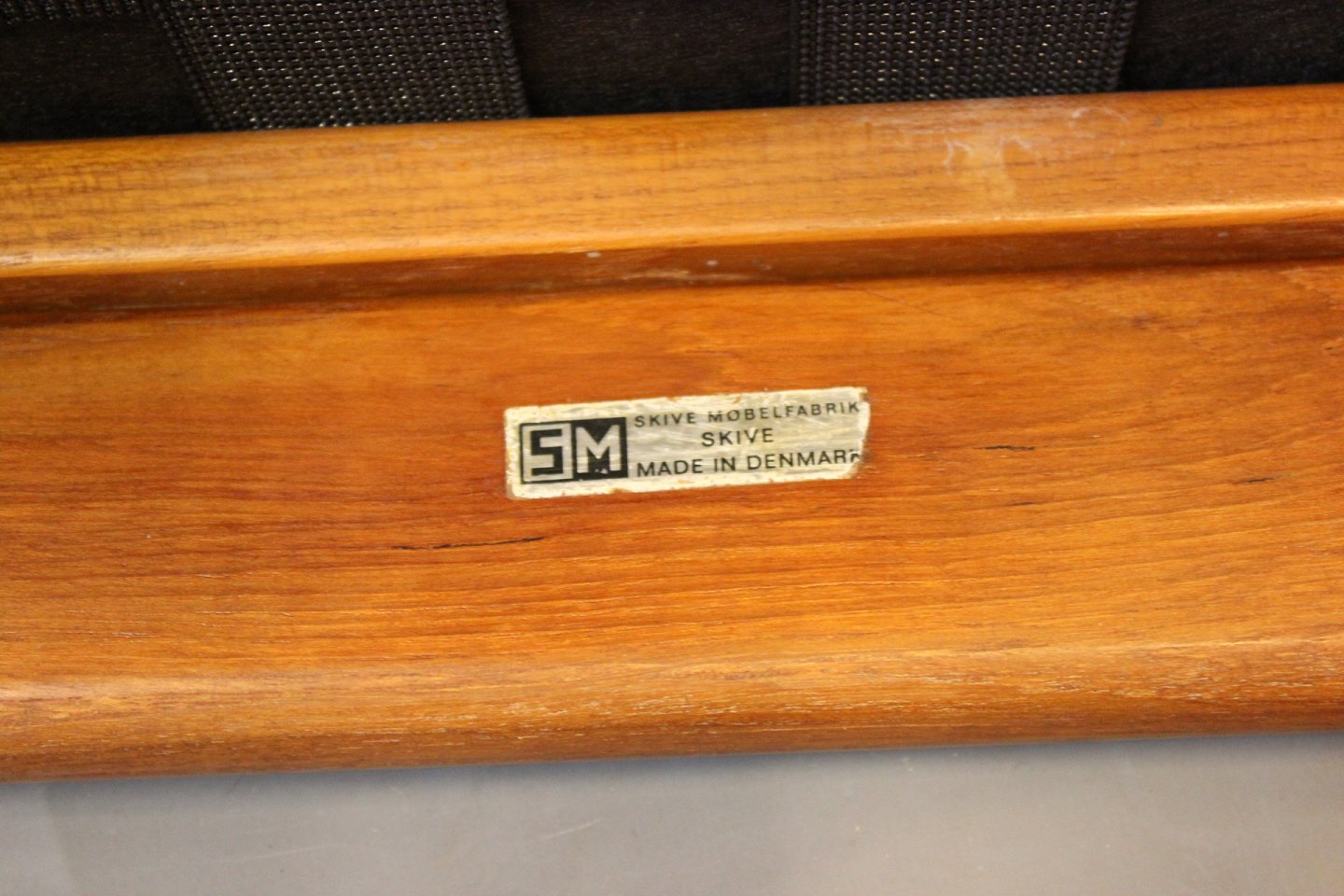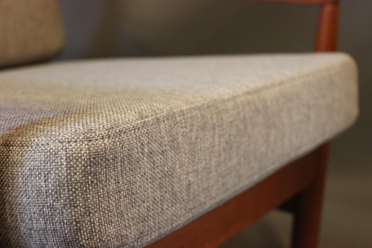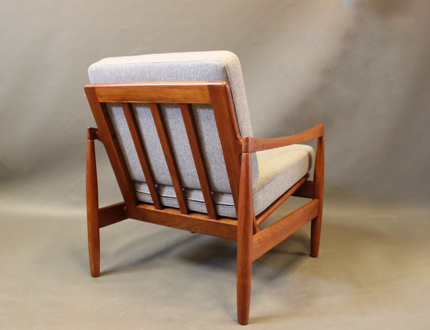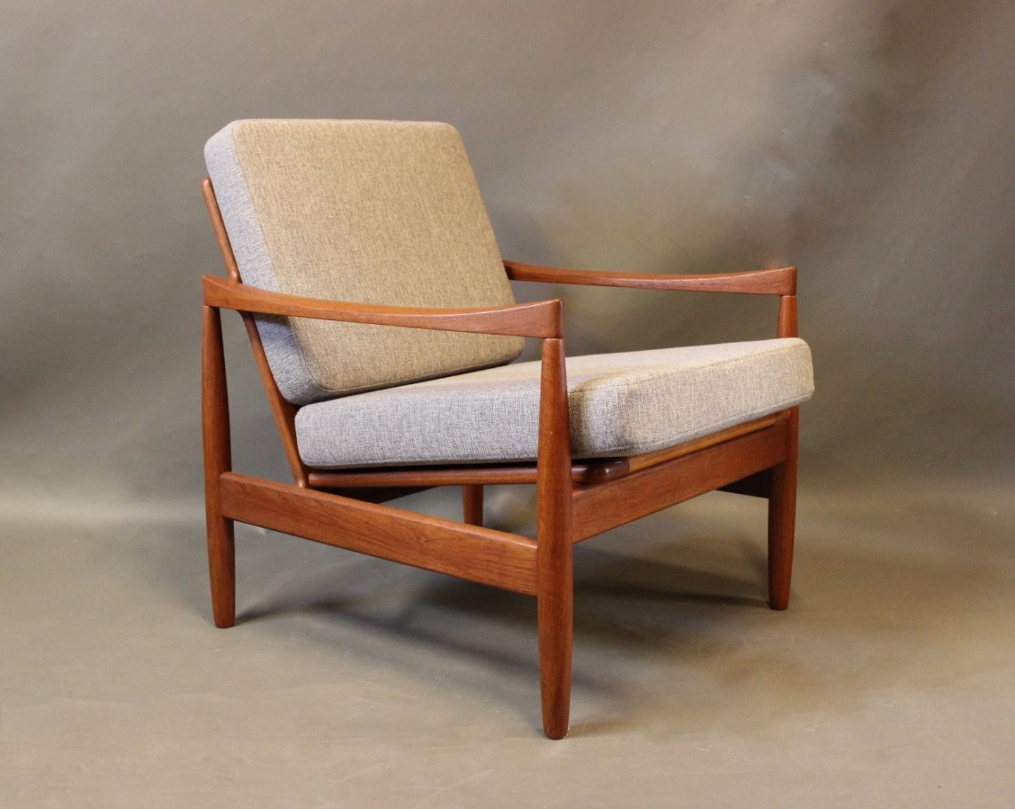Et sæt lænestole i teak og hynder af lysegråt uld af Kai Kristiansen og Skive Møbelfabrik.