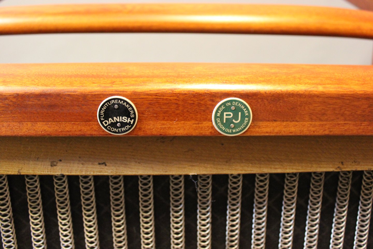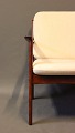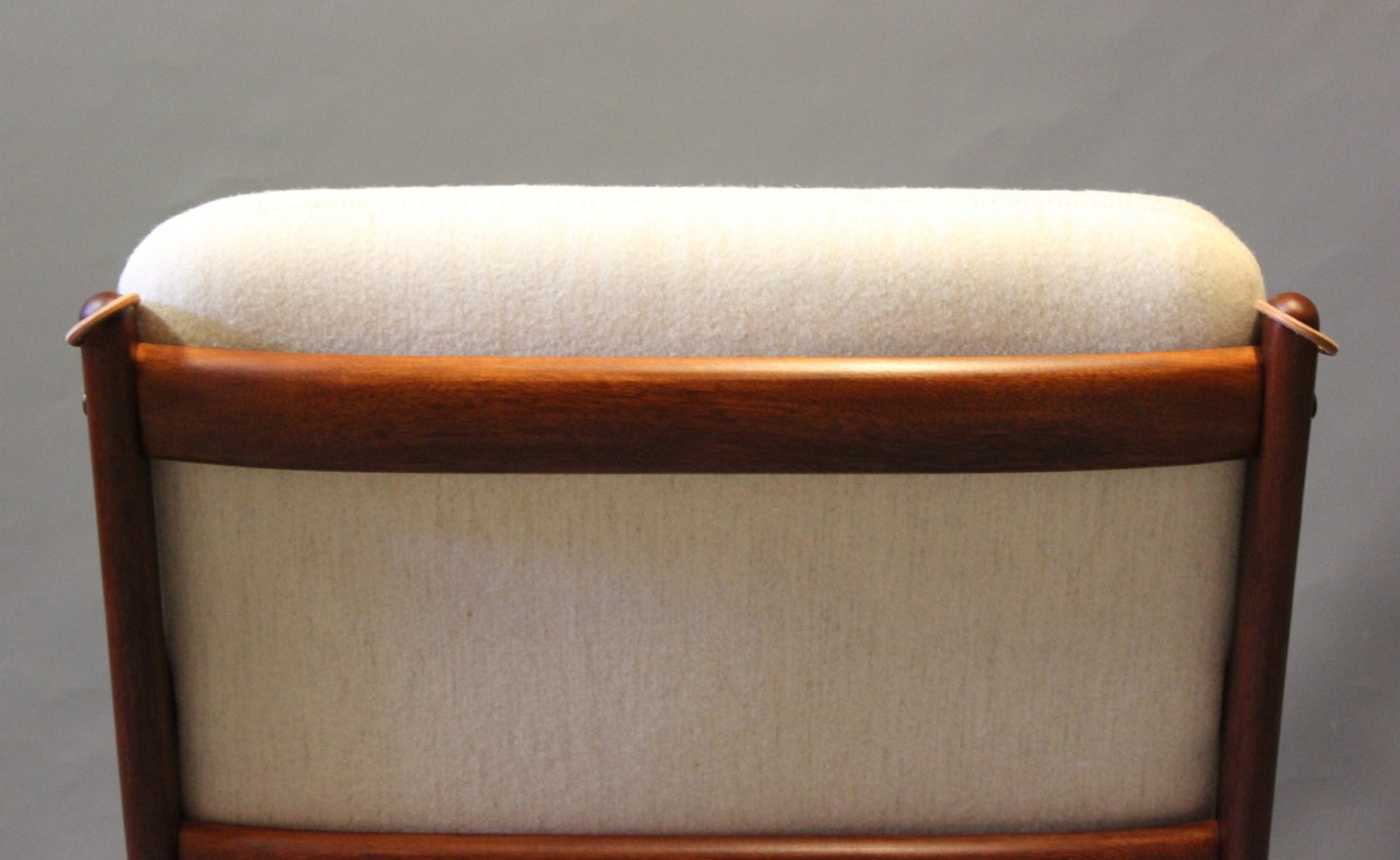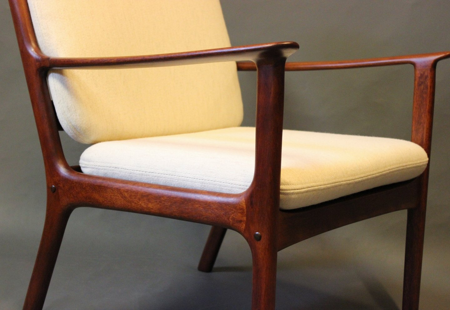 SoldPJ112 easy chair in polished mahogany and with cushions in light wool, designed by Ole Wanscher and manufactured by P. Jeppesen.