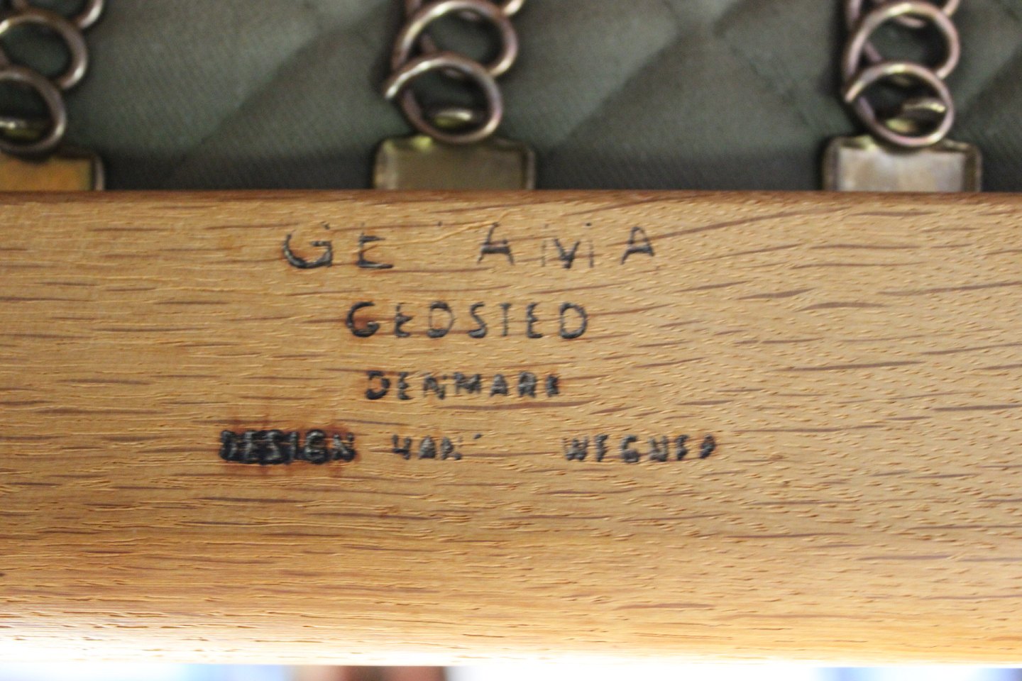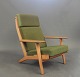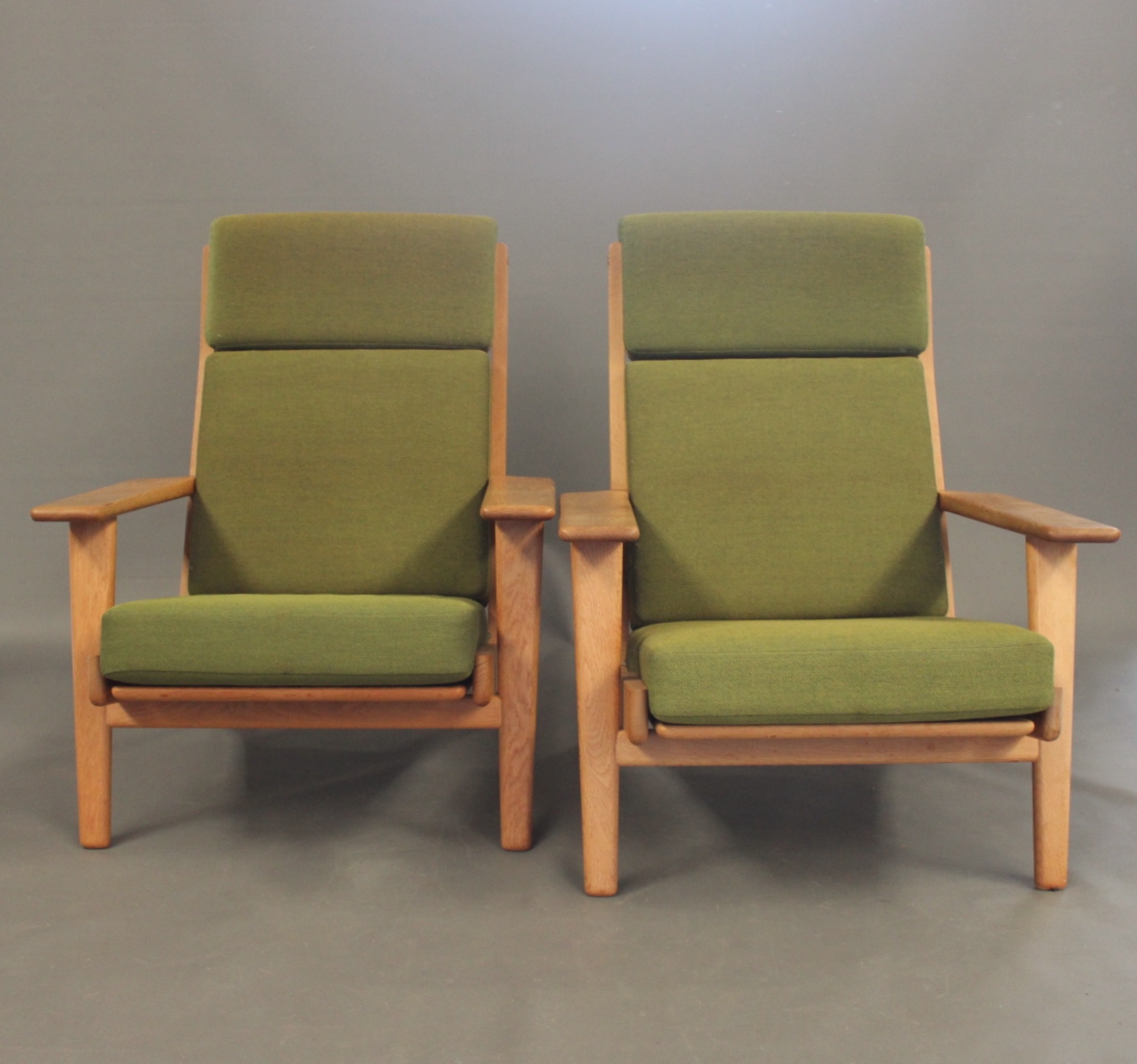 SoldA pair of armchairs with high backs, model GE290A, designed by Hans J. Wegner in the 1950s and manufactured by GETAMA in the 1960s. The chairs are made of oak and the cushions are of dark green upholstery. We have 1 left.