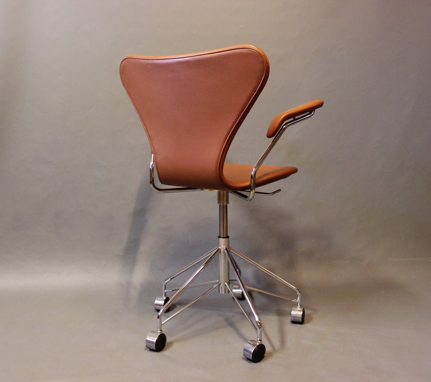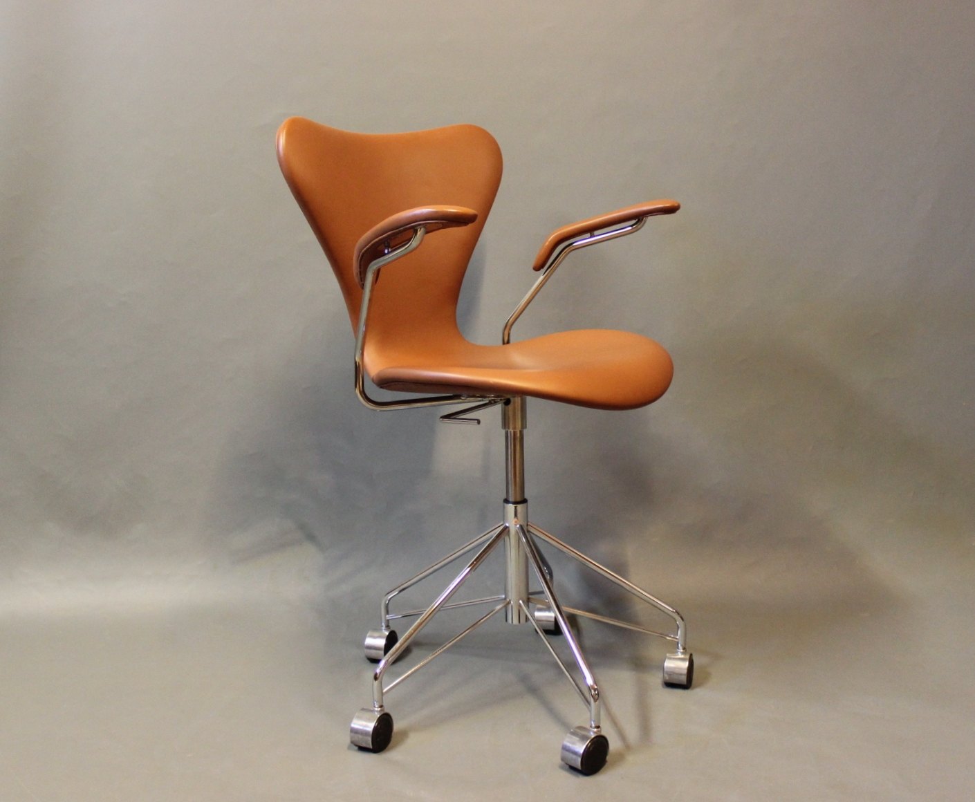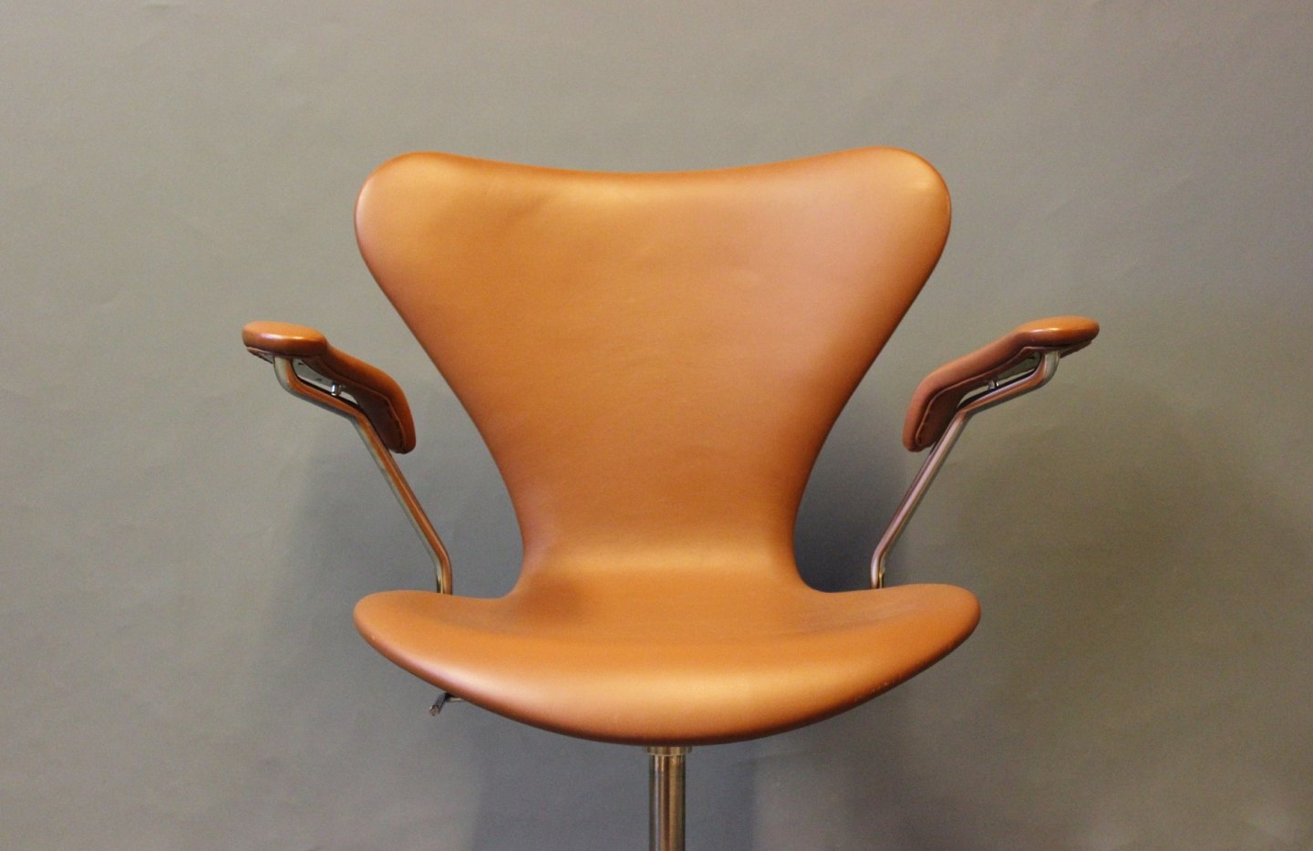 7'er kontorstol, model 3217, med armlæn og drejefunktion i cognac farvet læder designet af Arne Jacobsen i 1950erne og fremstillet af Fritz Hansen.