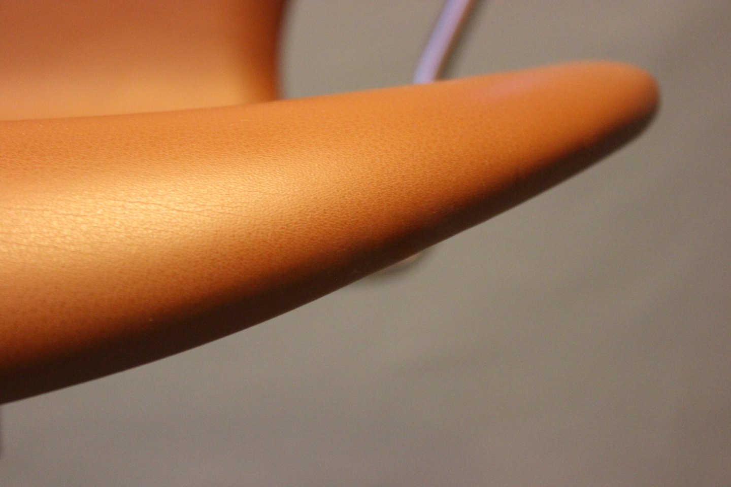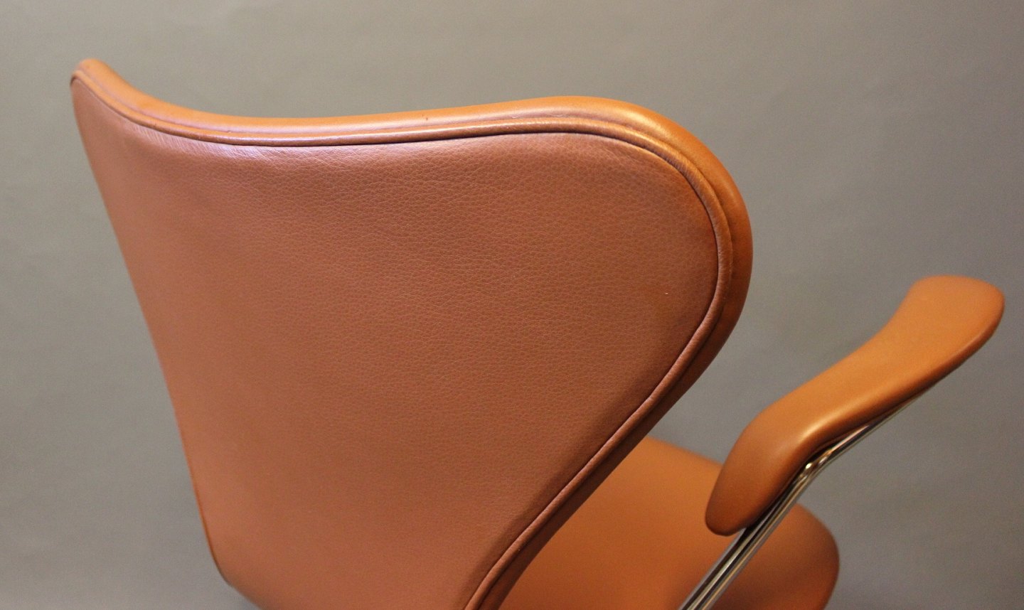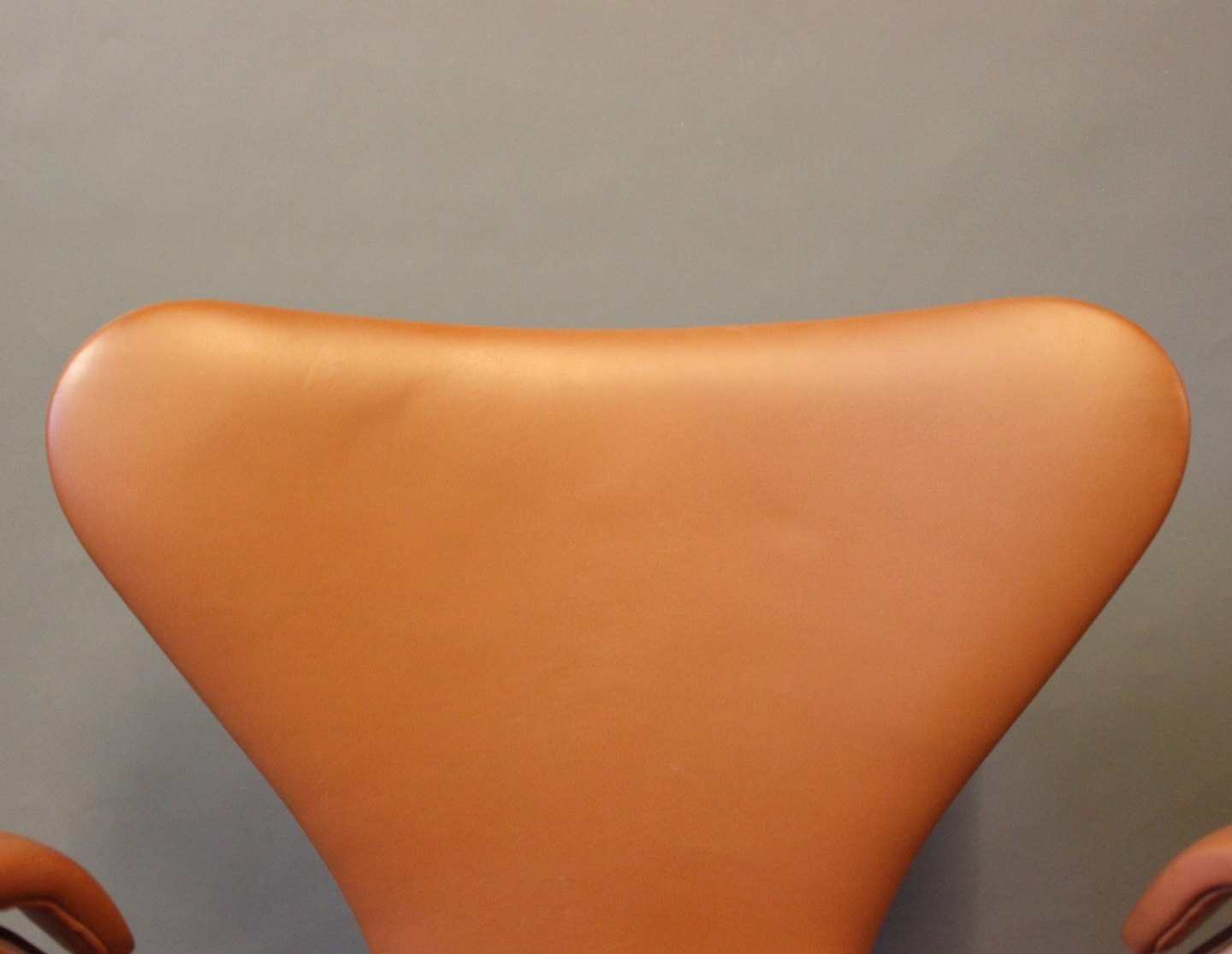 7'er kontorstol, model 3217, med armlæn og drejefunktion i cognac farvet læder designet af Arne Jacobsen i 1950erne og fremstillet af Fritz Hansen.