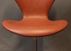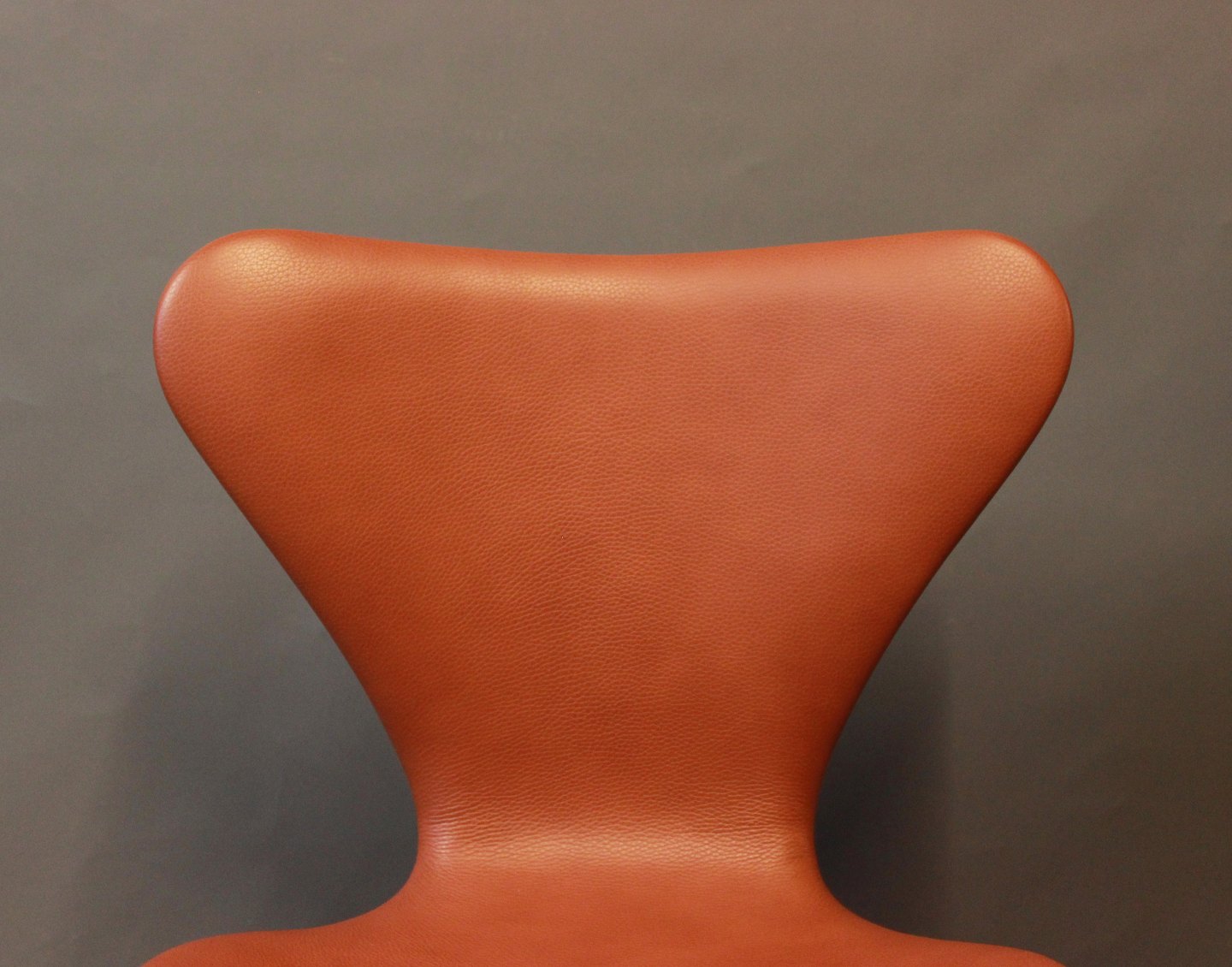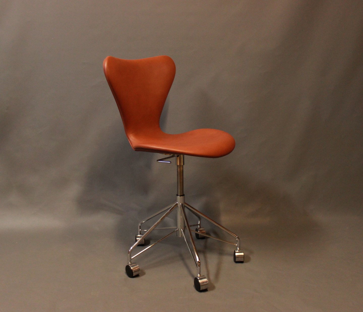 SoldSeven office chair, model 3117, in classic cognac colored leather designed by Arne Jacobsen and manufactured by Fritz Hansen in 2017. We have more in stock.