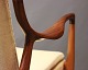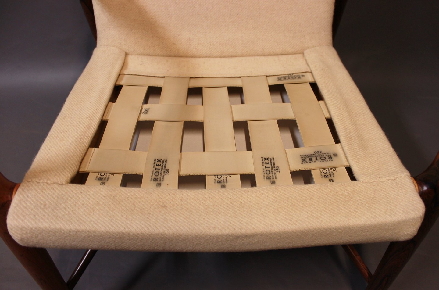 Finn Juhl, known for his innovative and sculptural designs, created the NV45 with a focus on both aesthetics and comfort. The chair has an elegant and organic shape that supports the body's natural curves and offers excellent sitting comfort. The rich, dark tones of the rosewood contrast beautifully with the light wool, giving the chair a luxurious and inviting look.