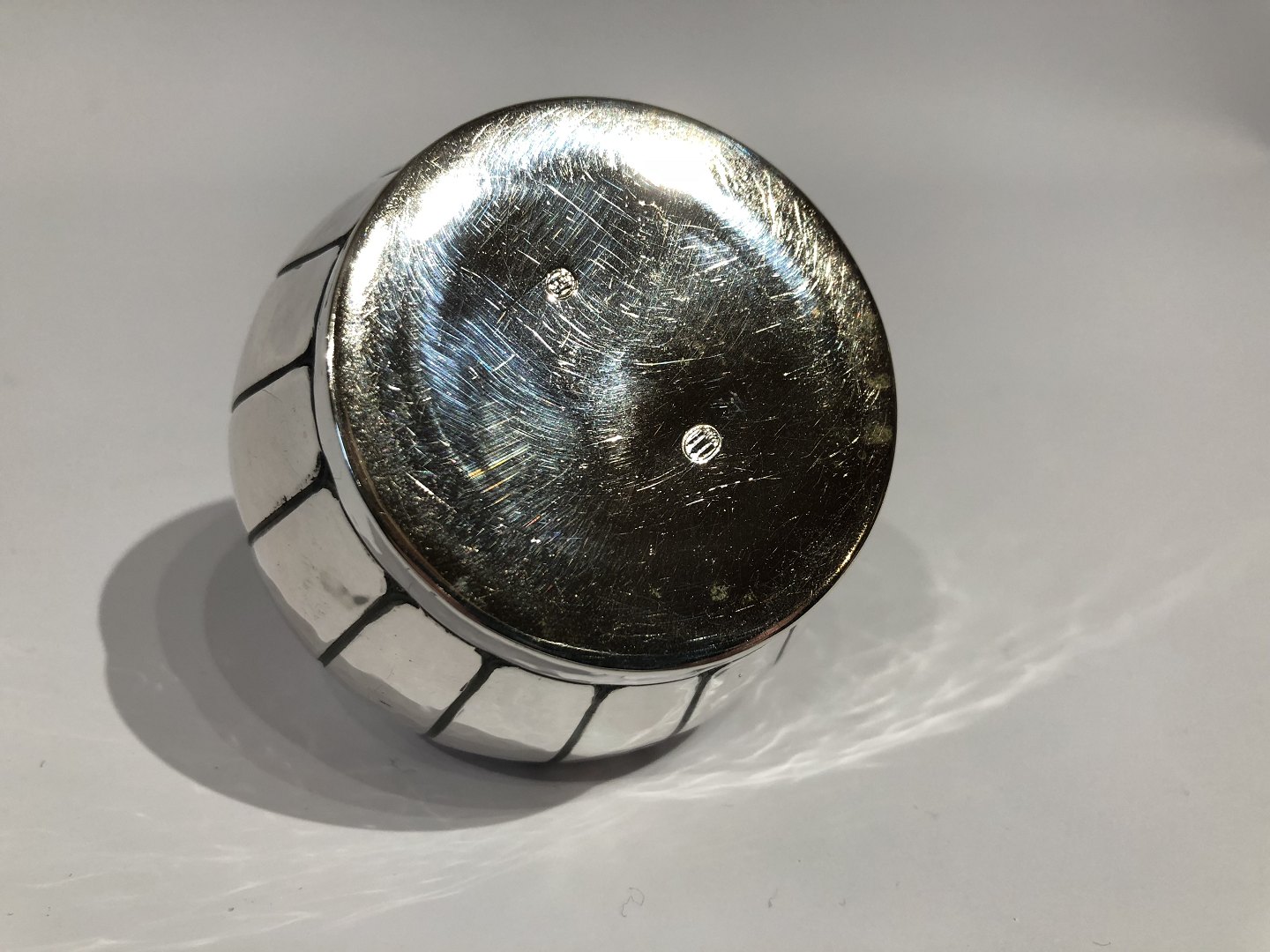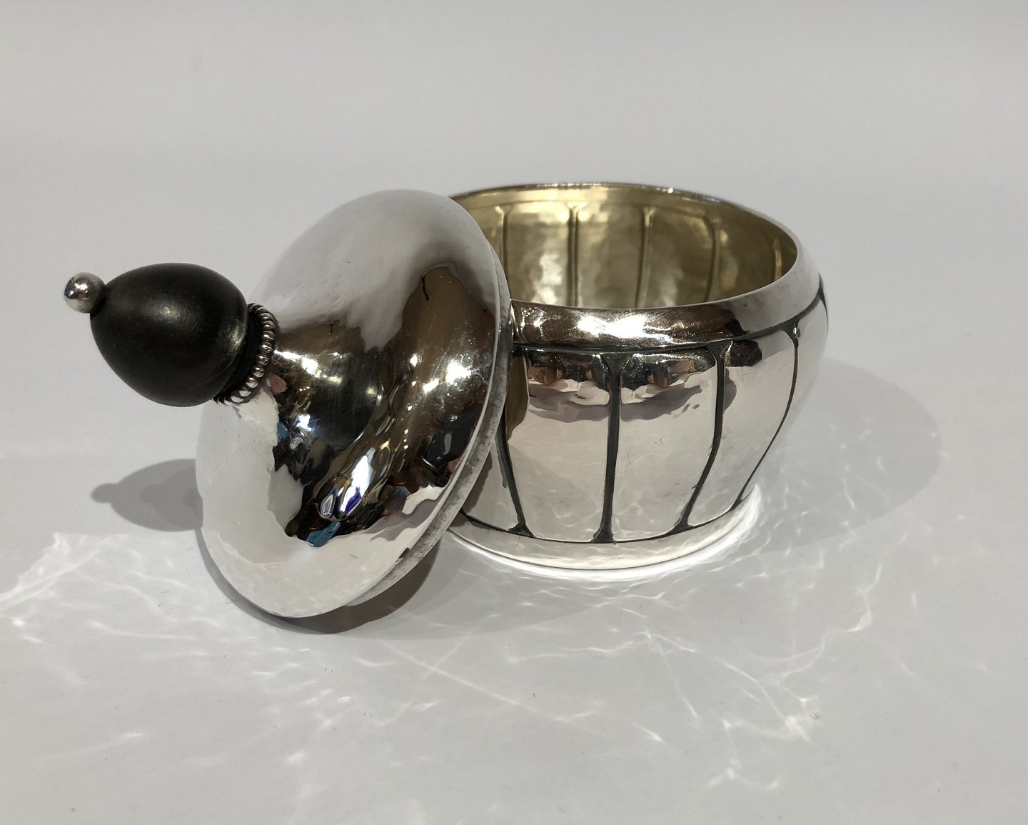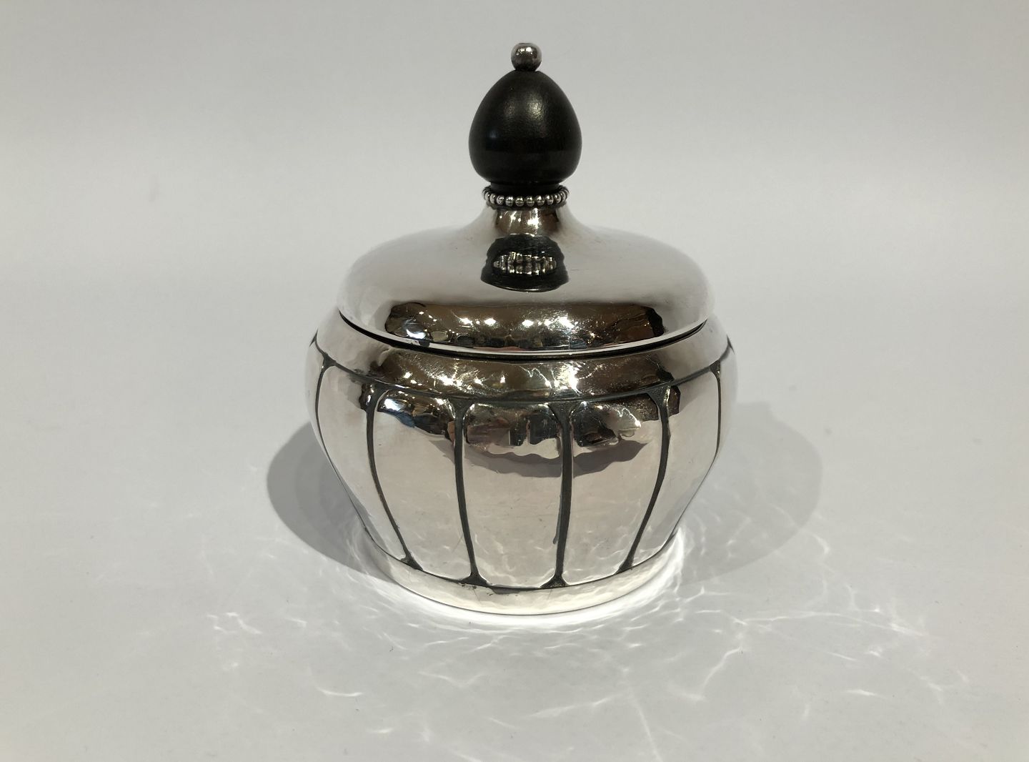 SolgtLille sukkerskål i tretårnet sølv med perlekant og ibenholt håndtag.