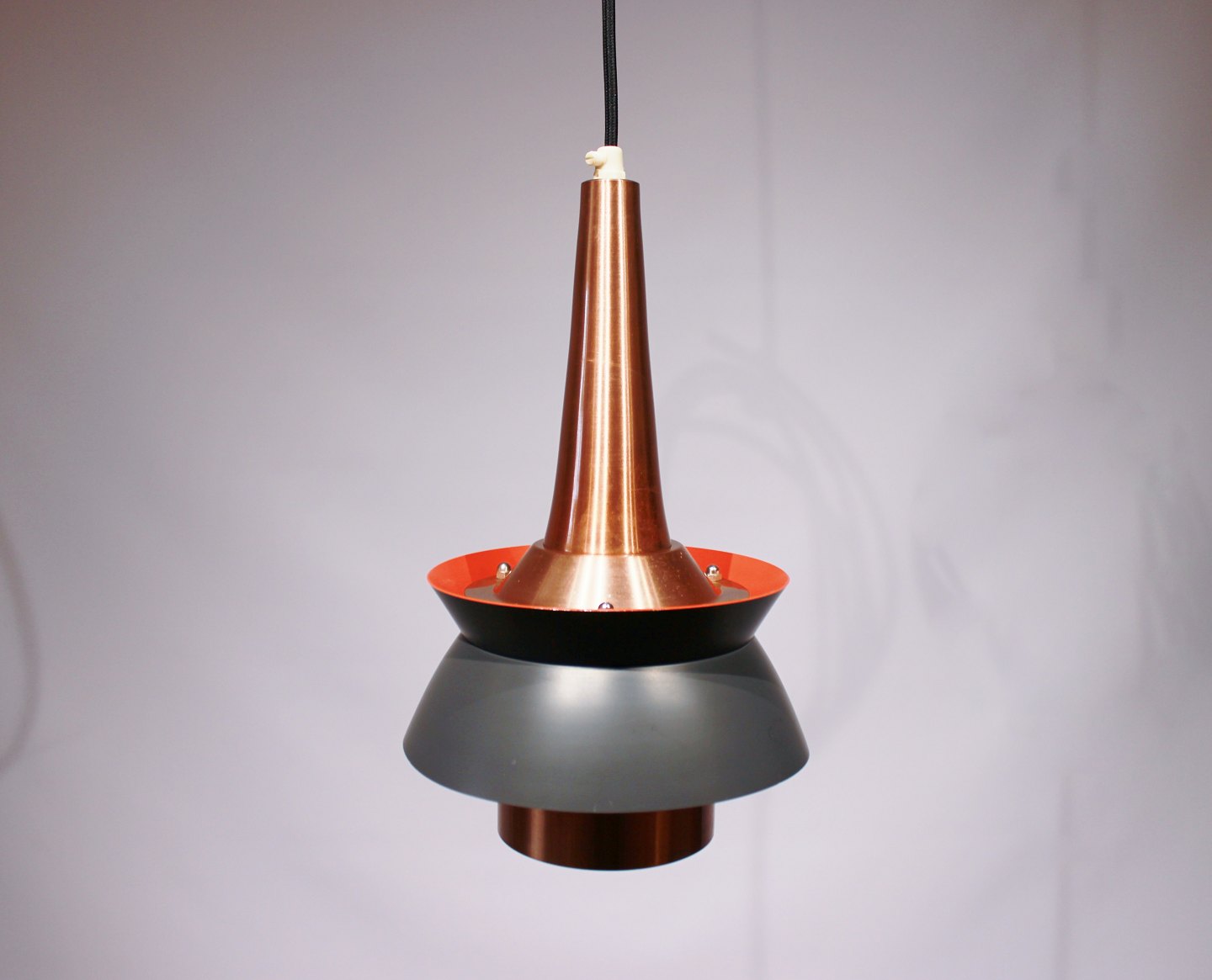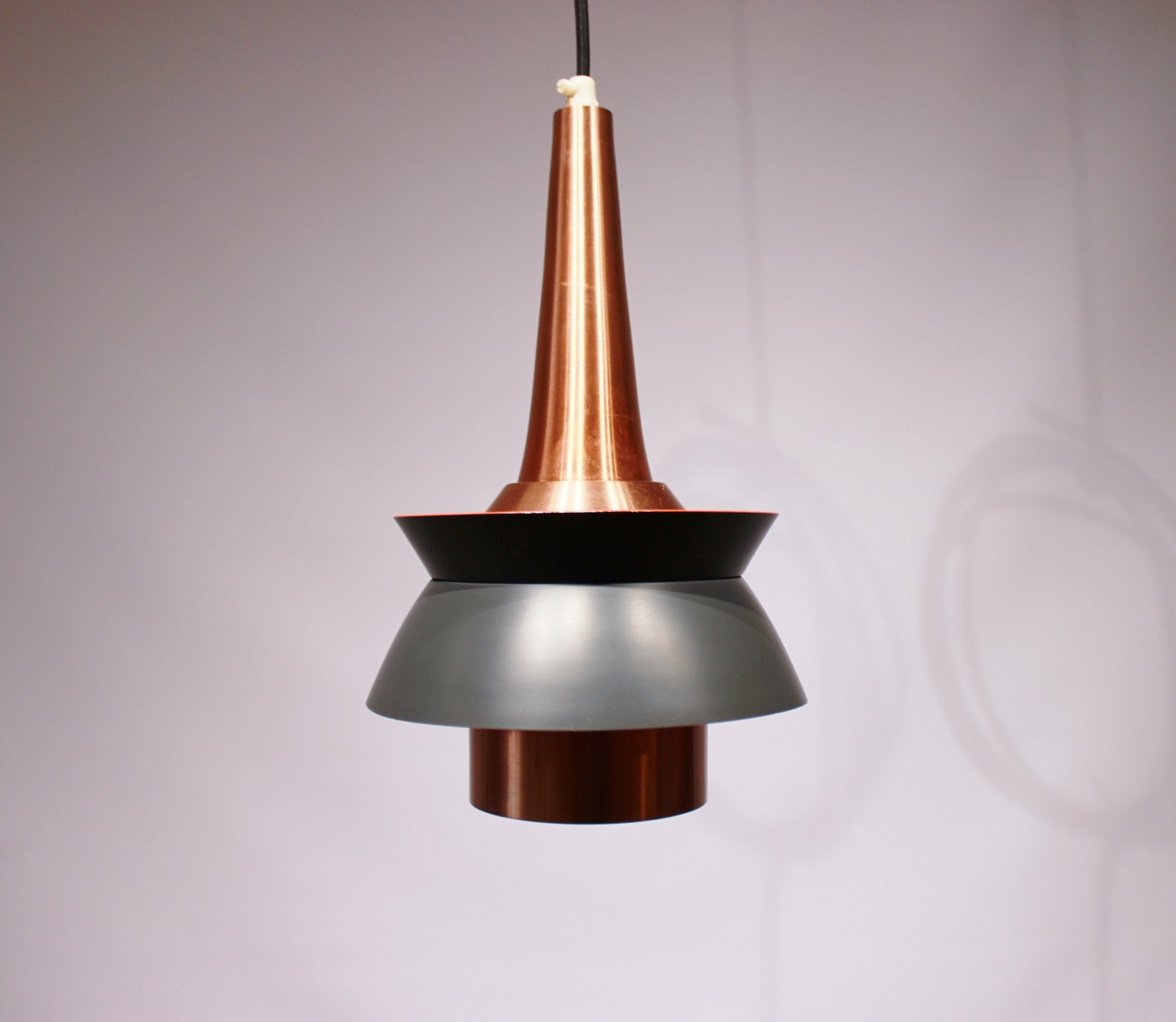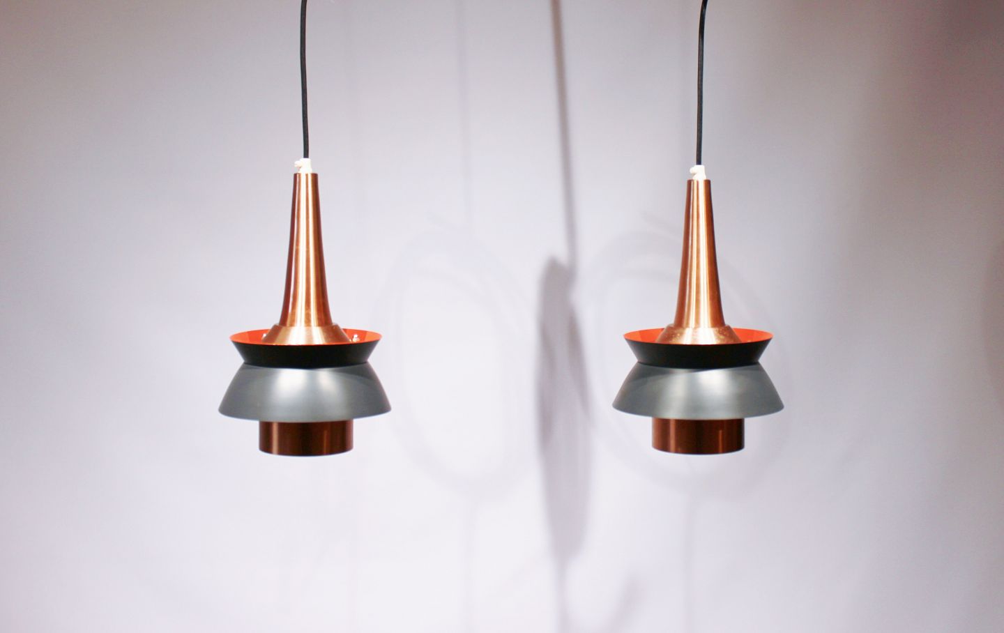 Et par loftpendler i mørkegrå metal skærme og kobber af Jo Hammerborg fra 1960erne.
