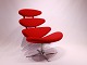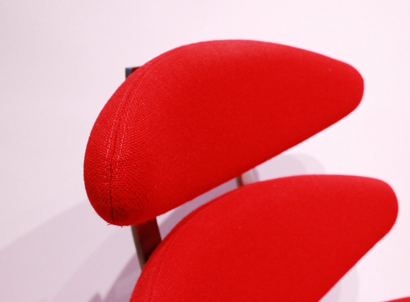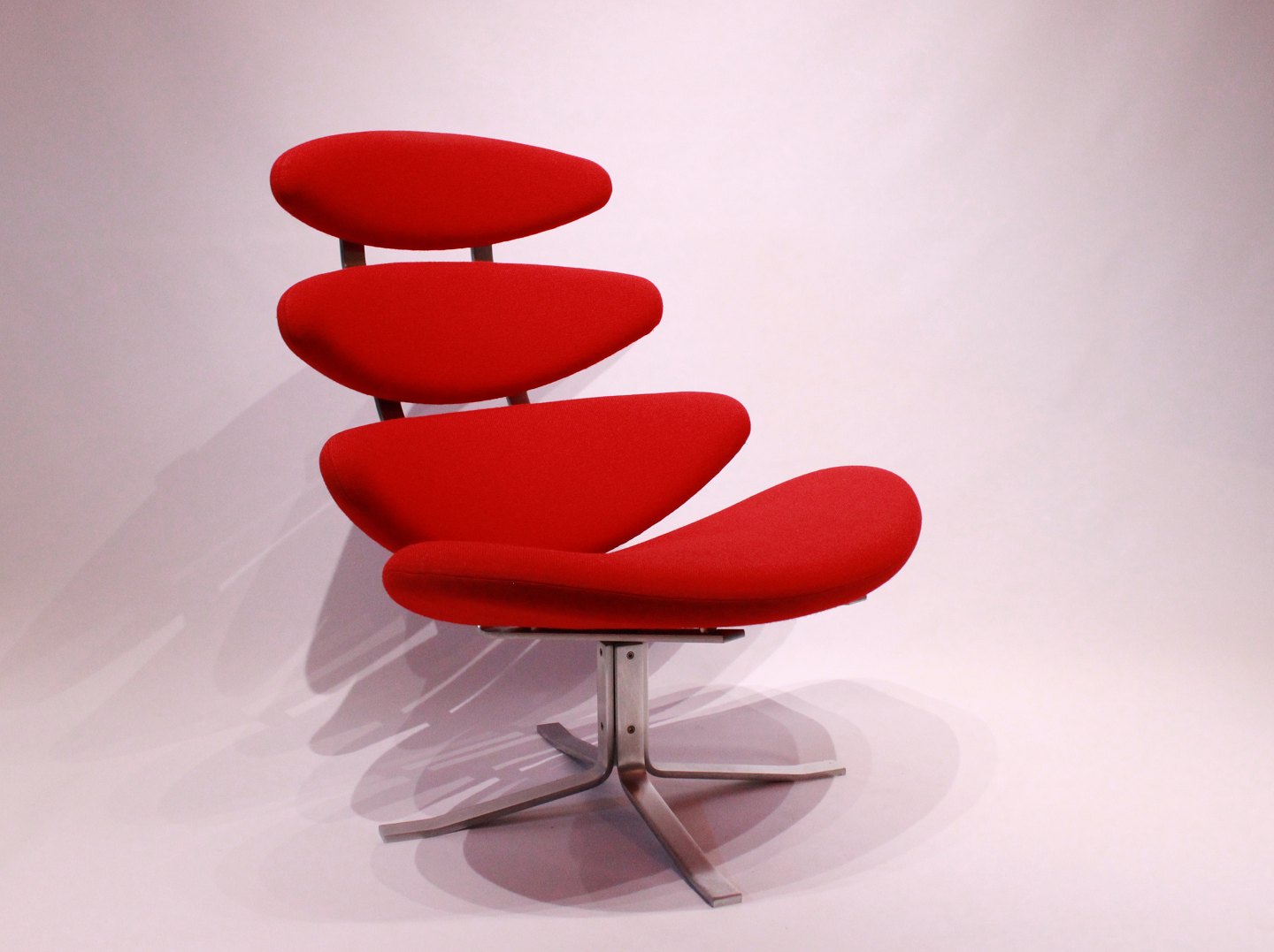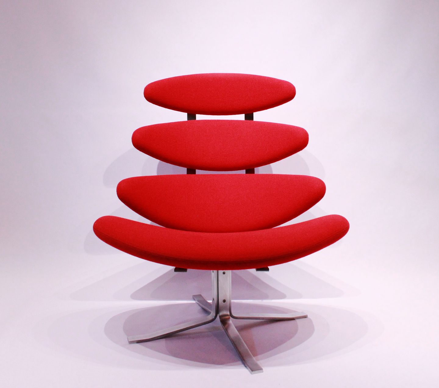 SolgtCorona, model EJ 5, designet af Poul M. Volther i 1964 og fremstillet hos Erik Jørgensen. Stolen er polstret med rødt uldstof.