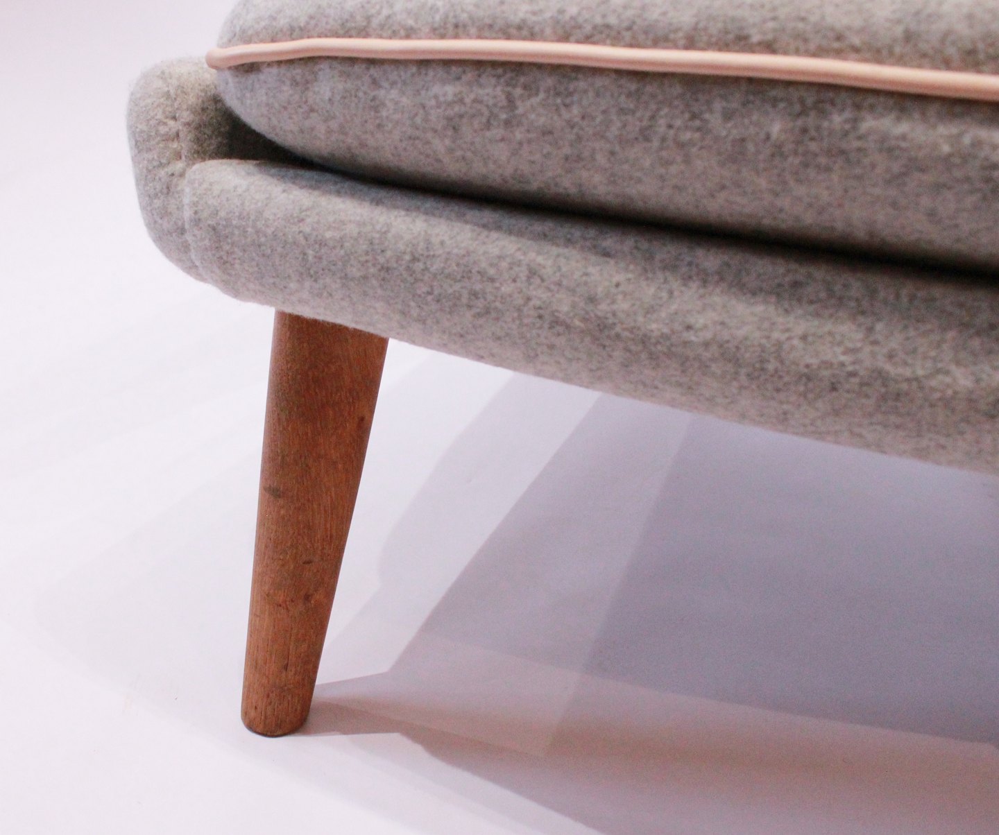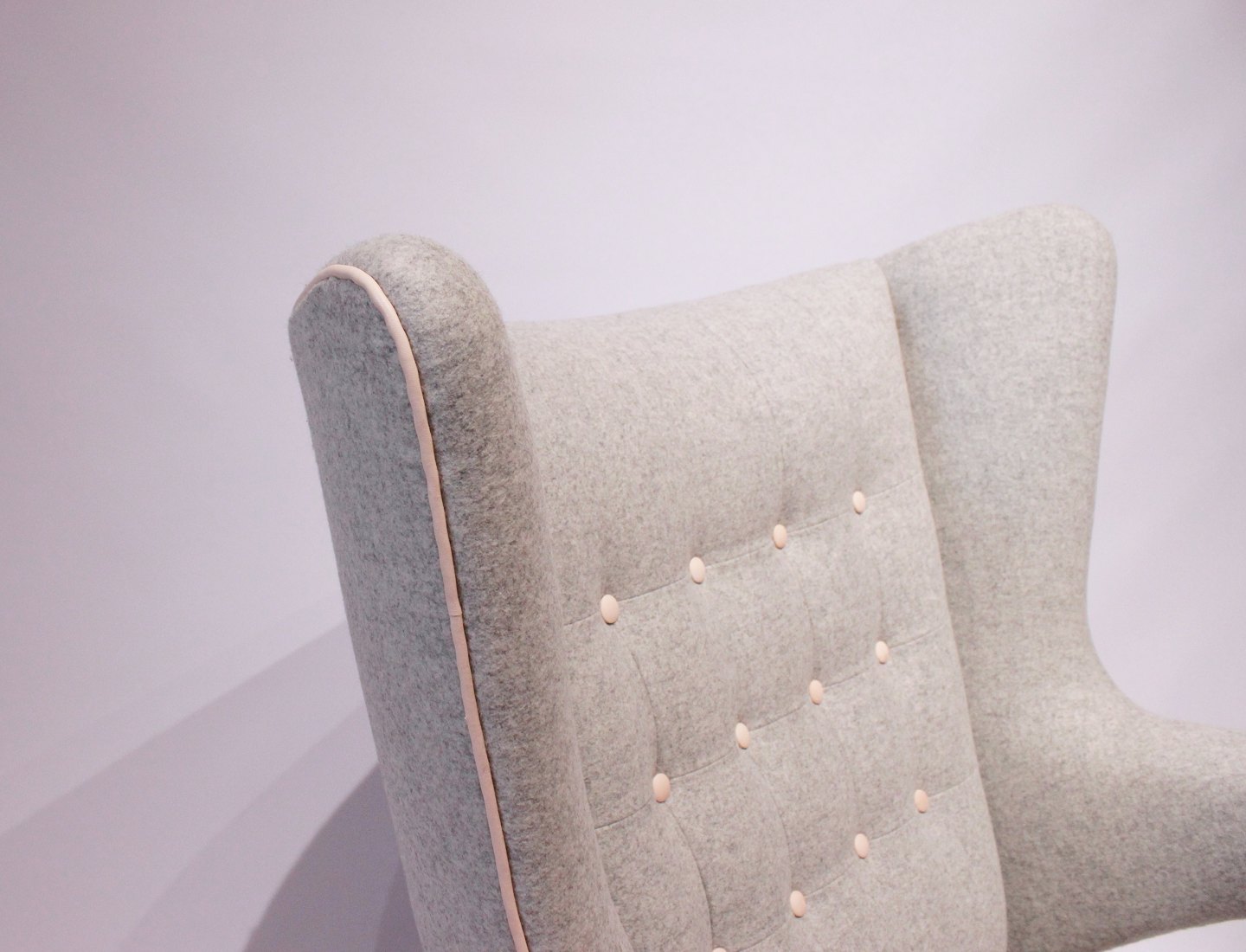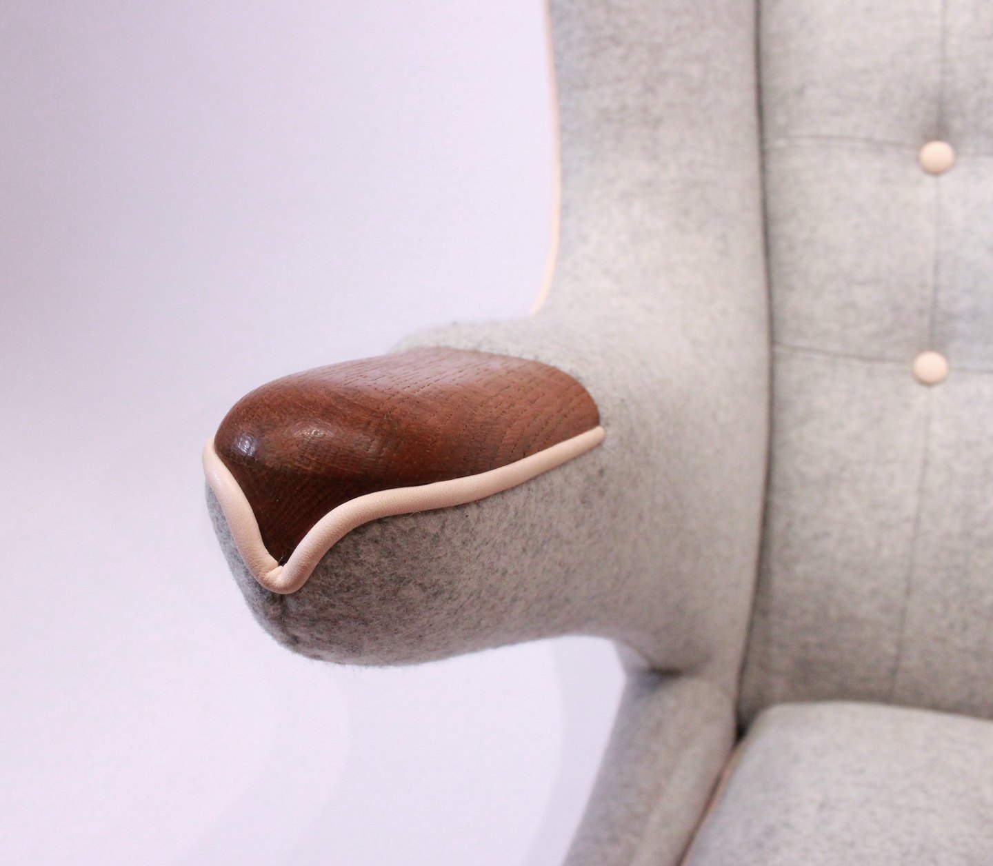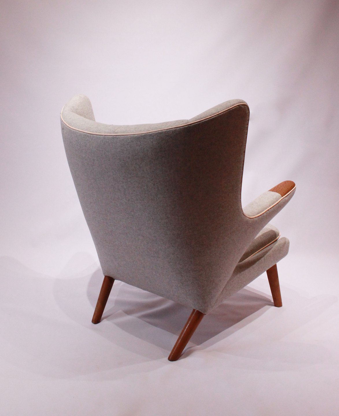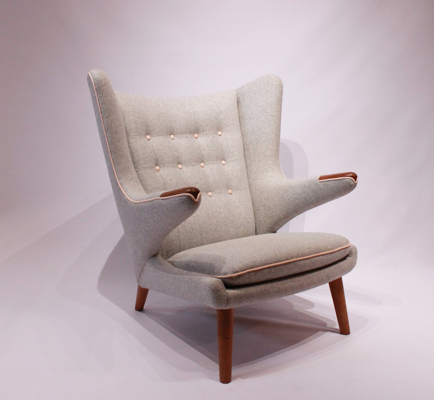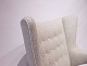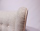 SolgtBamsestol, Model AP 19, designet af Hans J. Wegner i 1951 og produceret af A.P. Møbler. Stolen er nypolstret med lyst uldstof, knapper af naturlæder og ben og "poter" er af eg.