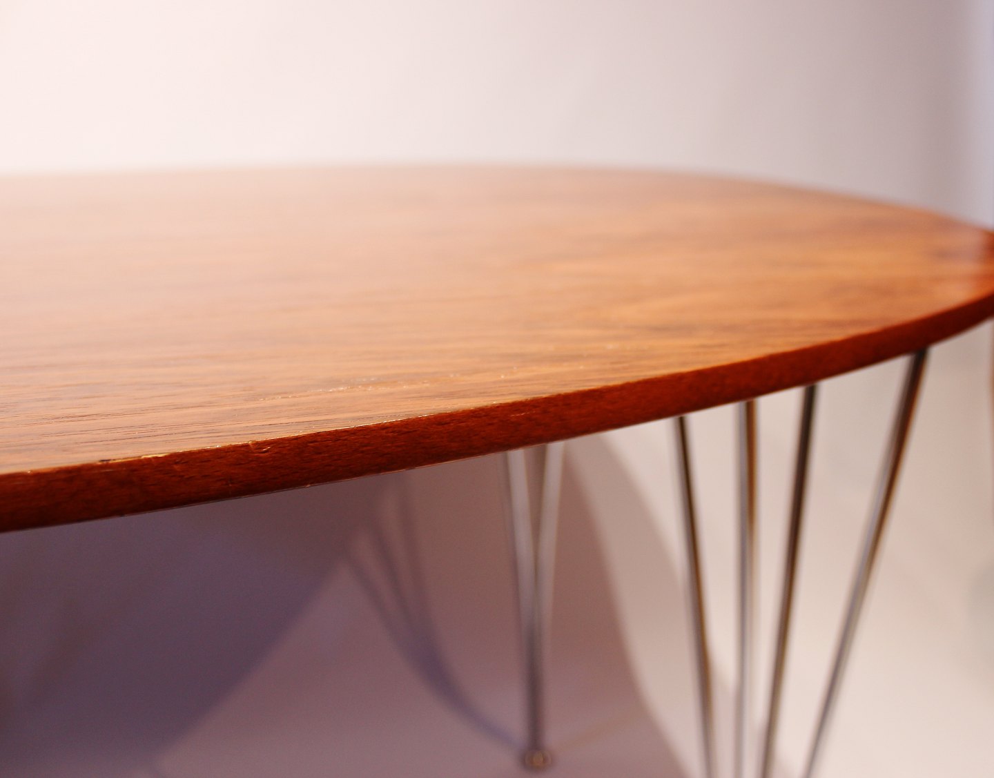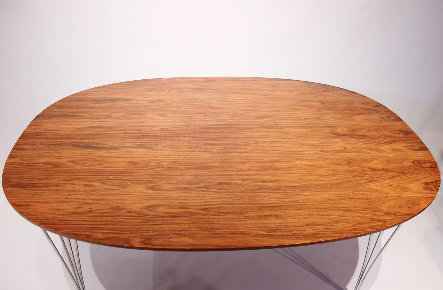 SoldSuper Ellipse table in rosewood designed by Piet Hein, Arne Jacobsen and Bruno Mathsson in 1968 and manufactured by Fritz Hansen in 1983. The table is in great vintage condition and with legs of chrome.