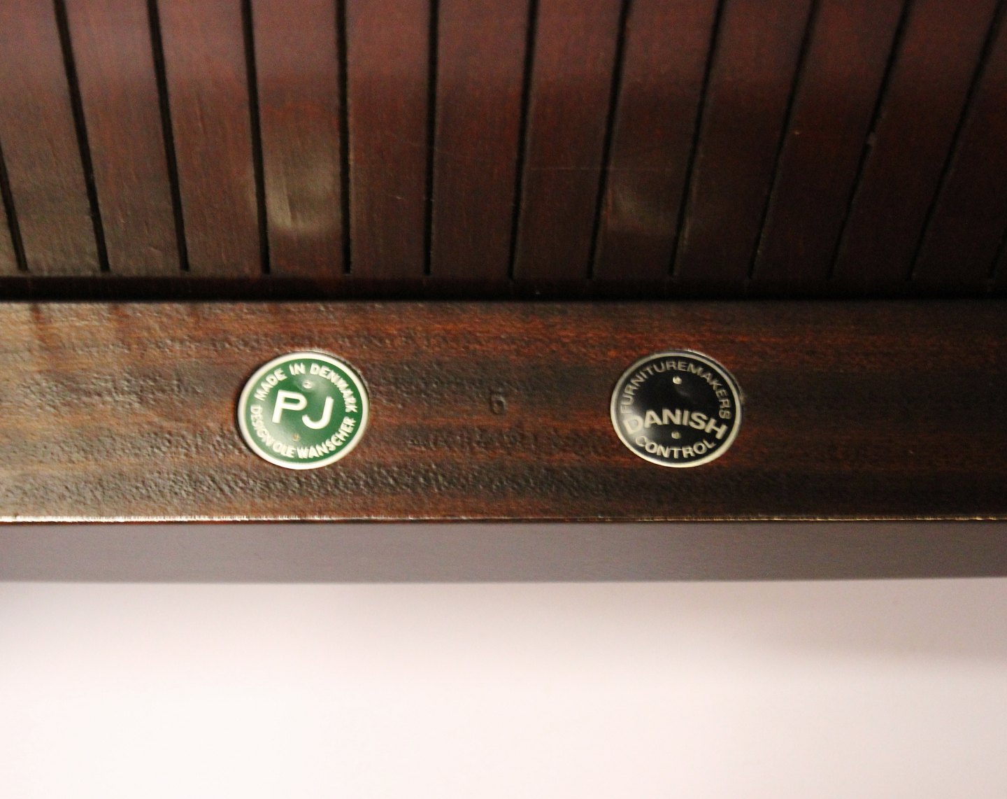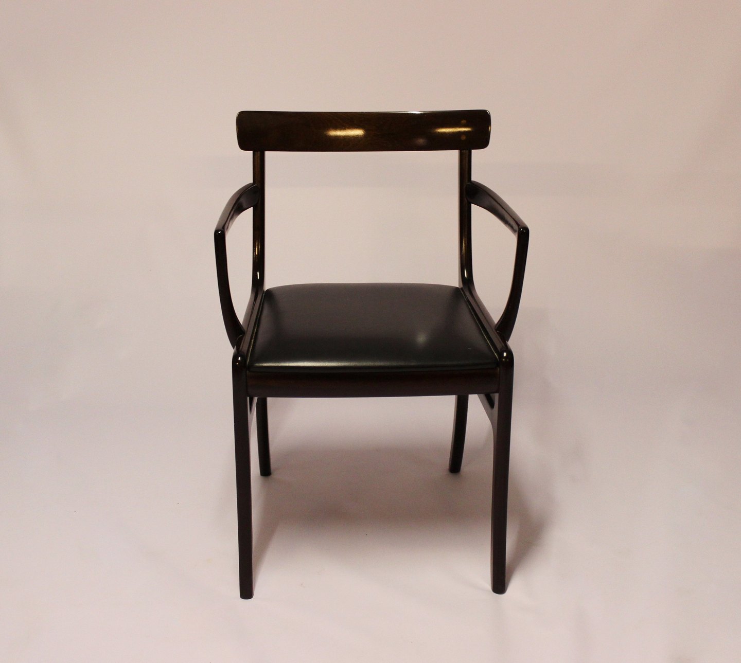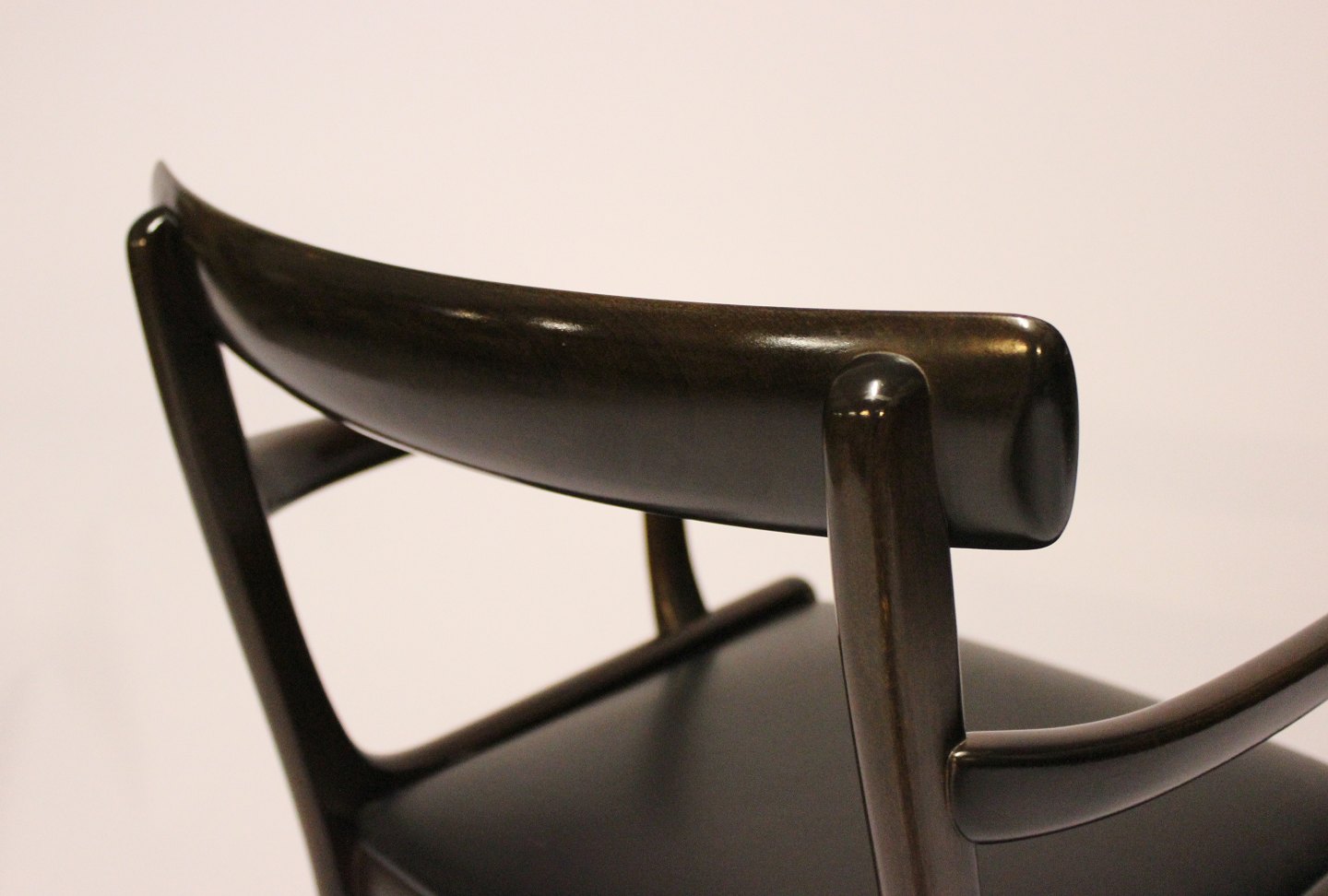 SoldA pair of "Rungstedlund" armchairs in mahogany and uppolstered in black leather, designed by Ole Wanscher and manufactured by P. Jeppesen.