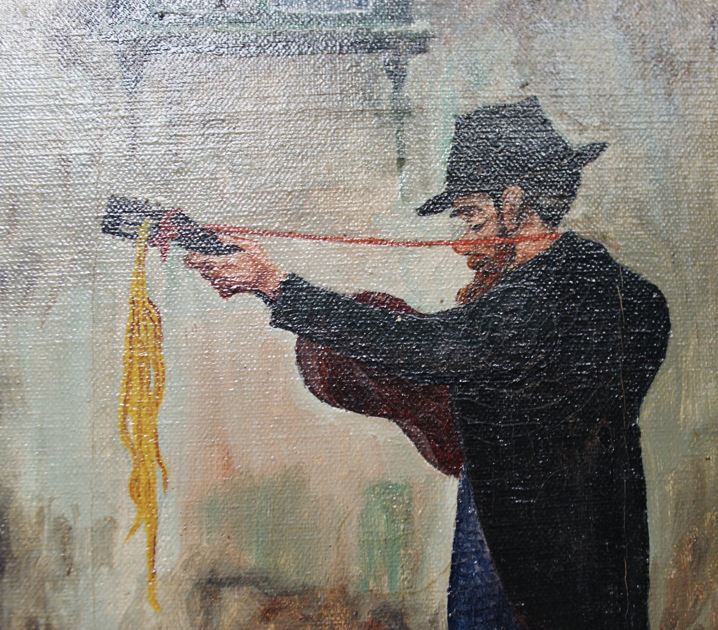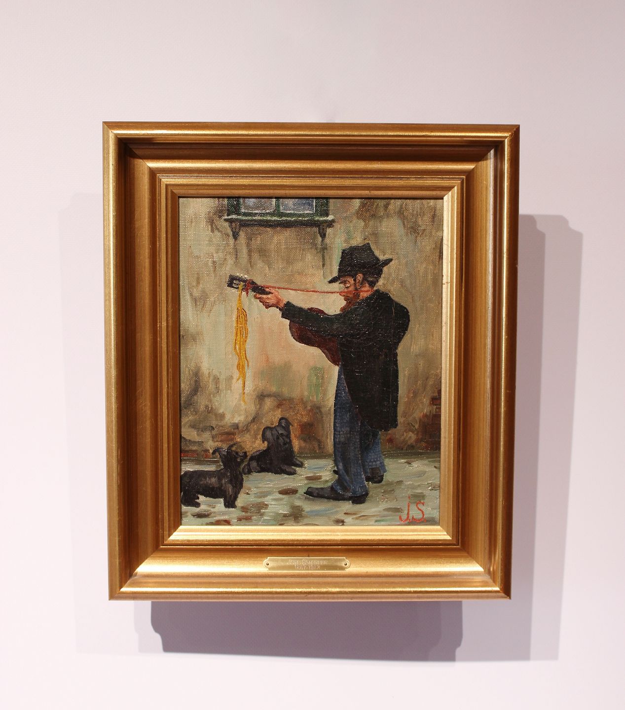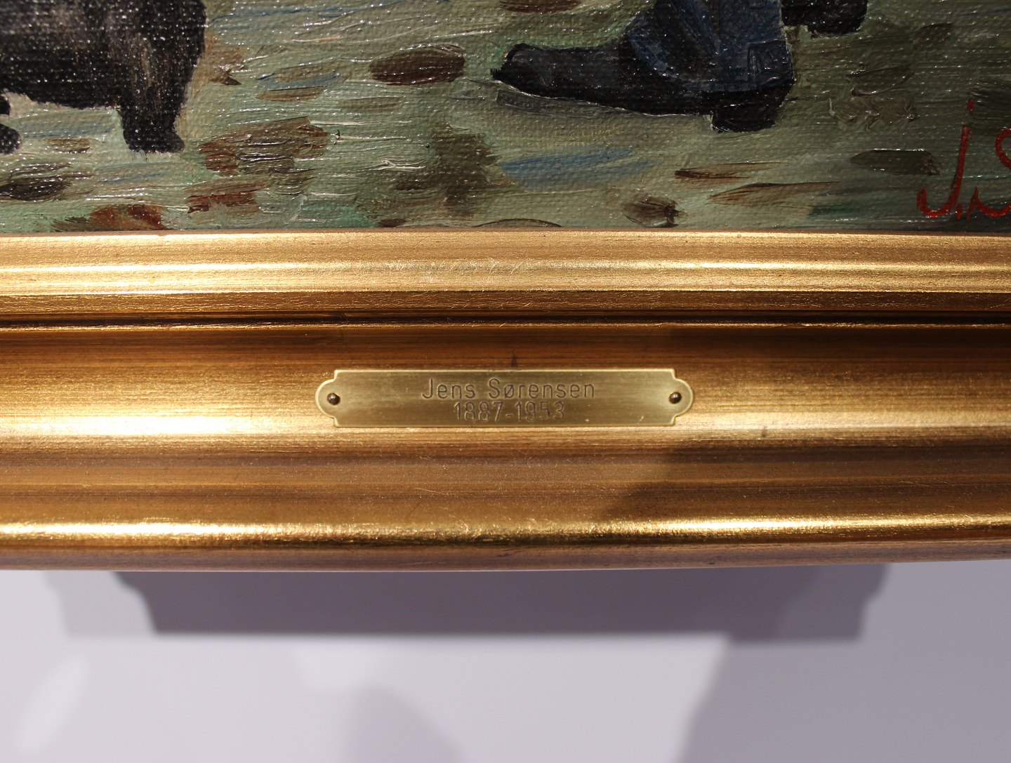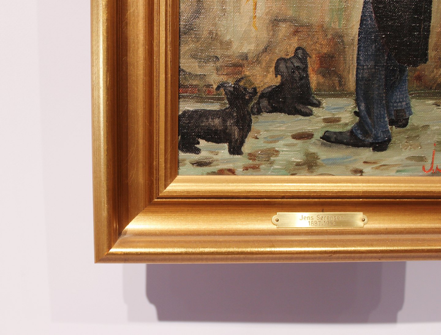 SolgtEn lille oliemaleri af mand med to hunde. Maleriet er af den danske kunstner Jens Sørensen, som levede fra 1887-1953.