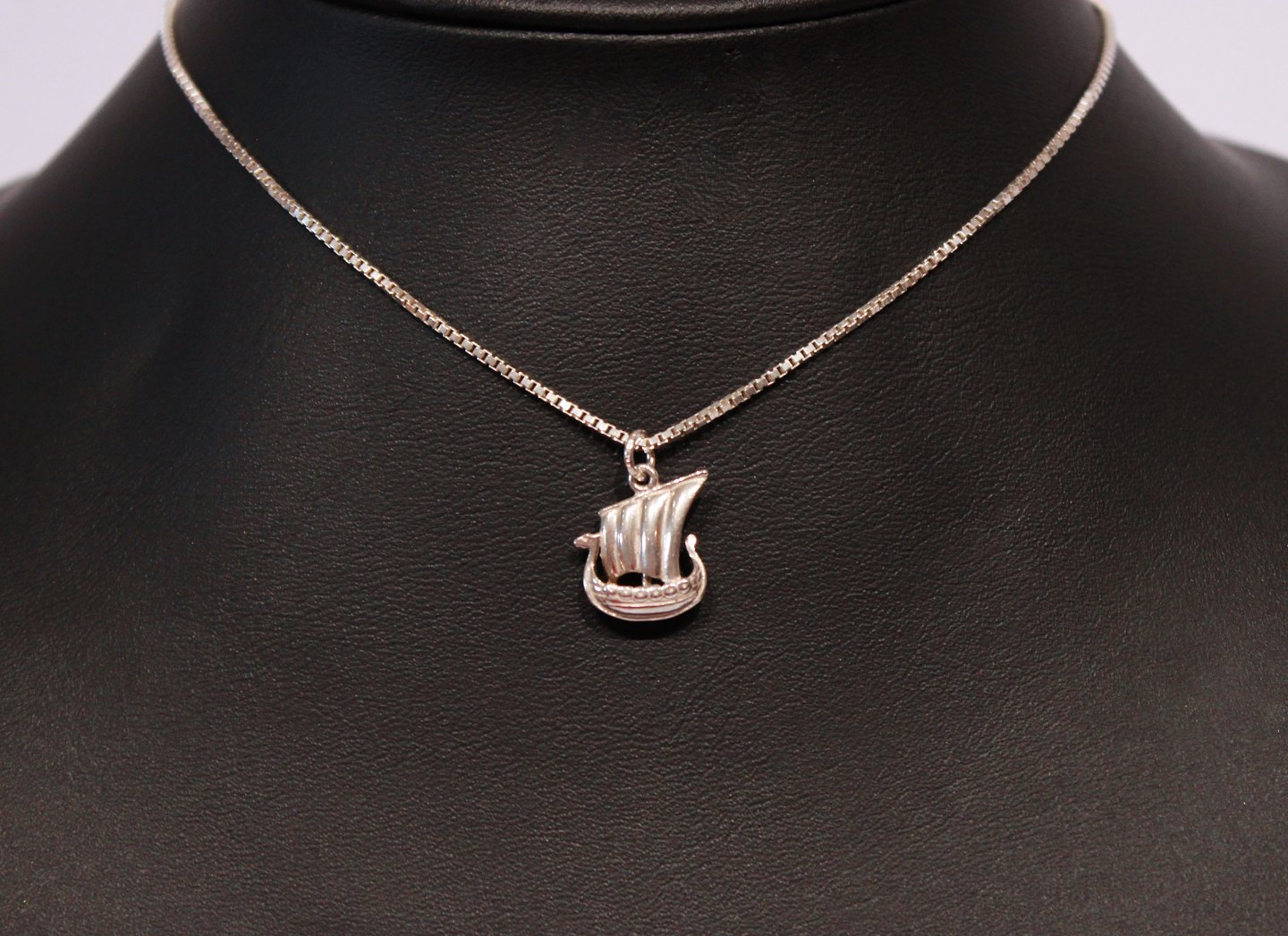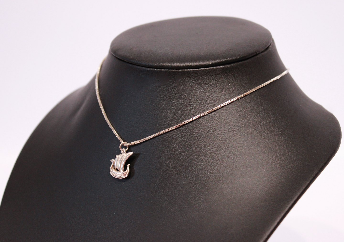 SolgtLille vedhæng i form af vikingeskib i sølv. Lignende kæde kan tilkøbes separat.