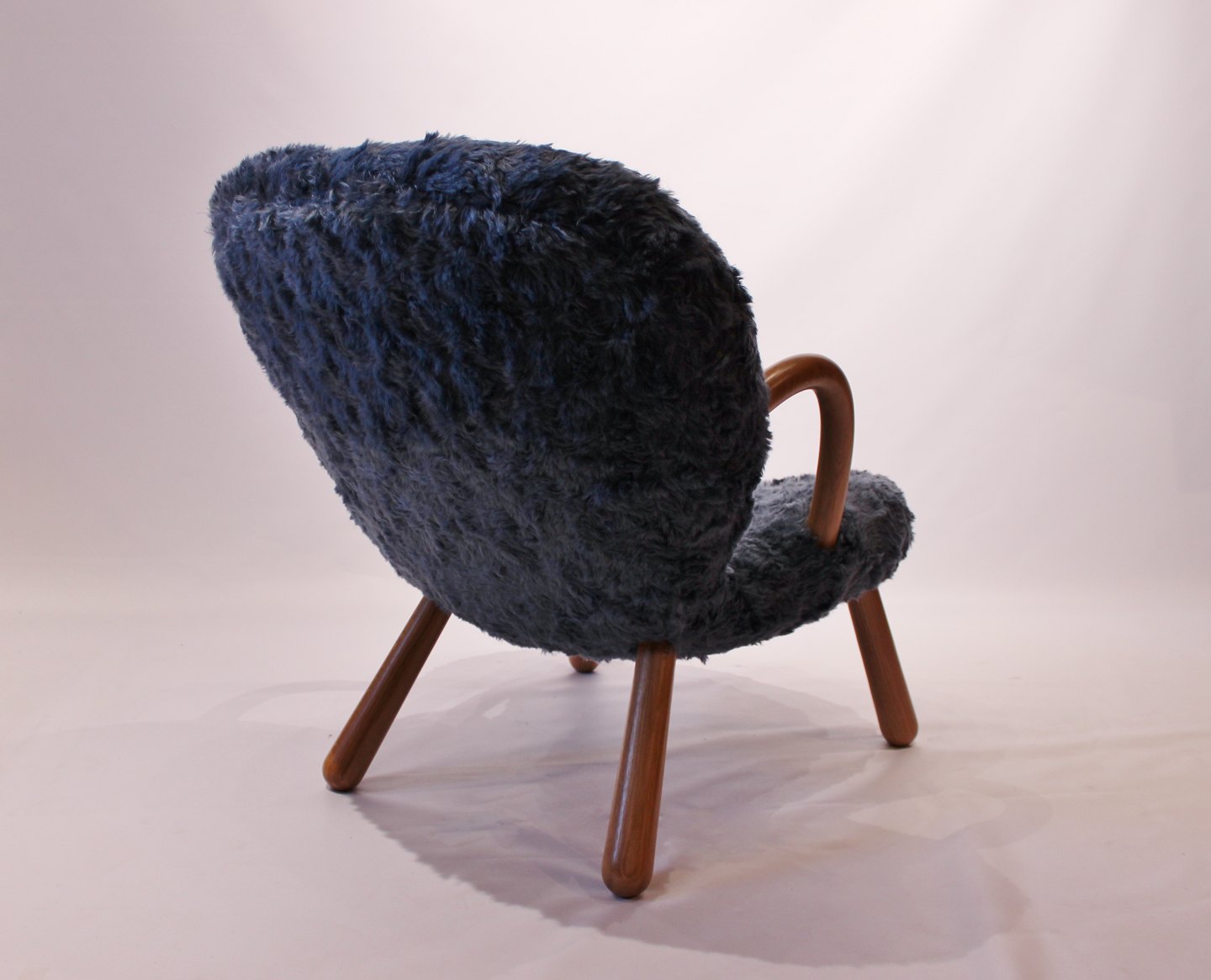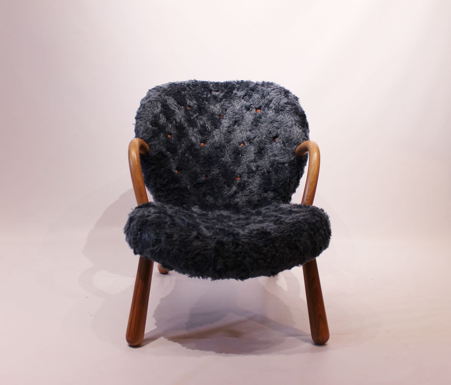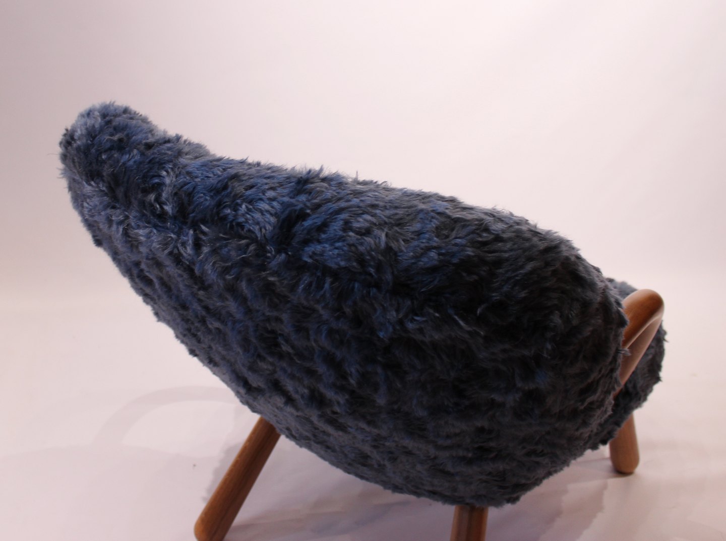 Sold"The Clam Chair" originally designed by Phillip Arctander in 1944 and manufactured by Paustian in 2016. The chair is upholstered in dark blue sheep skin and with amrs and legs og oak.