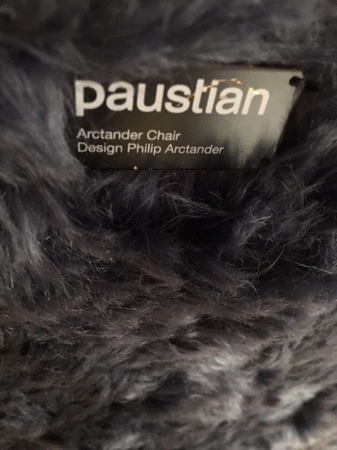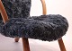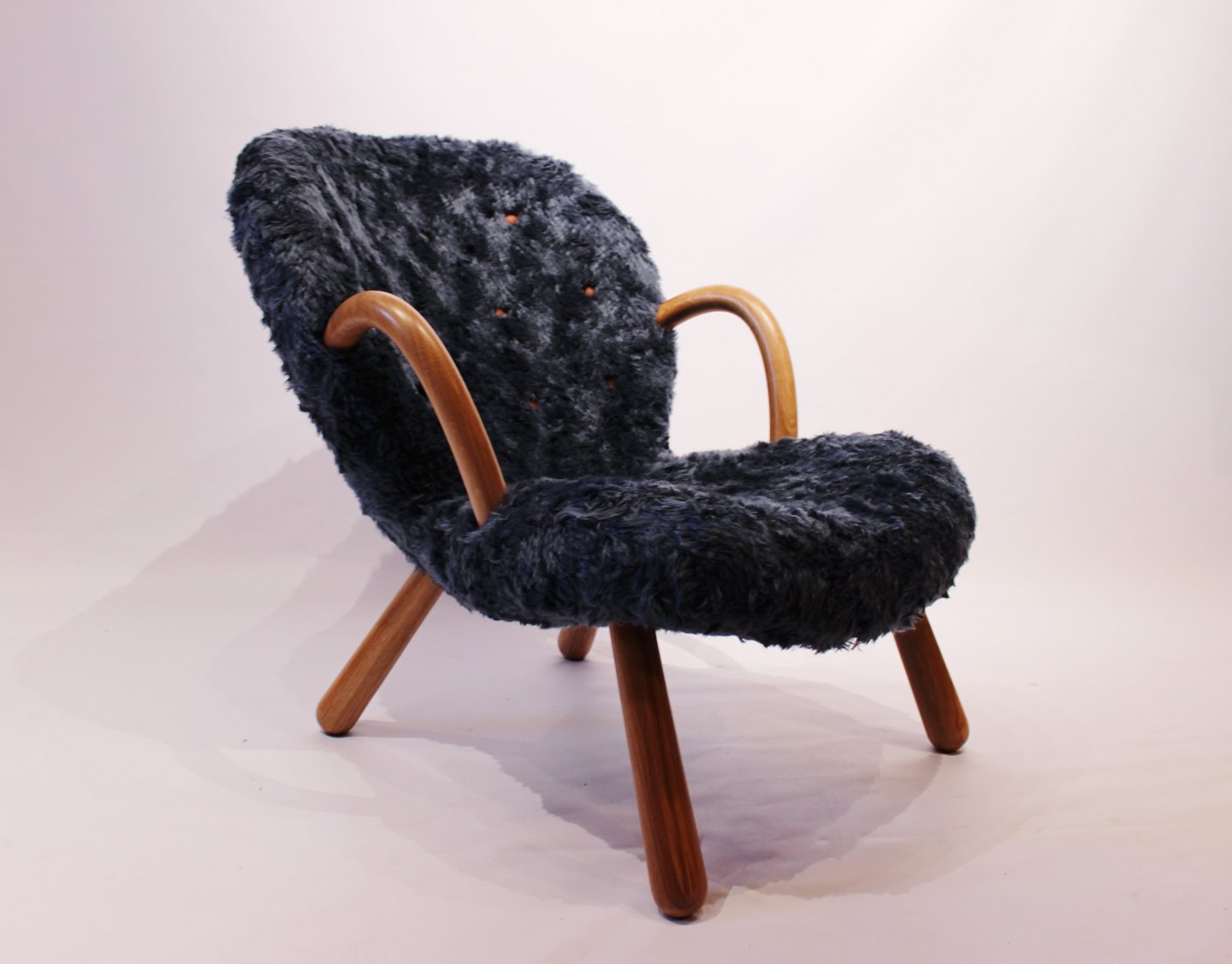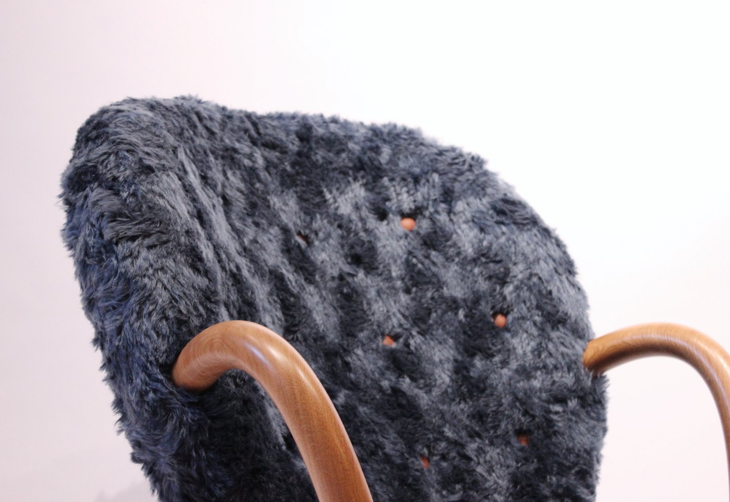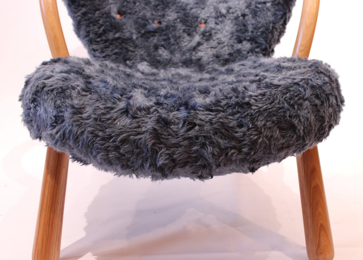 Sold"The Clam Chair" originally designed by Phillip Arctander in 1944 and manufactured by Paustian in 2016. The chair is upholstered in dark blue sheep skin and with amrs and legs og oak.