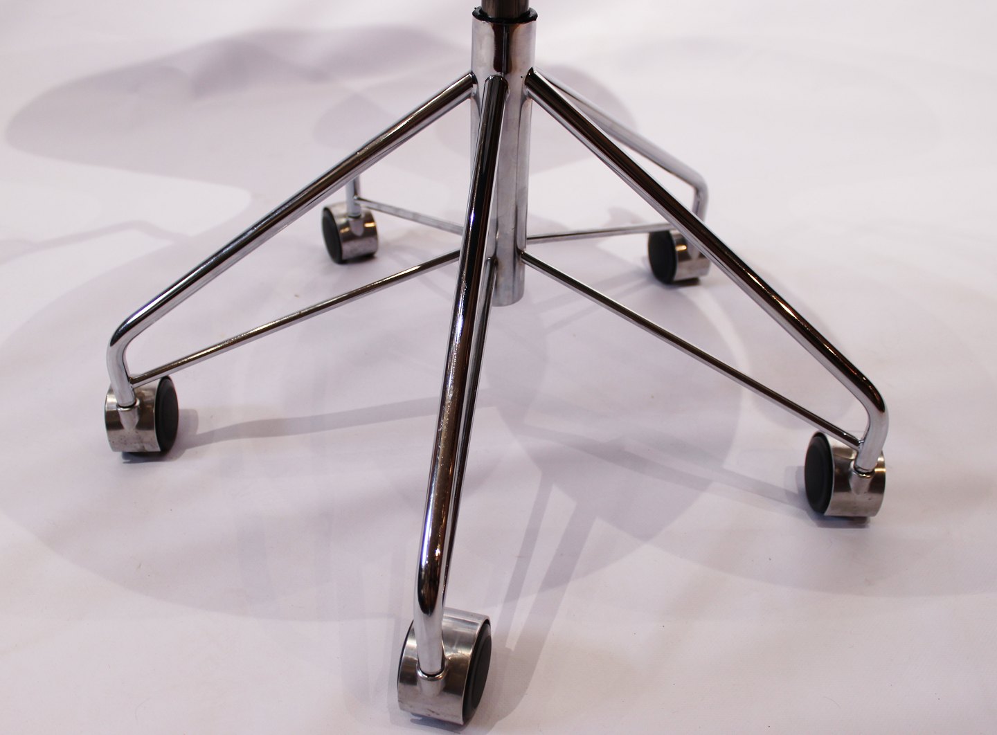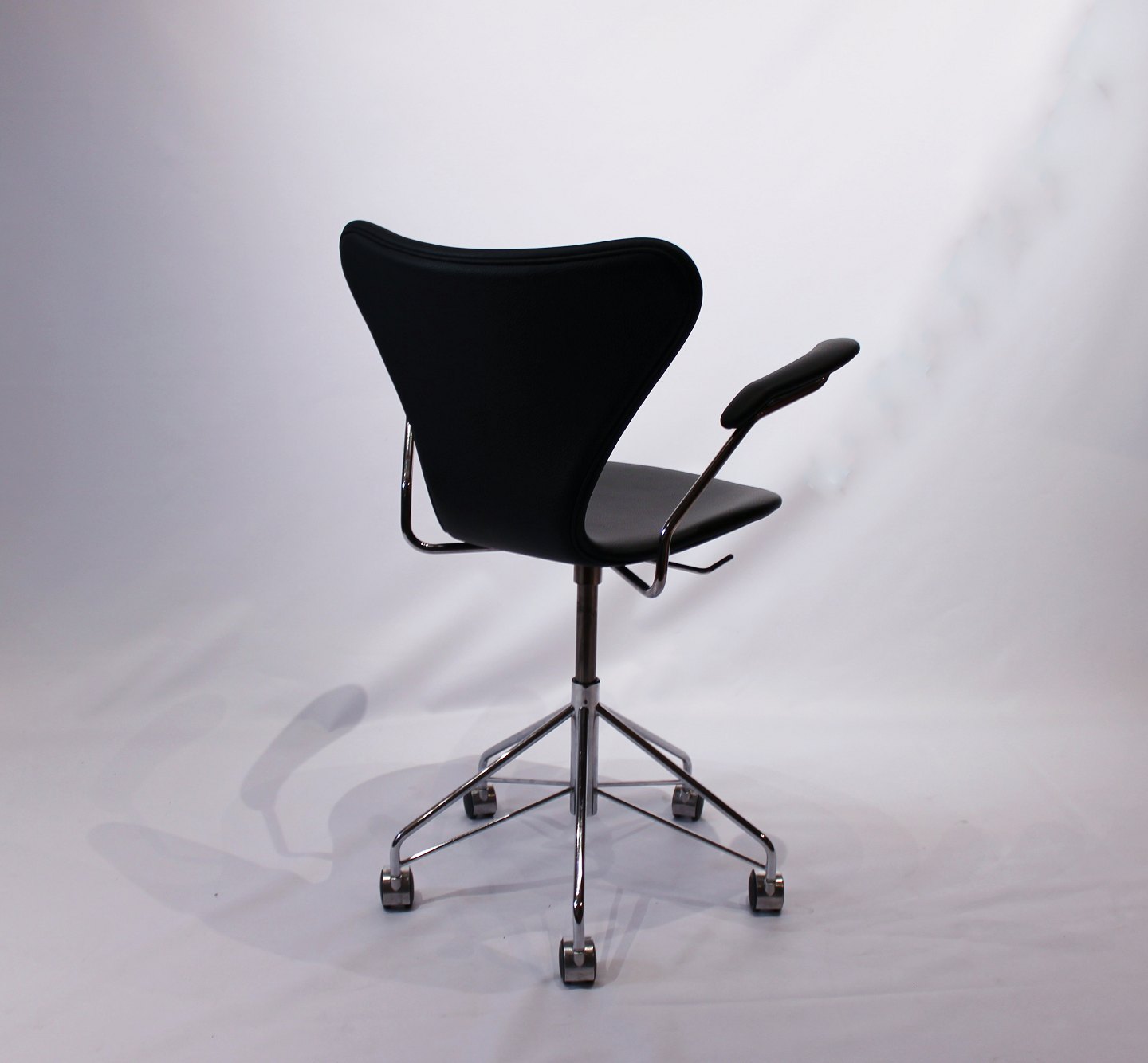 Solgt7'er kontorstol, model 3217, med armlæn og drejefunktion i sort læder designet af Arne Jacobsen i 1950erne og fremstillet af Fritz Hansen.