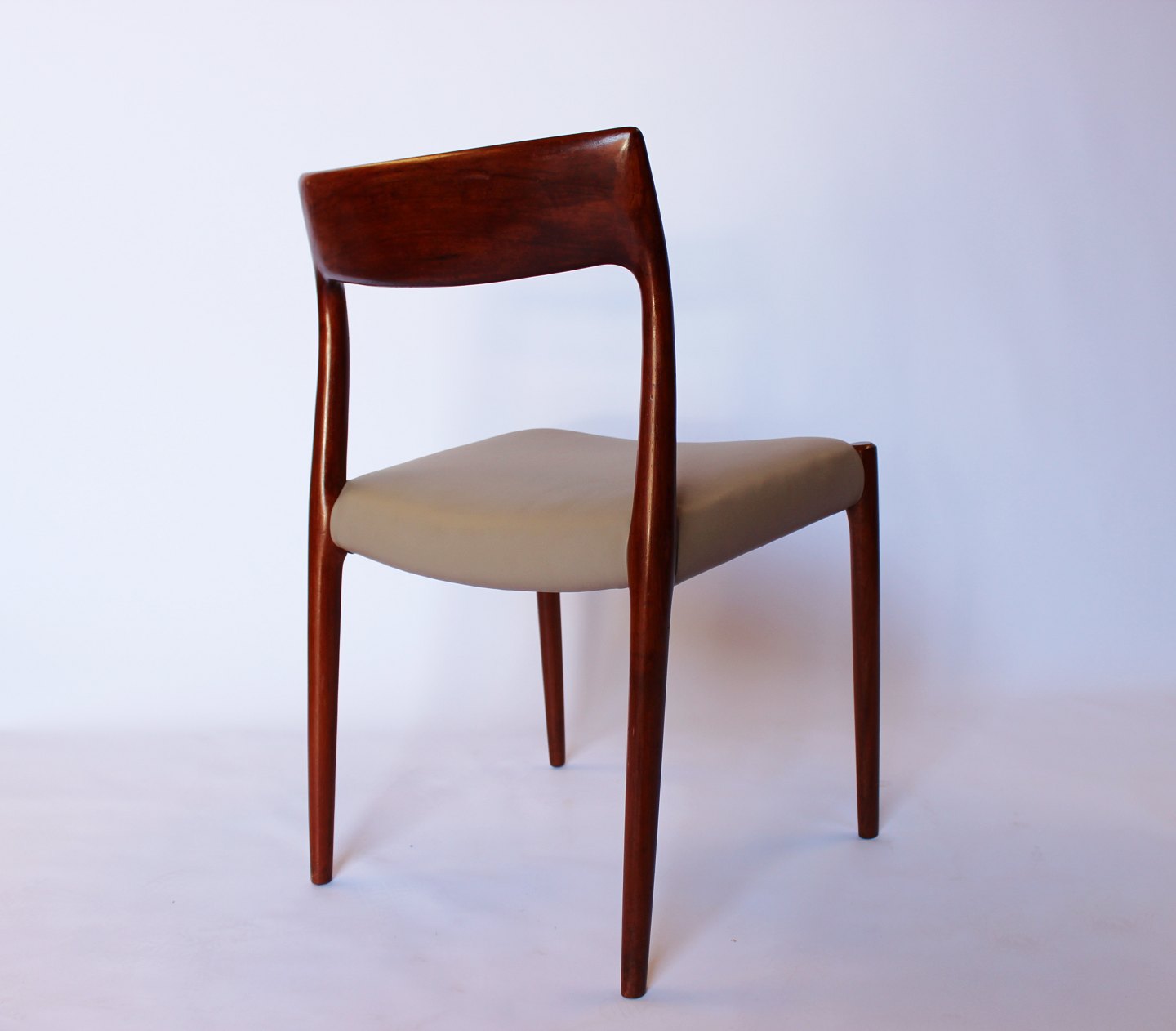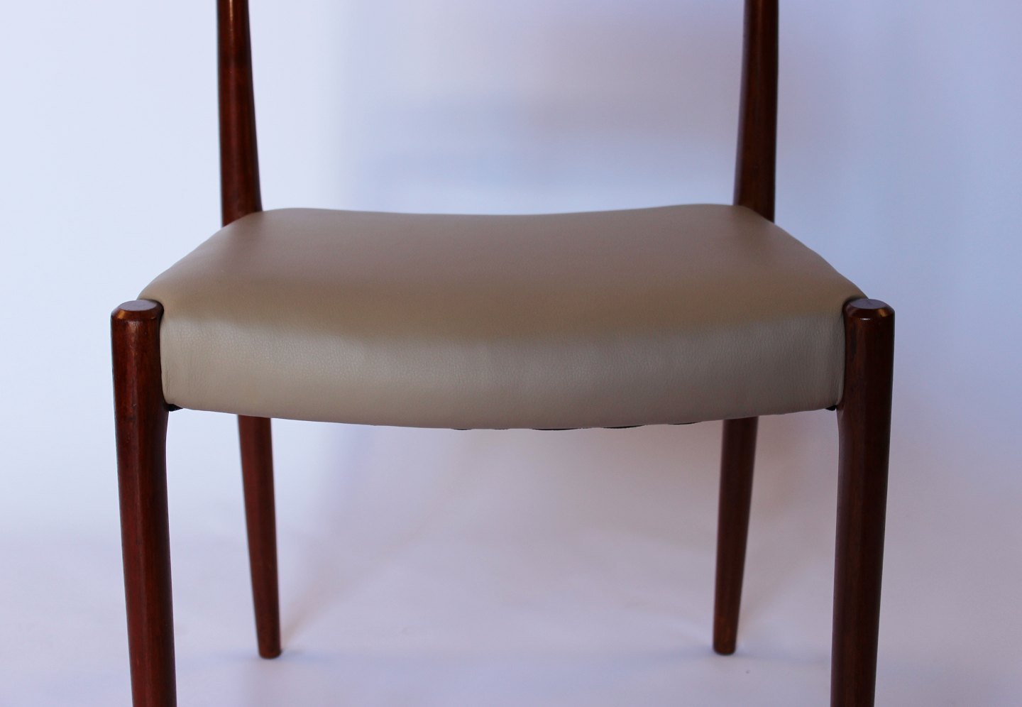 SoldSet of 6 dining chairs, model 77, in teak and light grey leather designed by N.O. Møller and manufactured by J.L. Møller furniture factory in the 1960s.