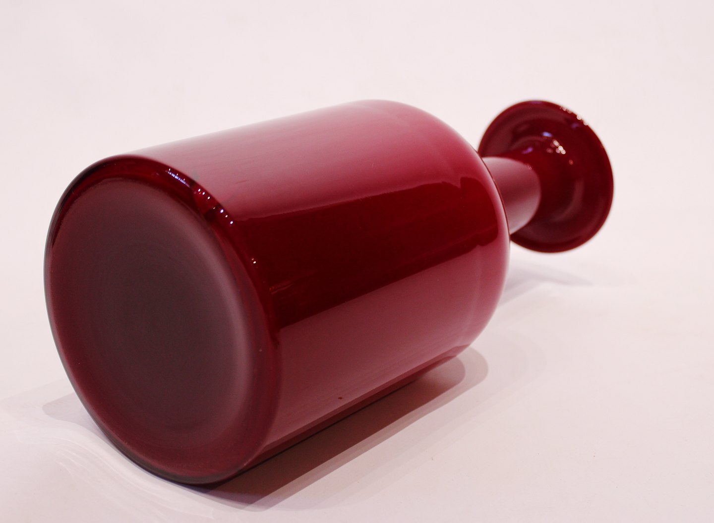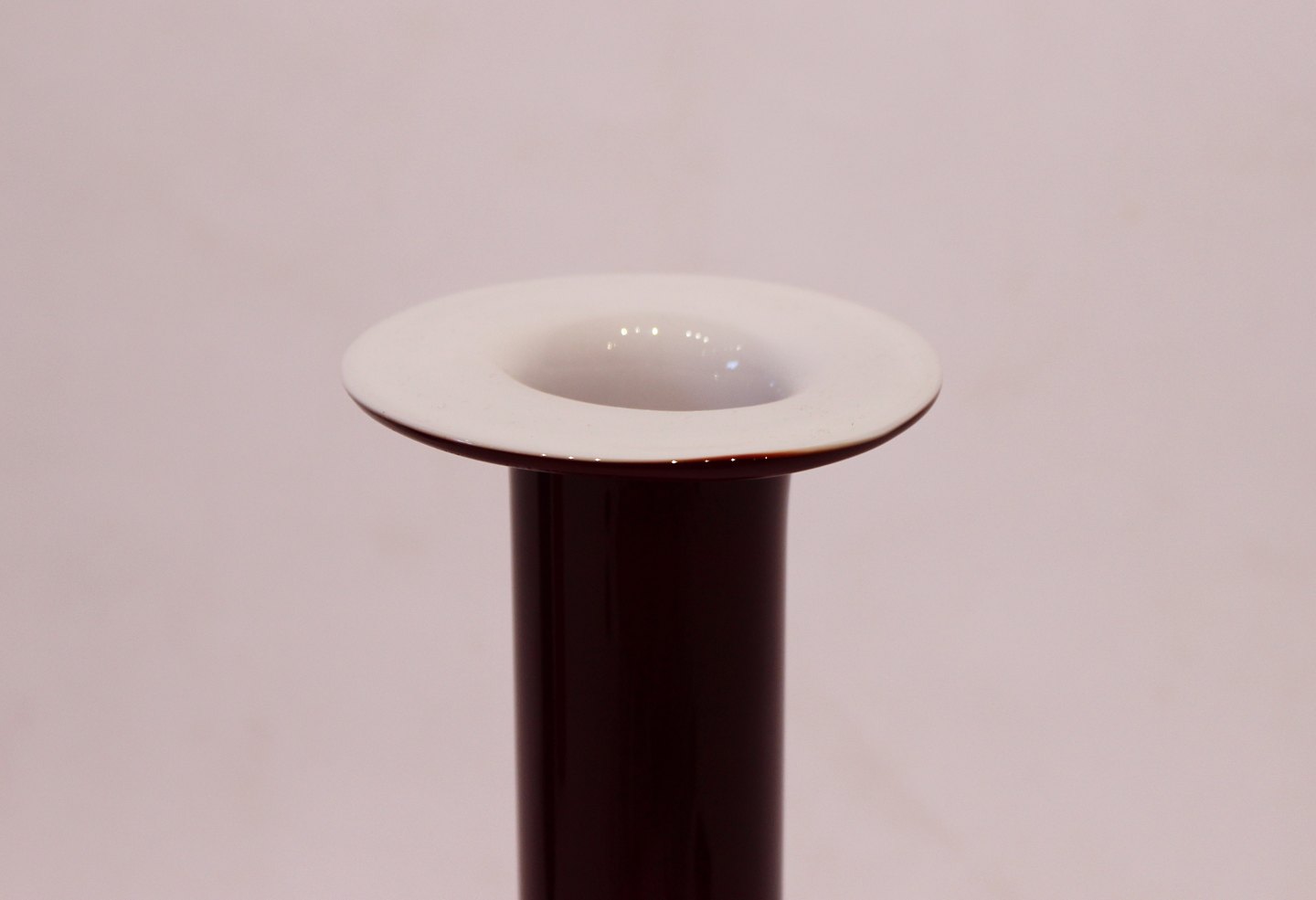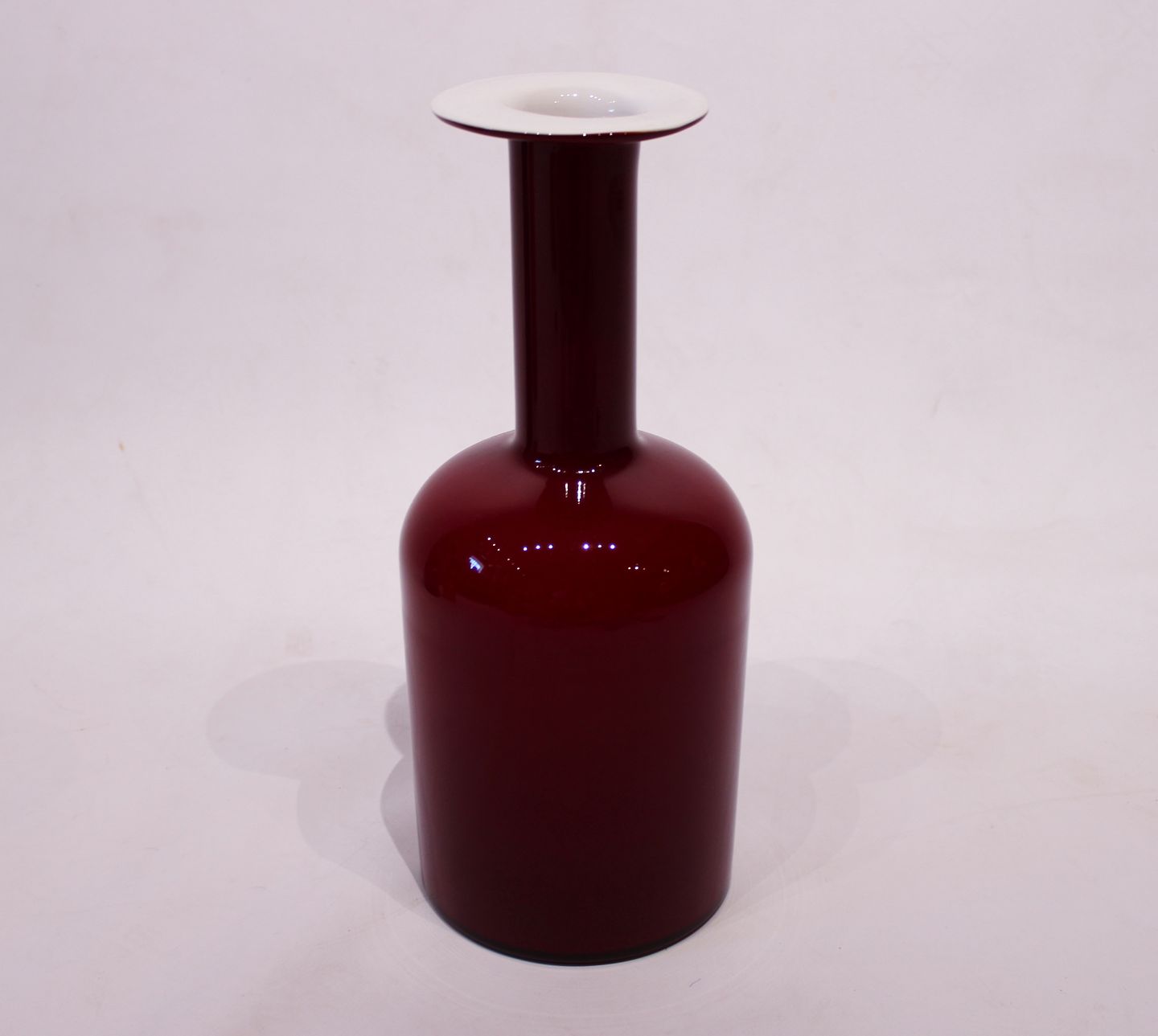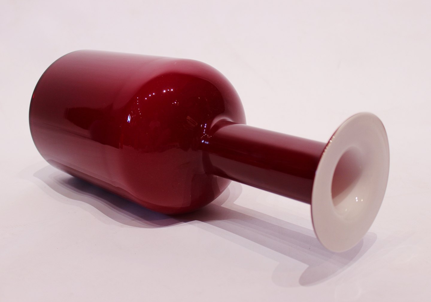 SolgtStor bordeaux glas vase med hvid opal glas indvendig af Otto Brauer for Holmegaard.